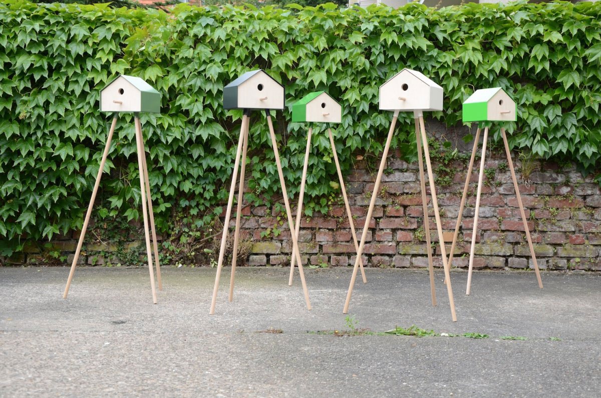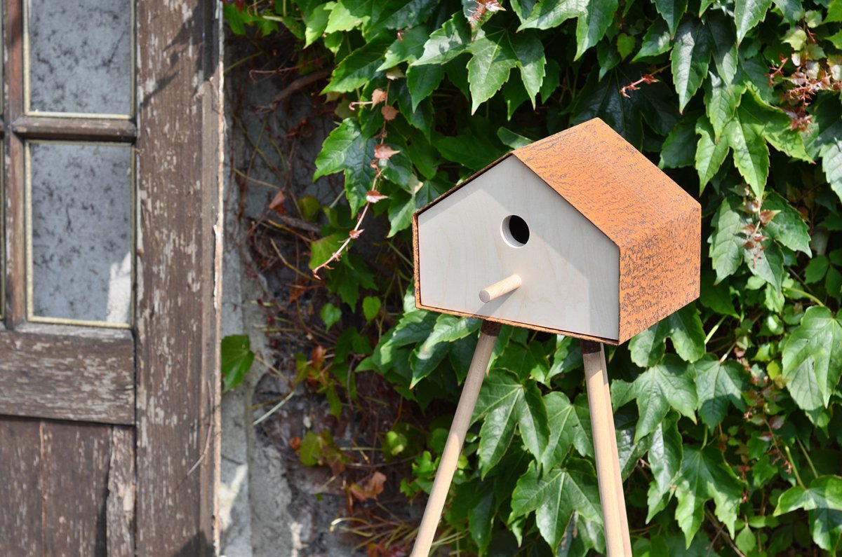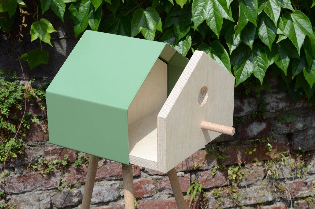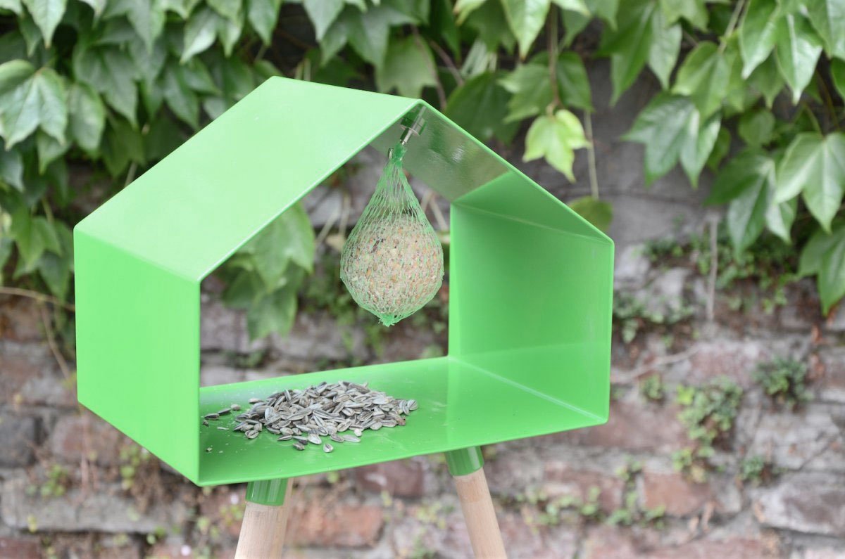 The Surfin Bird house stands proudly on stilt bird legs. Made with the needs of feather foe in mind, the enclosed piece slides out to accommodate their primary focus whether nesting or feeding. When the eggs have hatched and all the babies have left their mother, easily pull out the house part to clean it for the next tenant. In the meantime, attach the food bearer by magnets to the inside of the metal roof for a covered feeder. Available in five calming colors to adorn your lawn, also available in plain steel. Designed by Dreikant.
