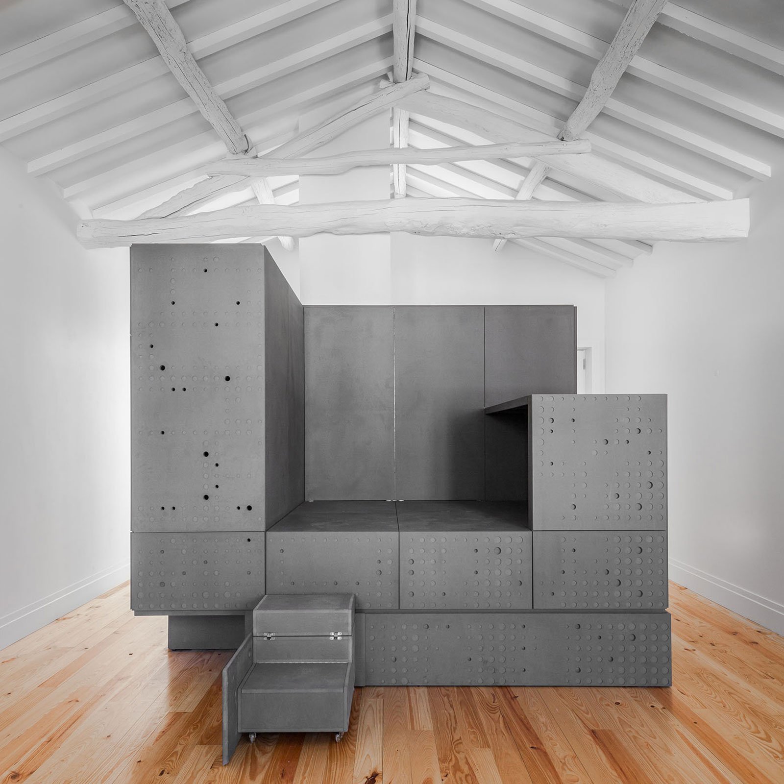 Interior boxes aren’t just for swanky private homes. Here, you can see them reimagined as sustainable housing units that turn empty rooms into fully-functional apartments. Created by the Portuguese architecture studio OODA, the freestanding units serve as a bathroom, a bedroom, a kitchen, an office, and a storage area.