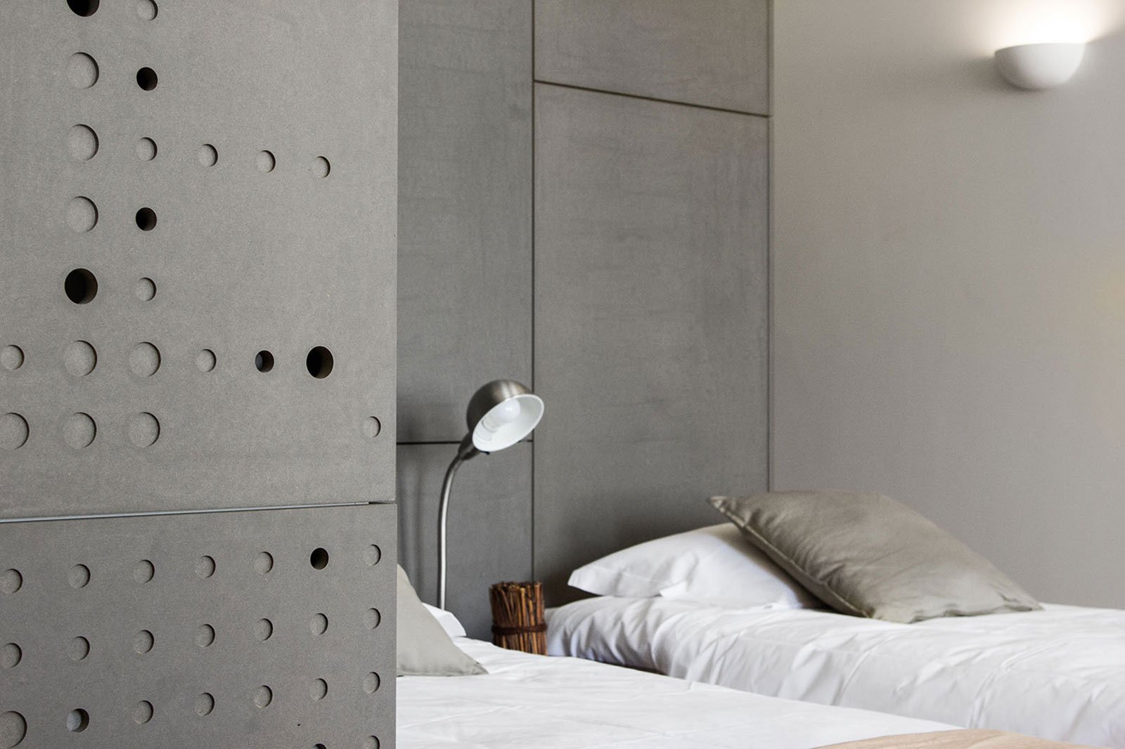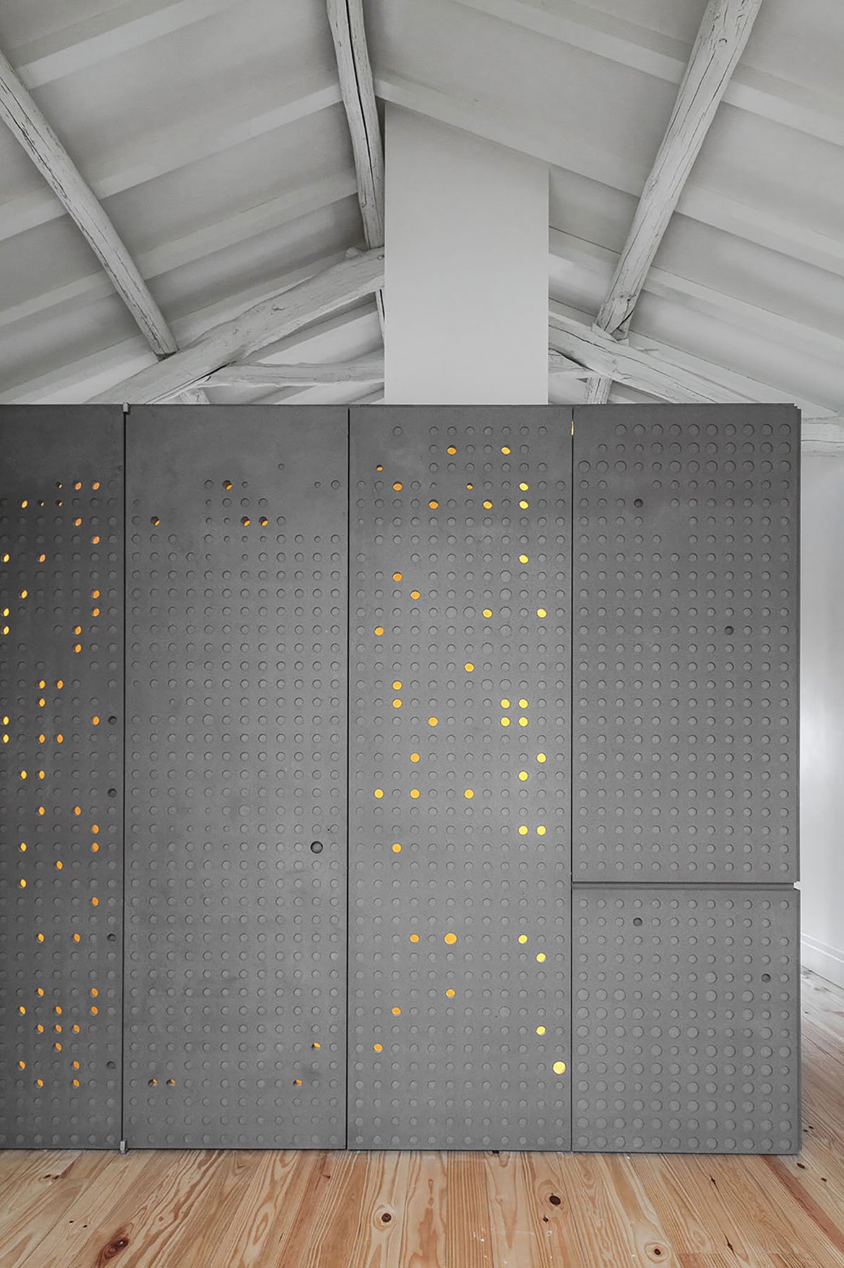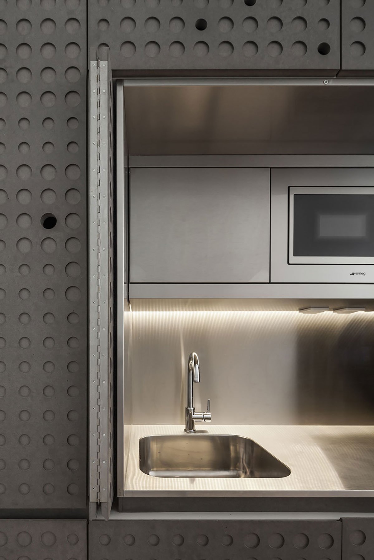 Each space features one of the multi-volume units. Strong yet not overly industrial, the structure is made of steel, reinforced with cement fiber board and fiberglass panels, and decorated with perforated Valchromat representing classical artwork. Moreover, each unit has its own shape, color, and pattern, making this design as individual as it is eco-friendly and budget-wise.