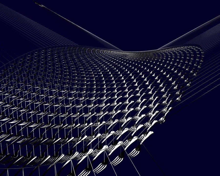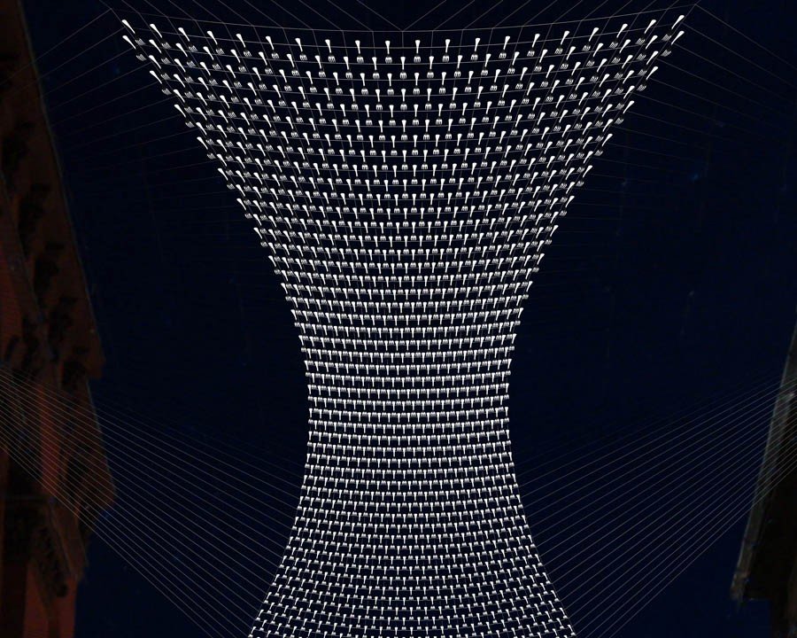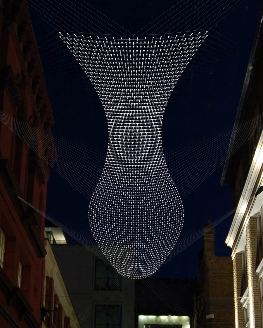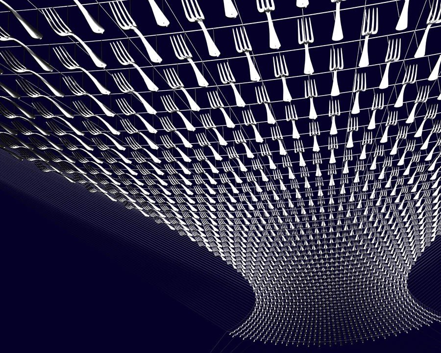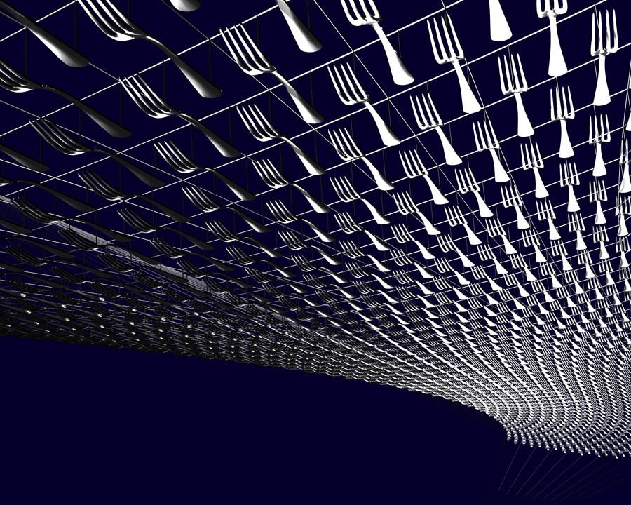 You ever get the feeling that the ocean looks exactly like the sky? Whenever I look upon the vast surface of the ocean blue, there’s always a point where the water and the sky meet. Designer Ian McChesney lets us dive into the sky and experience the scaly union of  a school of fish in his innovative project called “Swimmy.” This woven sculpture is suspended over the entrance to Heddon Street in central London. It is made up of over 1,000 forks organized in the shape of a fish. It’s held up by a multitude of fine cables that gives the illusion of a floating form over the street. It was inspired by the classic children’s book Swimmy written by Leo Lionni in 1963. This incredible piece of art makes one feel as though they are experiencing the shiny patterns of  underwater creatures in the sky.