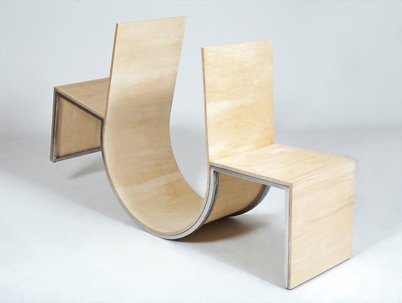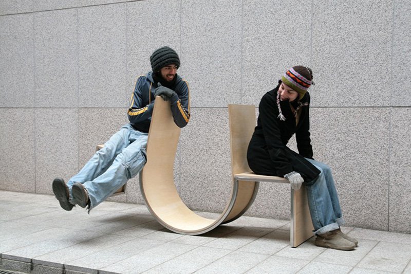 While seesaws might best be suited for the playground, designers Cho Neulhae and Jaebeom Jeong have transposed the seesaw interaction onto a chair for two. Swingers is composed of two wooden chairs facing in opposite directions, but with the backs of each connected in a U-shaped plane. The metal rails at the bottom of the “U” enable the entire configuration to tip one way, and then the other, based on the distribution of weight. The interaction between the two sitters is facilitated by the piece of furniture, and is intended to spark conversations between strangers and encourage playfulness between friends.