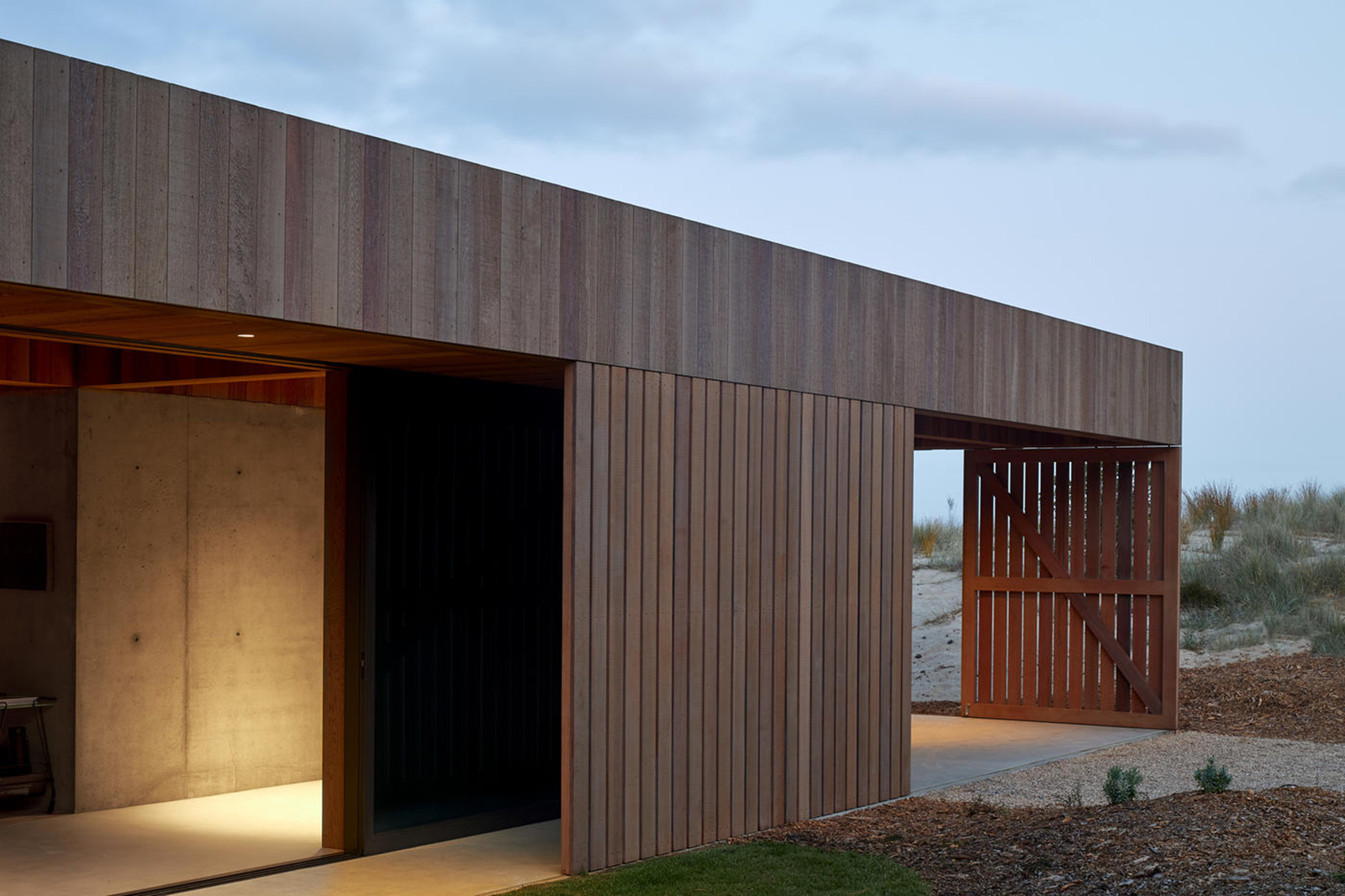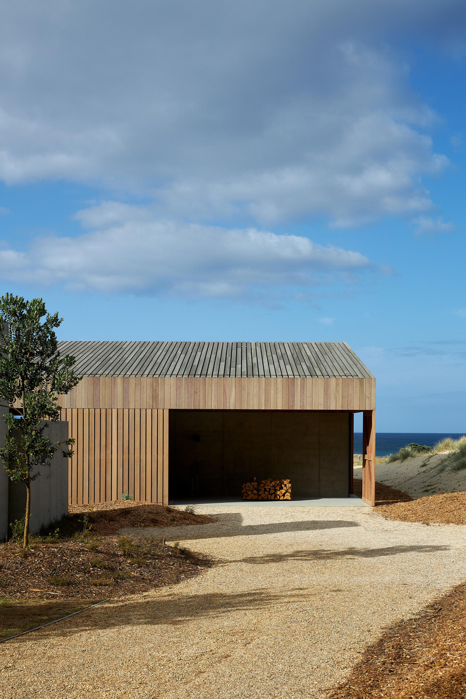 The studio used solid wood throughout the interior, creating a dialogue between the exterior and the living spaces. While the siding has a light color that will turn silver, the interior’s wood surfaces feature an oiled finish. This treatment darkens the wood and highlights the timber’s distinctive textures and natural color variations. Flat and sloping ceilings create both intimate and airy spaces. The architects collaborated with interior designer Sonja Hawkins on this project. Concrete volumes, minimalist lighting, and metal accents give a subtle industrial edge to the rustic wood. In the living room, stone tables that resemble sculptures complement a wicker basket, a cozy leather sofa, and a large artwork. On the patio, there’s an outdoor fire place, lounge chairs, and a concrete bench. Photographs© Simon Wilson.
