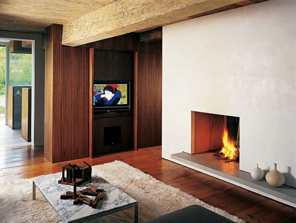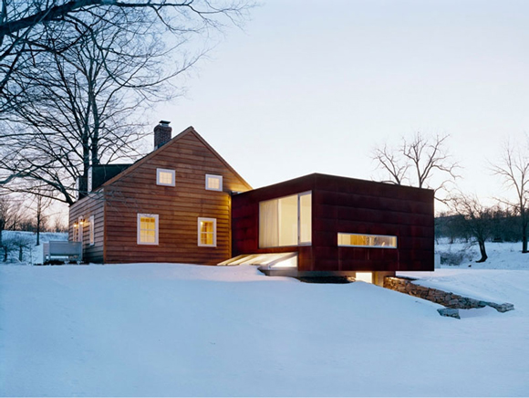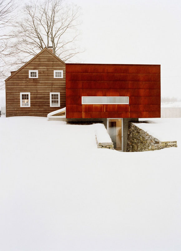 With only one rule, of preserving the frame of the house intact, the architects had free reign over the design process. Various partitions and additions were removed, revealing a simple, spacious interior. The fenestration was carefully maintained and one original sash window was used as a template to make the rest of the windows, rejuvenating the 18th century appearance of the structure. The extension’s rectilinear shape is striking and modern, perfectly complementing the traditional form of the main house. The exterior walls are clad in CorTen steel that will rust and darken over time, matching the cedar siding beautifully. The interiors have minimal decorations and furniture. Clean lines and a limited color palette of bright white, gray, and rich brown create a welcoming and contemporary space that is full of warmth and brightness. The focal point of the cottage is the large white wall with an integrated fireplace which separates the living room and dining room, while in the extension, the large glass windows that offer stunning views of the landscape. The studio managed to source 18th century flooring from an antique shop, and the wide boards are used throughout the home along with exposed oiled wood, glass, and stainless steel surfaces. In this beautiful yet ordinary apple orchard, a home preserved from the time of Dutch settlers and a contemporary structure create an extraordinary sight, blending old and new in a cohesive design. Images courtesy of Messana O’Rorke.