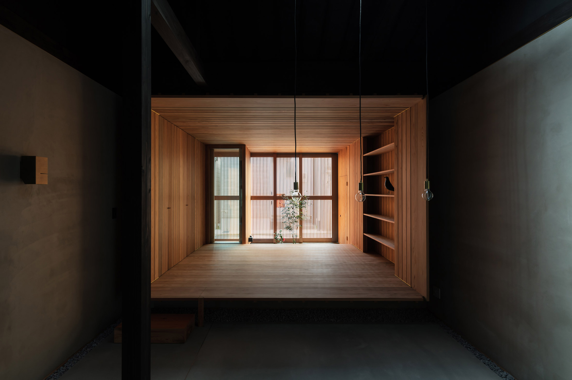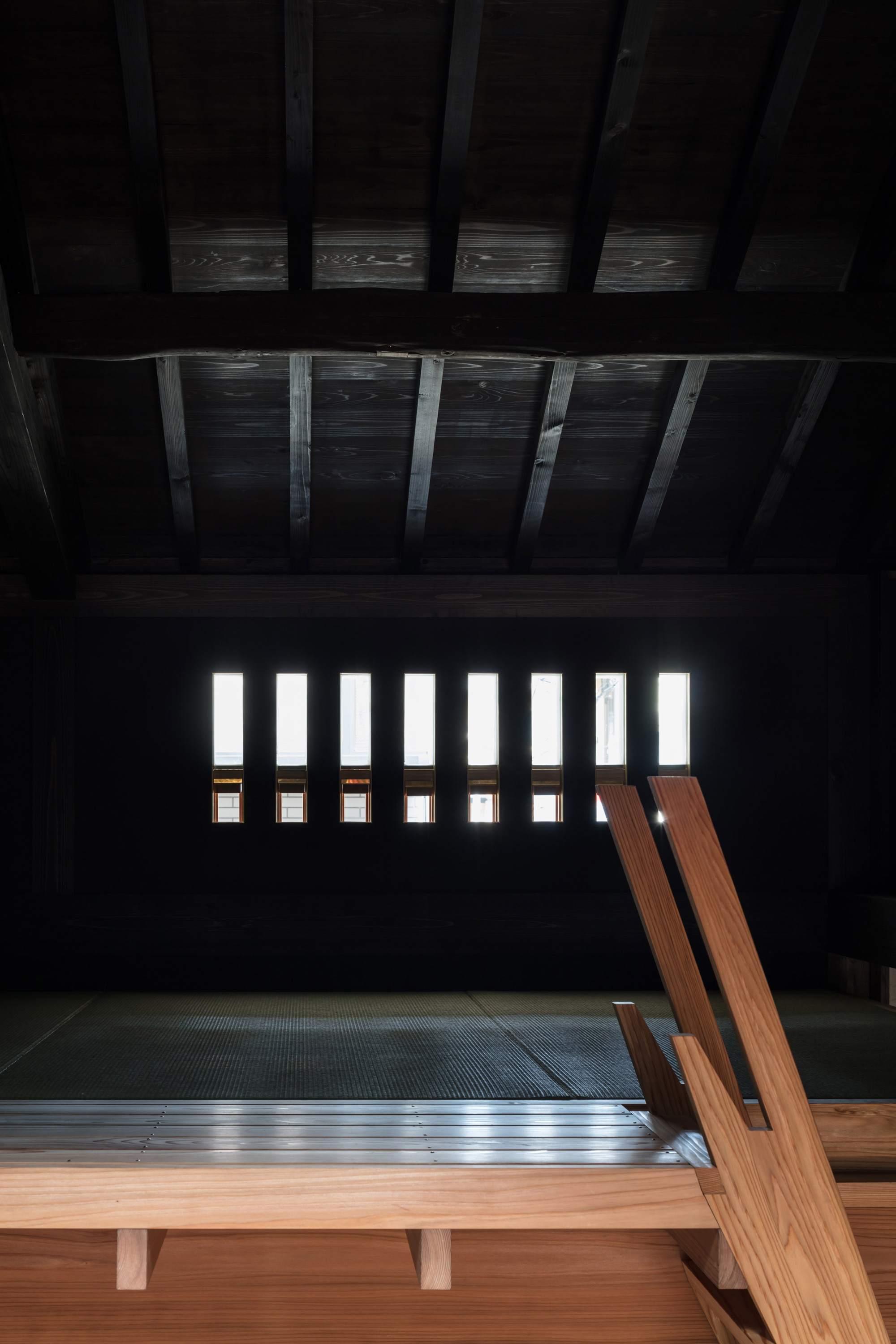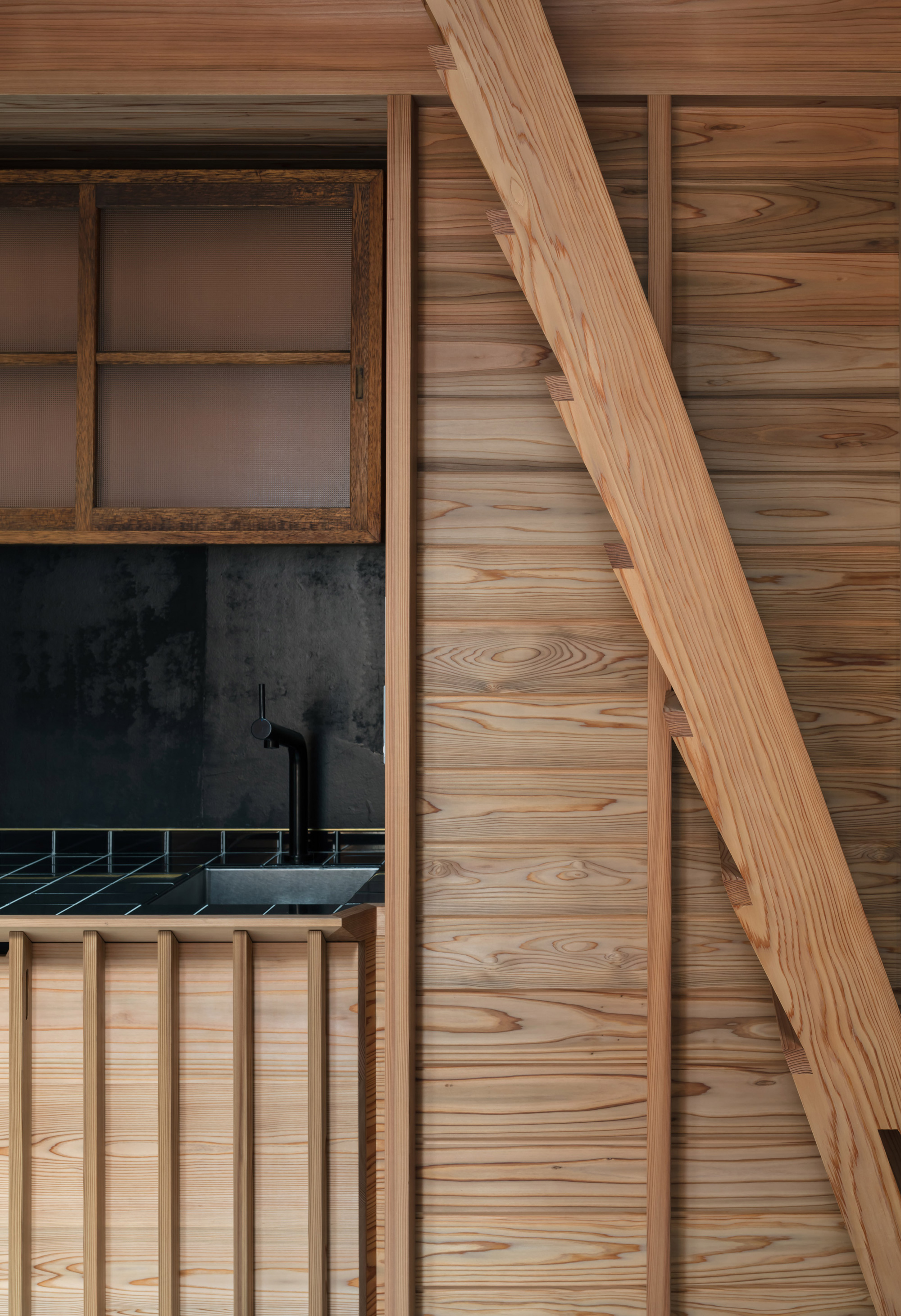 Restored using traditional methods and materials, the historic front facade boasts mushikomado lattice windows. By removing the interior linings, the team uncovered large wooden beams and the house’s timber structure. Painted black, the ceiling creates areas of deep shadow that enhance the brightness of the surrounding spaces and also create a play between darkness and light. In the middle, there’s a cedar volume that houses the bathroom, a laundry, and a kitchen. A ladder leads to the loft area with a bedroom space of Japanese tatami mats cloaked in sleep-inducing darkness. This middle section of the dwelling boasts hand-troweled cement mortar walls and flooring.