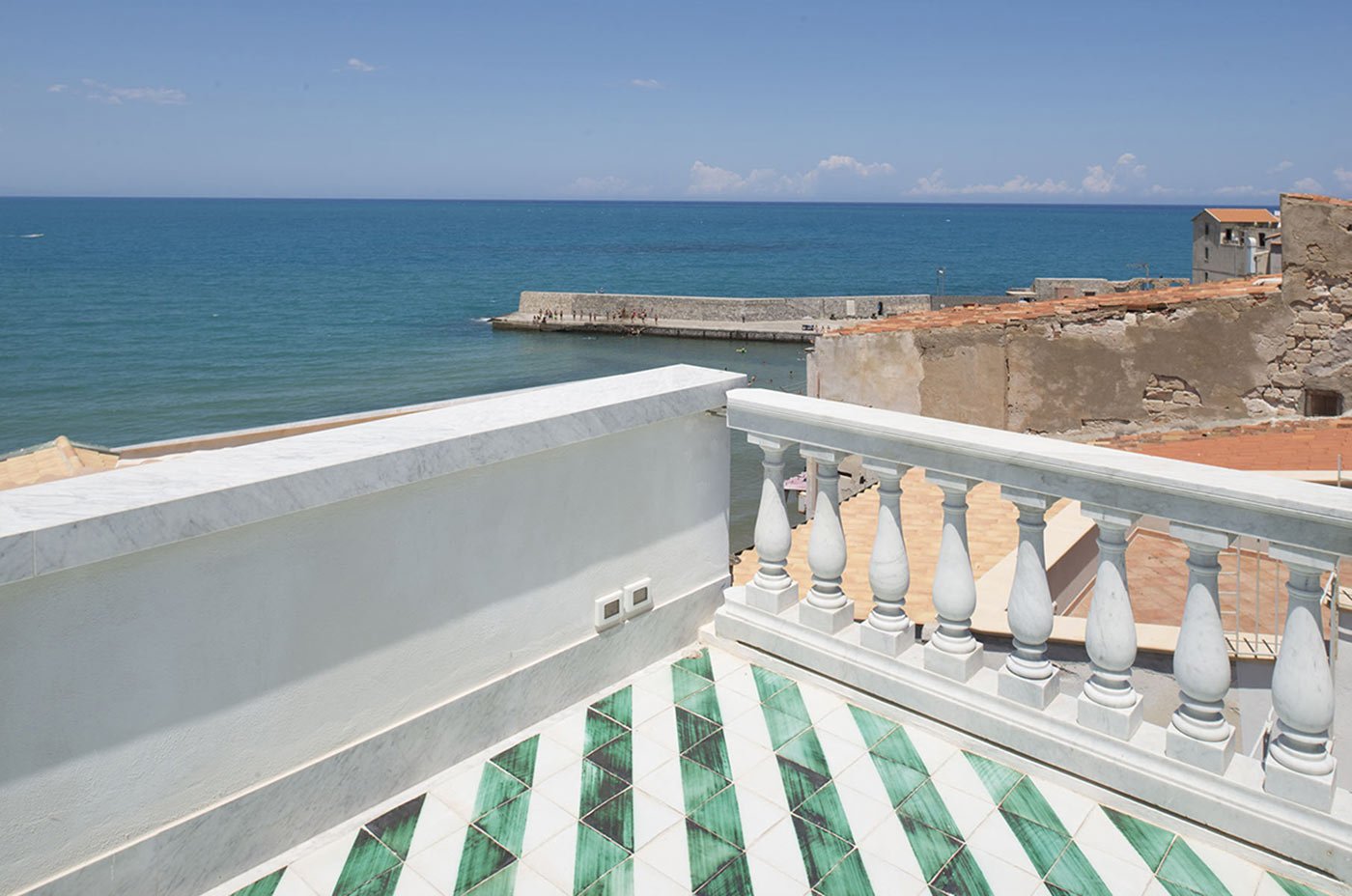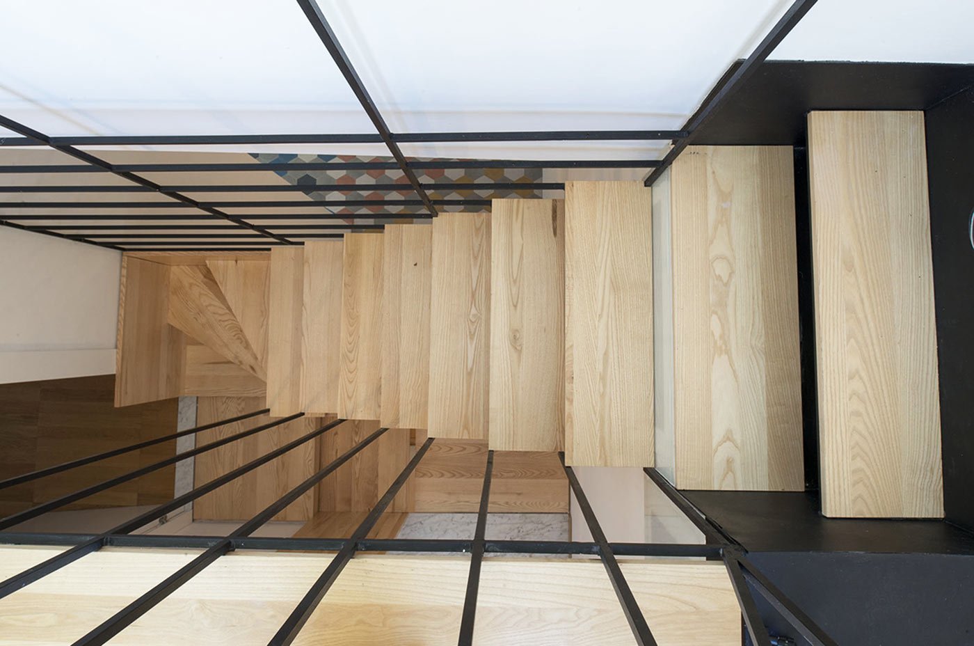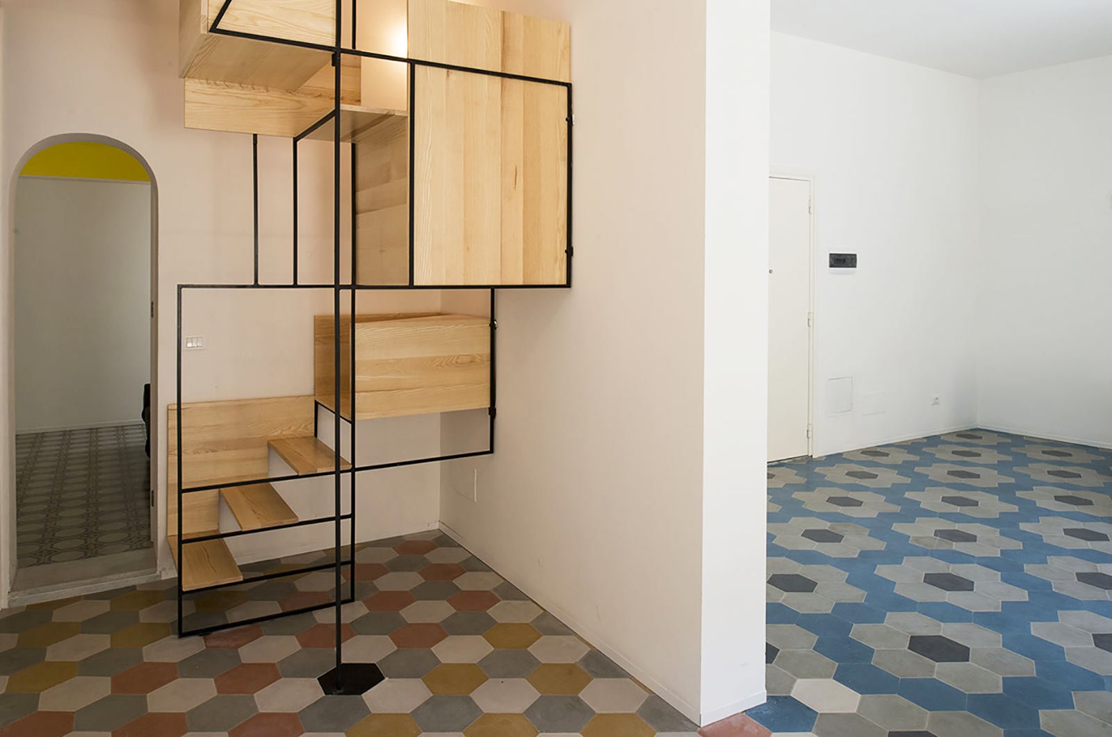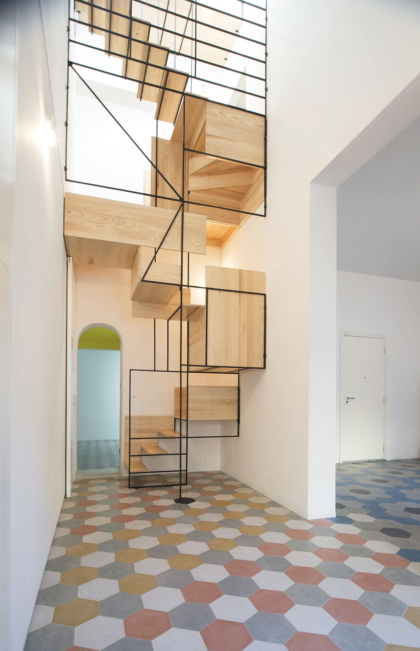 This stunning staircase is part of Casa G, an architecture project by the Italian studios Francesco Librizzi and Piergiorgio Italiano. Updating a historic seaside villa in Sicily, the new stairwell provides a contemporary escape to the timeless rooftop. The stairs are crafted from natural wood and affixed to a blackened metal frame made up of rectangles and triangles. The base is cut in a hexagonal shape, just like the tiles on the floor. Geometric in design, the addition echoes the attention to form seen in the original arched doorway and colorful flooring, while remaking the idea anew. At the top of the staircase, there’s a door opening up to the rooftop, where there’s a clear view of the waterfront and local architecture.