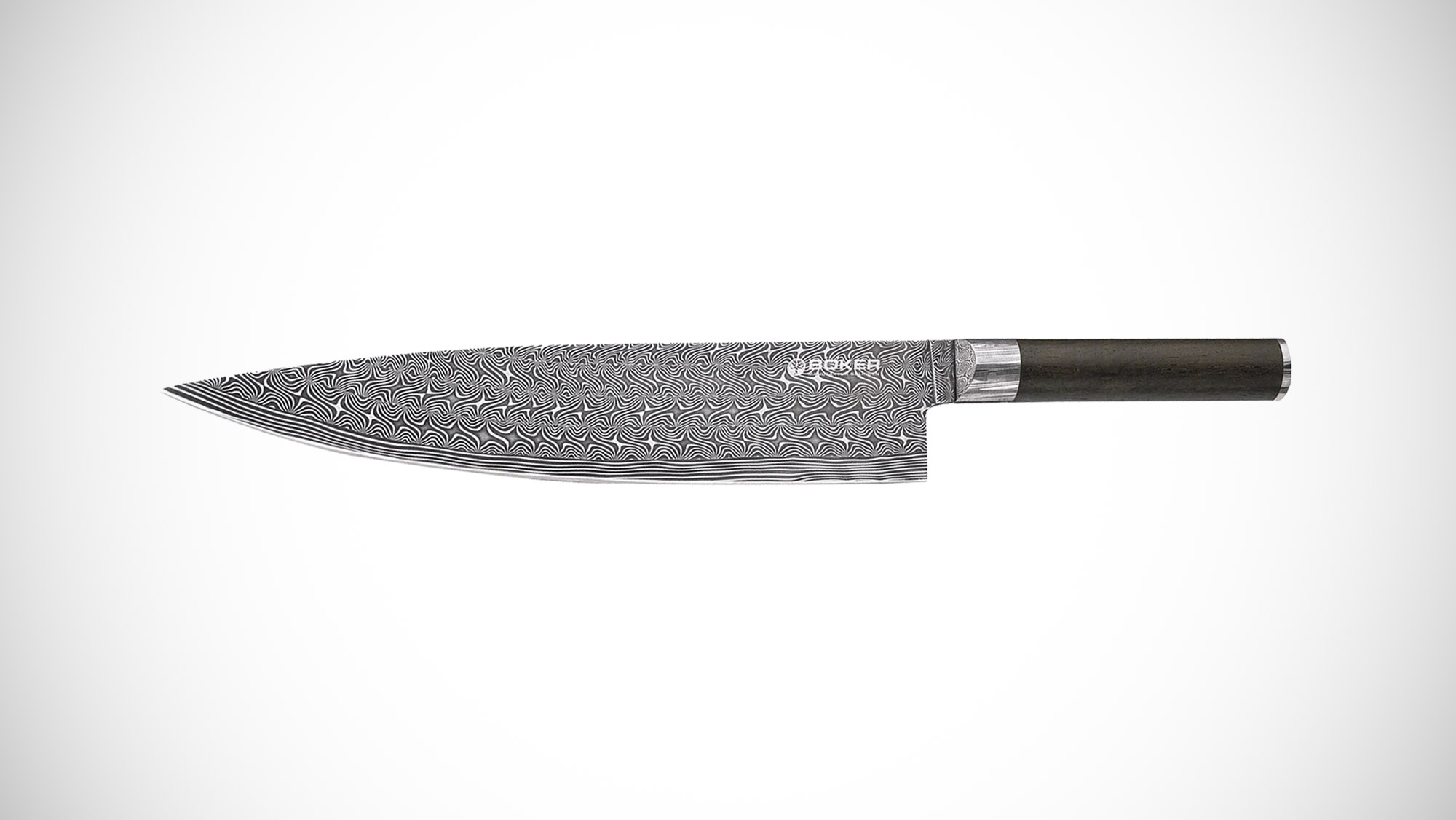 We start our list with one of the most creative chef’s knife designs you can find. Handmade in Germany by Lignum, the Skid Wooden Chef Knife Mahogany switches up the ratio between metal and wood in a seamless, distinctive design. In the world of high-end kitchen knives Damascus steel scores high on the list of exclusive features. Here, it adds a refined touch to the organic beauty of Mexican mahogany wood. Made in Solingen, the blade features the traditional steel folding technique that gives the metal an undulating line pattern. As practical as it is eye-catching, this chef’s knife is versatile, sharp, and durable. Safe to say, it will take pride of place in any kitchen.