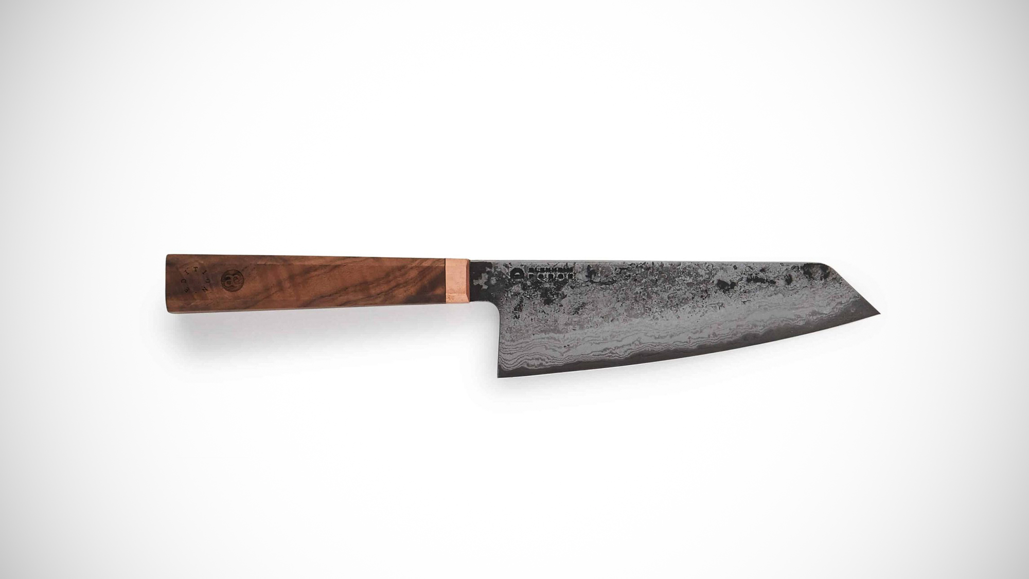 Made by London-based steel workshop Blenheim Forge, this knife is as beautifully crafted as it is versatile. Originally created in Japan, the santoku knife is one of the most popular kitchen knives as it can handle anything from slicing and dicing to chopping food with great precision. This one is a work of art. It features a hand-forged Japanese Blue Paper steel core blade finished with folded iron cladding that gives the knife a captivating Damascus steel ripple effect. To match the quality of the blade, the workshop used an English walnut handle with warm brown colors and eye-catching patterns. A copper ferrule completes the design. The Blenheim Forge Santoku knife also comes with an optional handmade leather sheath.