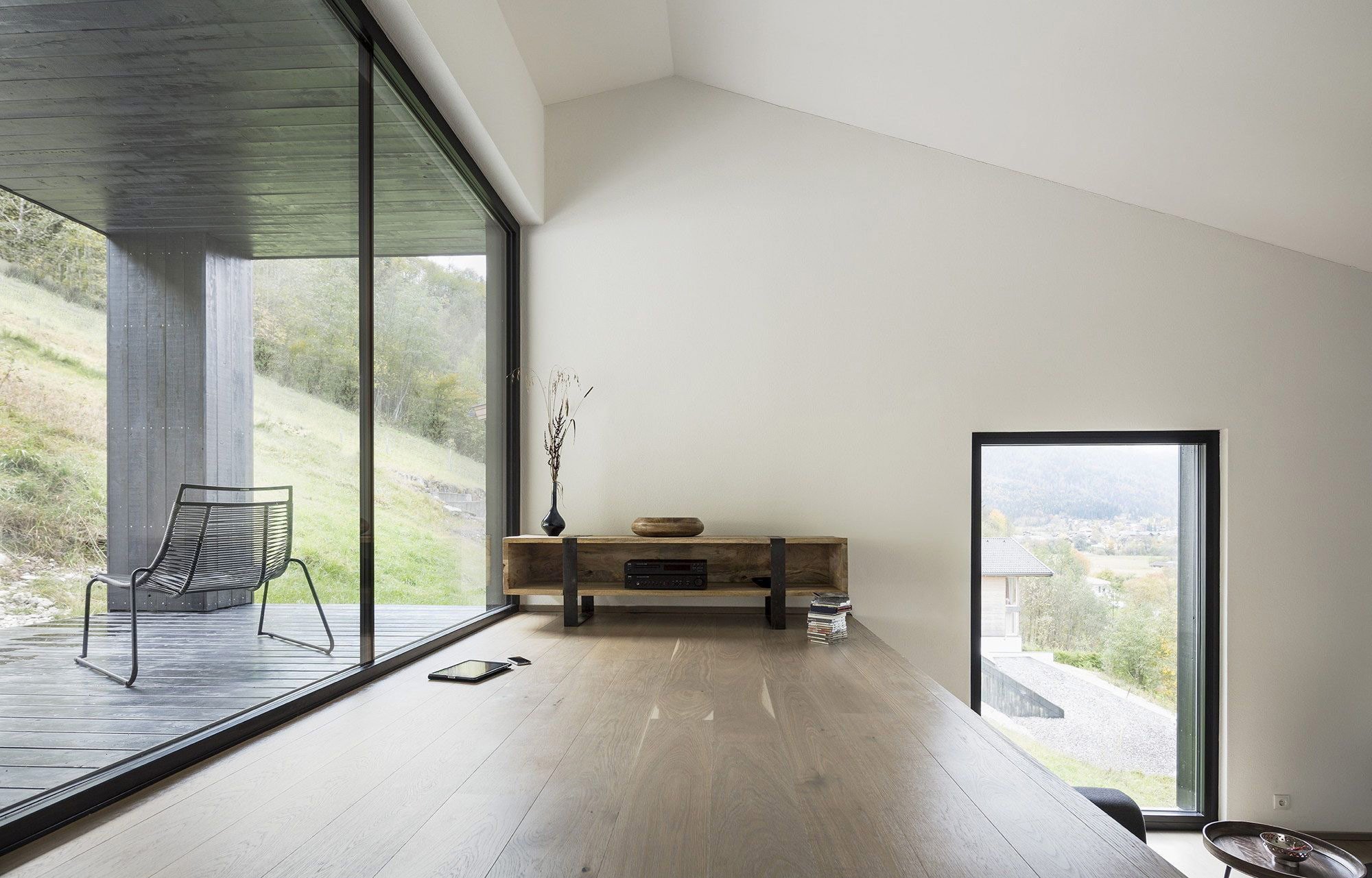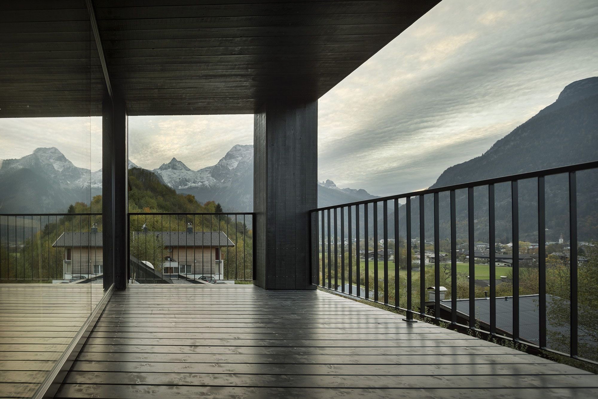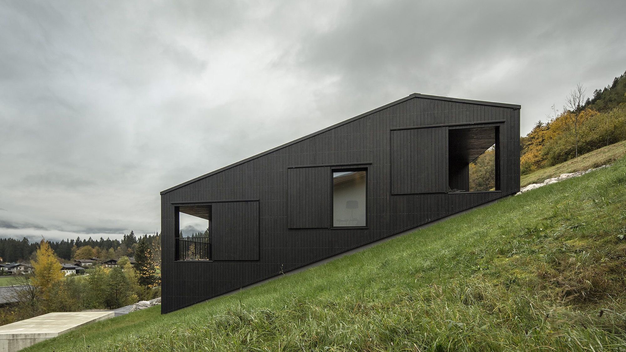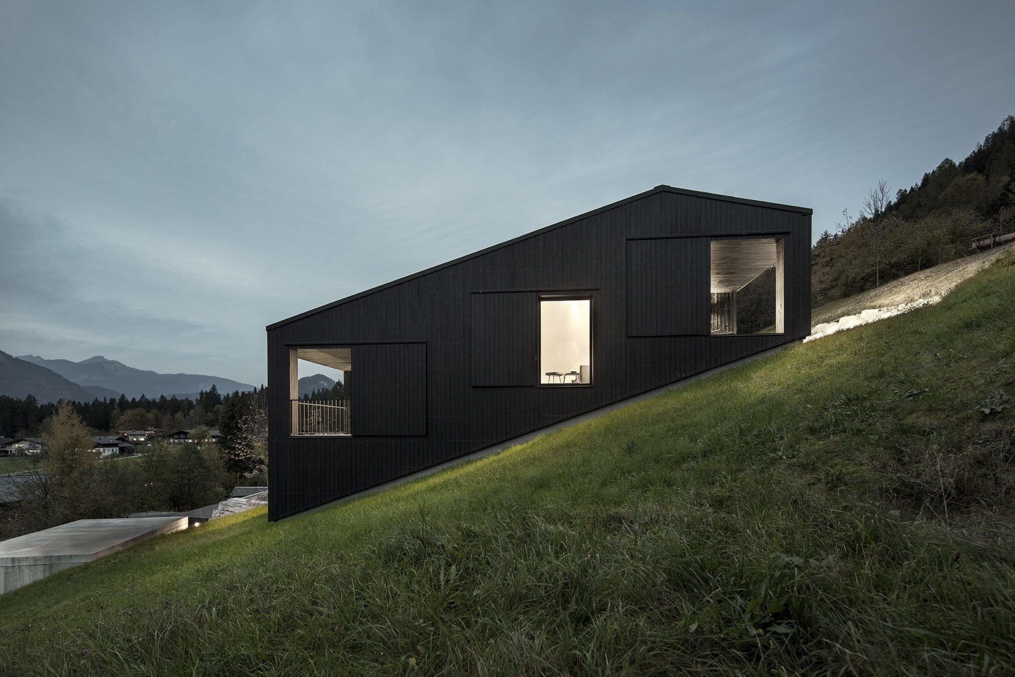 The home makes exquisite use of the natural slope through a layout that organizes the interior onto three levels within an open floor plan, with the living spaces on the lowest level given a wonderful view down the hill. The austere cladding of black timber helps build up the home’s odd geometry into a confident statement, working with the context while also proudly standing out. The interior is kept barebones, with tastefully appointed furniture on each level, but catches your eye subtly with its interior stairs, whose black timber matches the exterior’s shade. When you enter the home you are treated to the unspoiled beauty of the Austrian countryside thanks to unique vistas on all sides of the building, but can also relax in the glow of the fireplace when you want to shut the outside world out. The home’s design may lack the sentimentality often associated with the picturesque Austrian experience, but instead it gives its residents a respite from the gaggles of tourists who flock to the area for white water in the summer and ski runs in the winter. This is key, as it shows that the architects built this above all for the needs of their clients. They didn’t make it into a canvas for their individualistic expression or pummel it into a spreadsheet of budgets and expenditures. Through a design that responds to its environment as well as its occupants, LP Architektur have again proven their knack for finding the pureness modern architecture so often lacks, building a home the right way because it’s the right thing to do.
