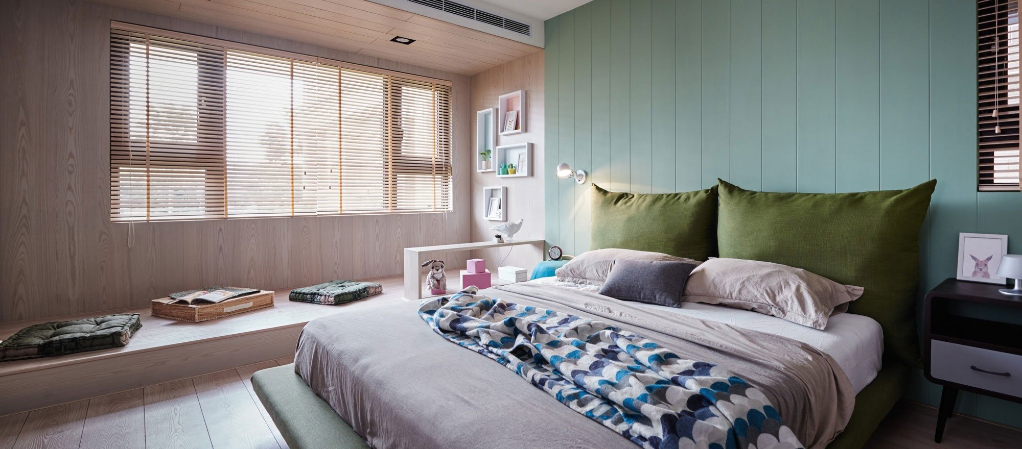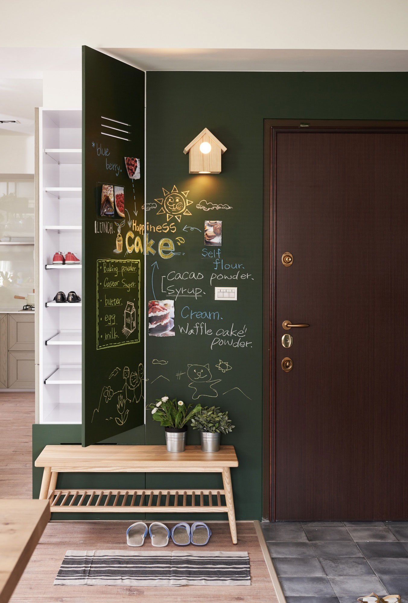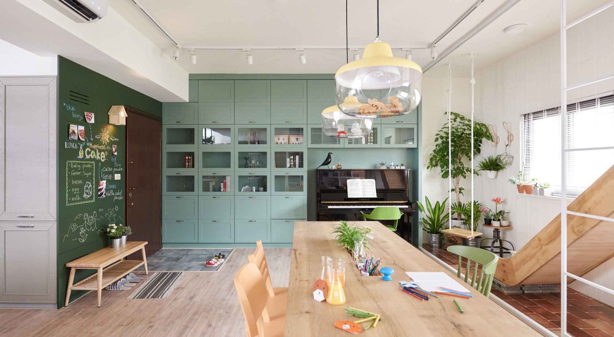 Located in Kaohsiung City, Taiwan, the Stone residence has a unique look and feel that blends whimsy, playfulness, and minimalist design in complete harmony. It is immediately evident that this is a family home, a place specifically designed to bring all the family members closer together, whether at dinner time or on lazy Sunday afternoons. To create their ideal home, Mr. and Mrs. Stone have collaborated closely with Hao Design, and interior design studio based in Taiwan. The couple’s main focus was to bring a sense of playfulness to the apartment and to integrate their children’s activities and play areas everywhere around the home. The open-plan design reveals a spacious kitchen area with a central island and a large family table that features a narrow space that can hold potted plants or colorful crayons. Suspended above the island, industrial-style storage racks for kitchen utensils and plant holders made of black steel complement softer light green tones, pale brown and cream wood surfaces, as well as bright white walls. Scattered around the space are cleverly placed leisure and play spots. The study and playground area has a black piano, a chalk writing board, and includes access to the large table that can be used both for family meals and for completing homework assignments. The living room area boasts comfortable bean bag chairs, while the veranda includes a wooden swing alongside lush green plants that soak up the natural light. A slide gives the children an opportunity to reach the downstairs area from their room quickly – certainly with a smile upon their face. The slide can also be removed when needed, to offer more space on the veranda. Whimsy accents abound, from the lighting above the table holding figurines inside larger glass receptacles, to the balloon-shaped lamps seemingly hovering in one corner of the children’s room, or the various toys peeking from bookshelves. Nature, playfulness, modern and functional design as well as interactive spaces and relaxing areas full of natural light are all brought together in a home that is truly a safe haven for this young family. Photographs by Hey!Cheese Photography.