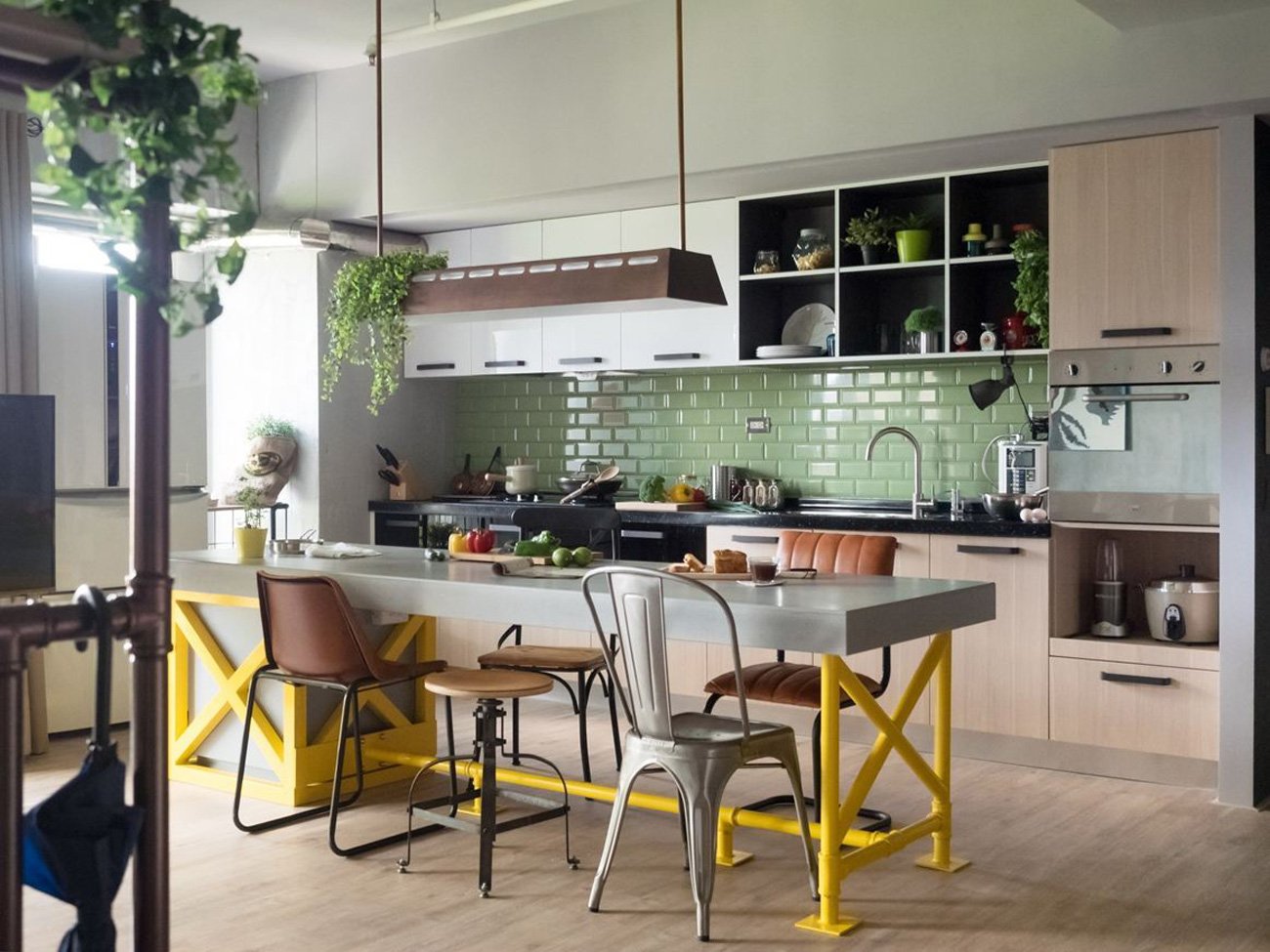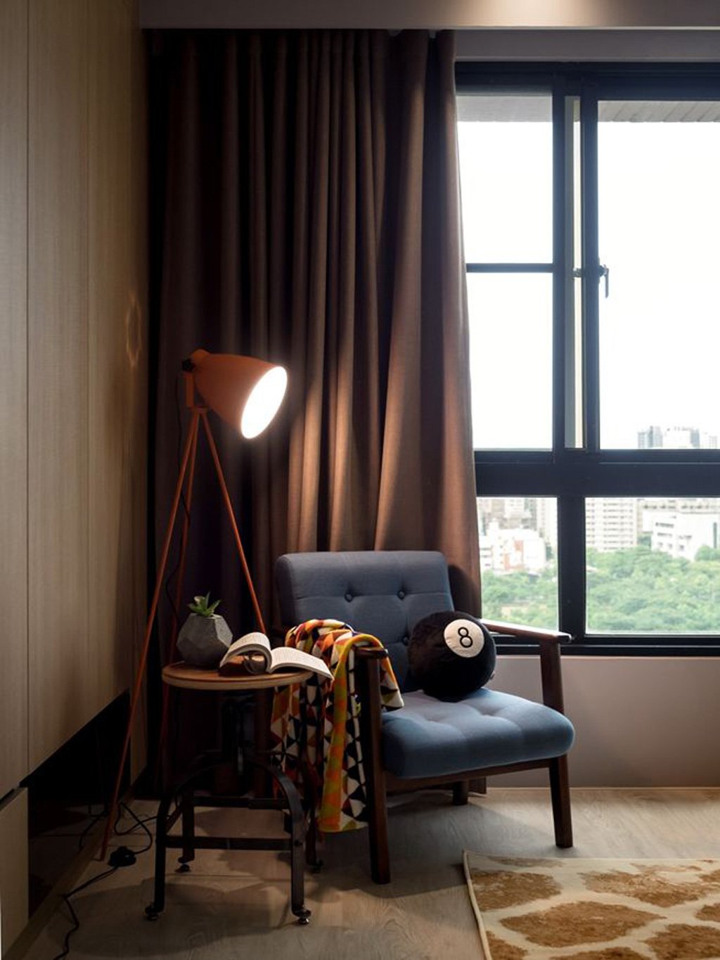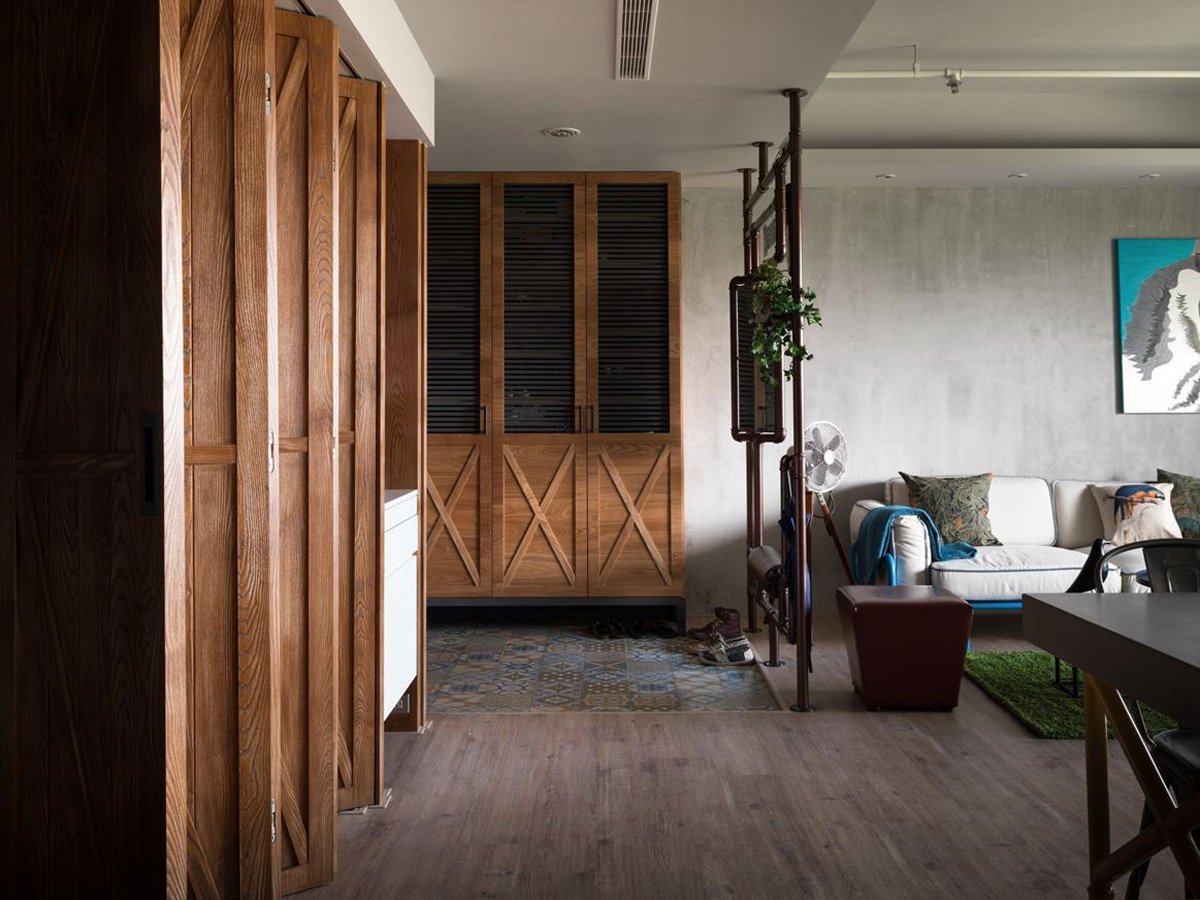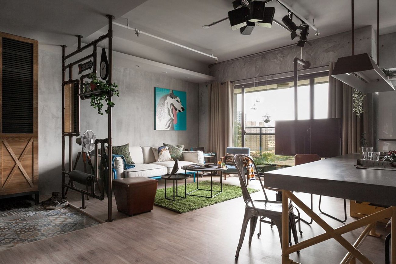 Called the Family Playground, this home was created by House Design ???? in Kaohsiung City, Taiwan. Mixing traditional and contemporary elements, the pairs restrained concrete walls and wooden floors with colorful details such as intricately patterned tiles and a forest green chalkboard wall. One element in particular, the pipe dividers, stand out for their blend of classical and industrial imagery and their dual Fung-shui and storage purposes.