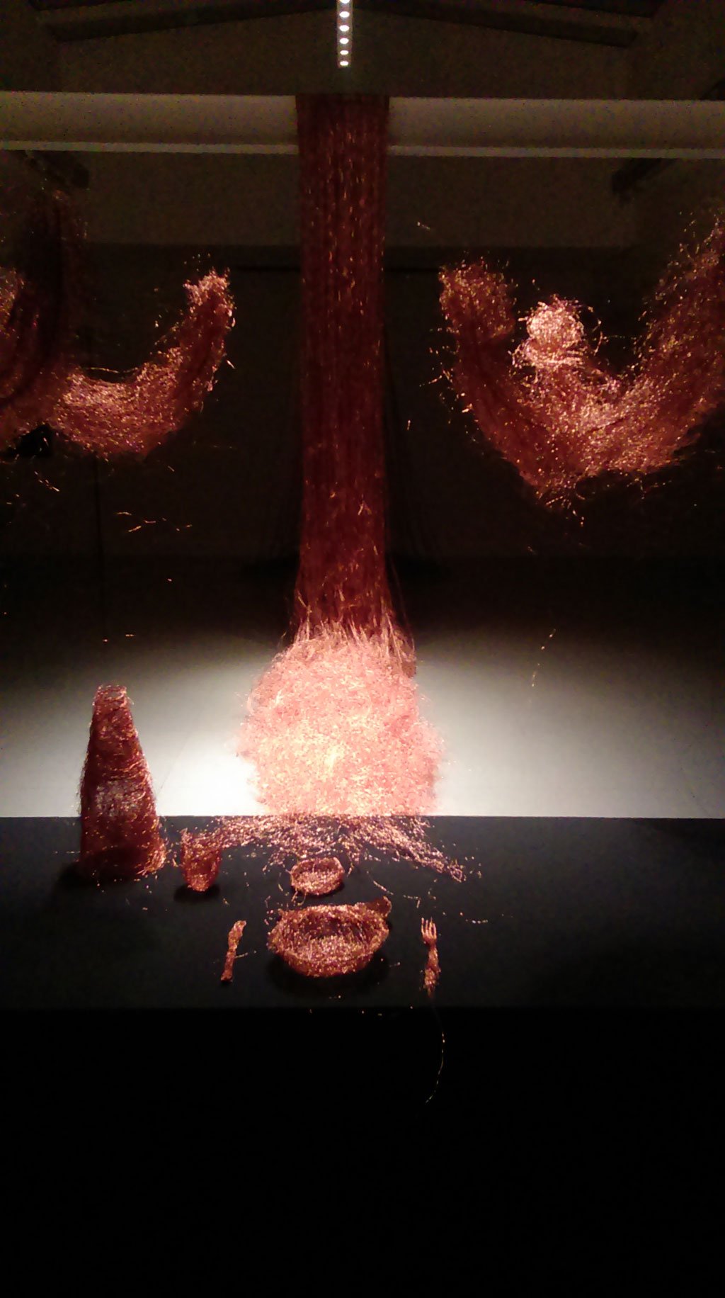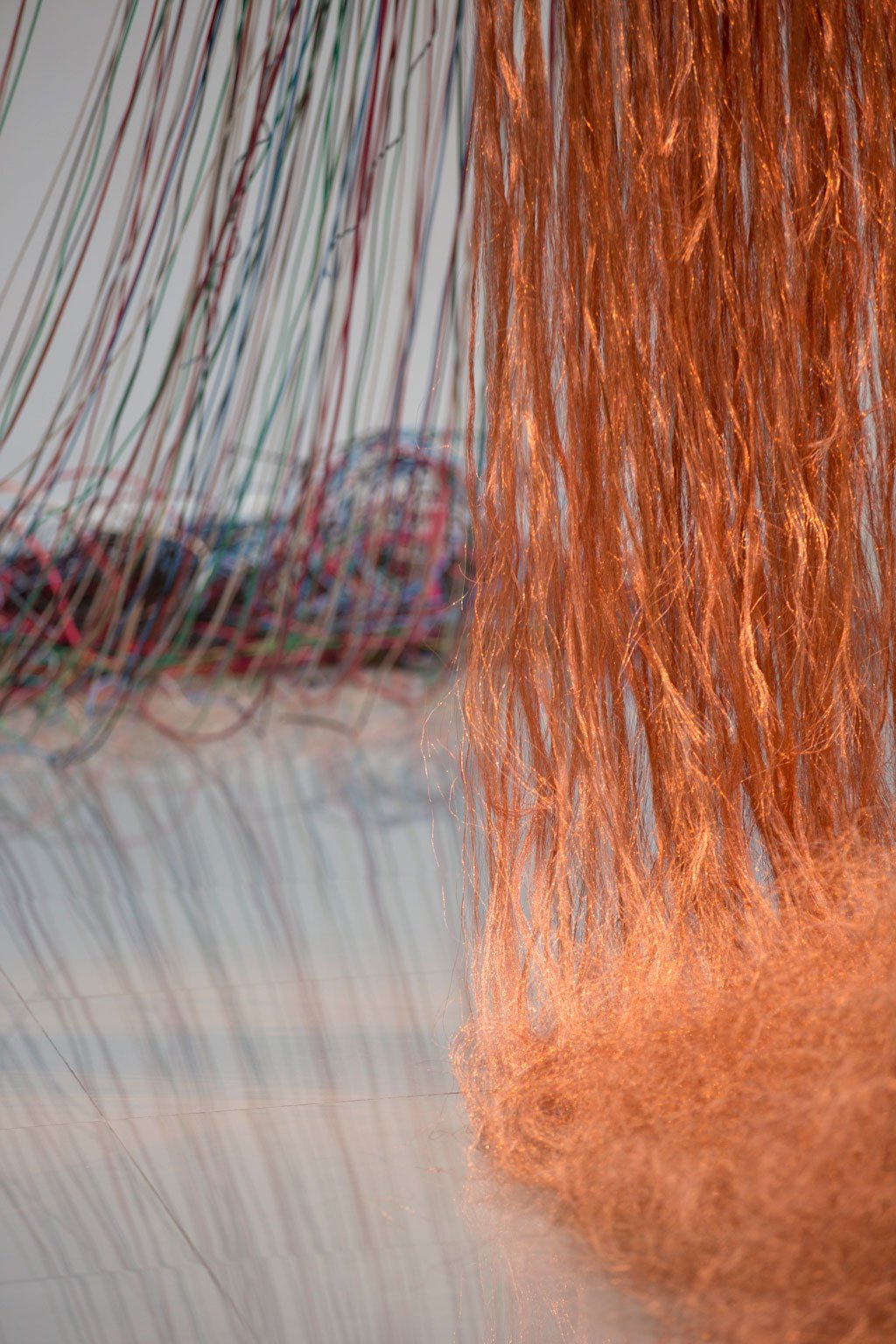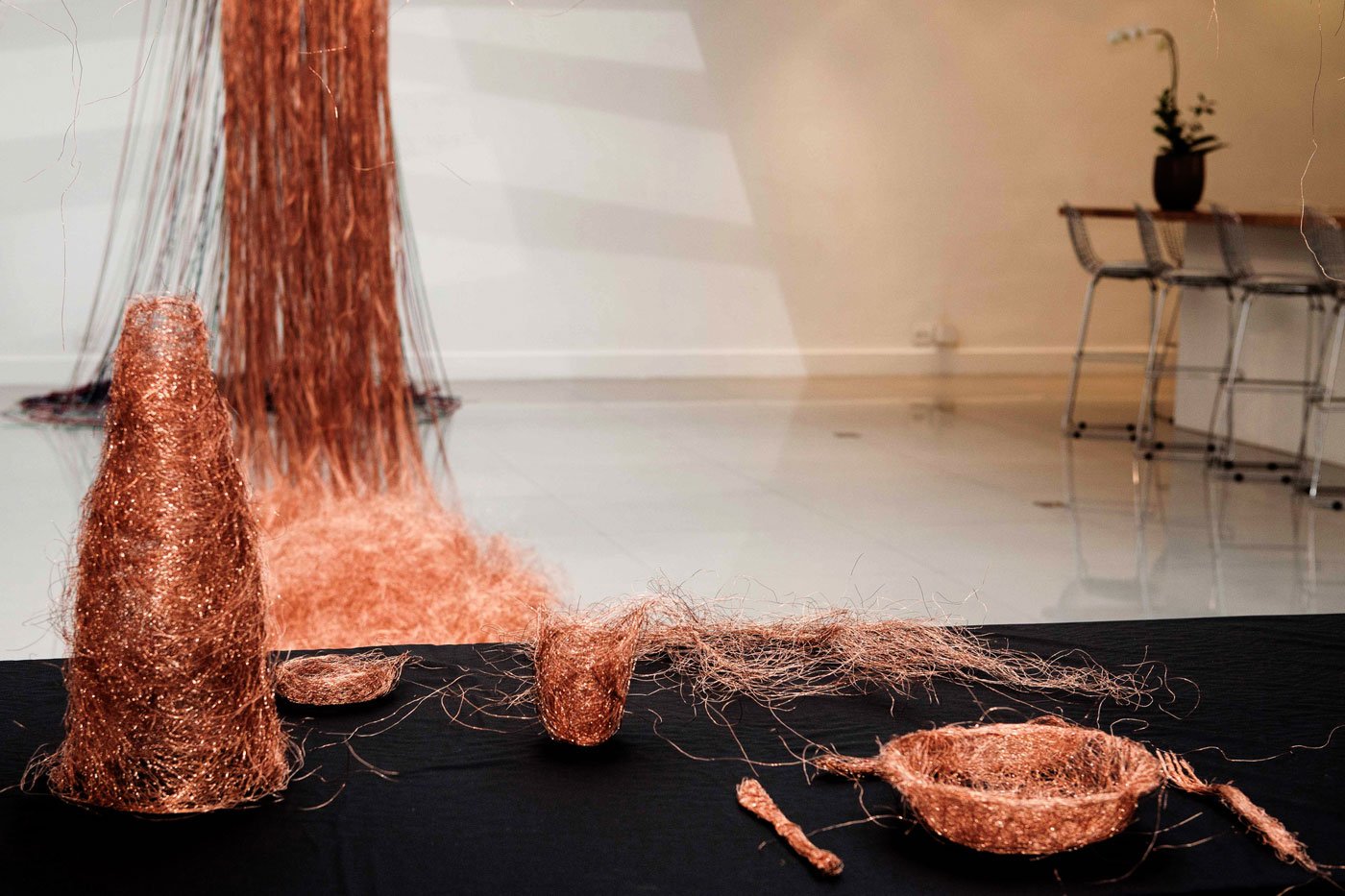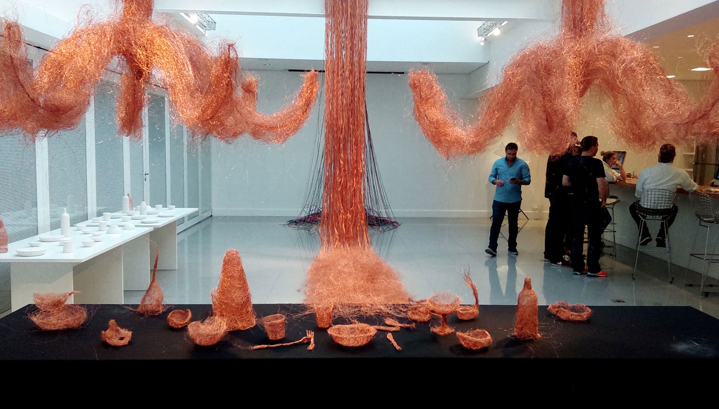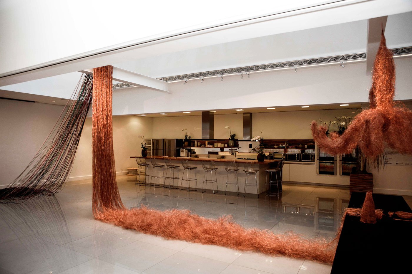 Presented at this year’s Design Weekend São Paulo, Project Brazil is a collaborative installation and workshop by three Milan-based studios: Analogia Project, Giorgio Bonaguro, and Marco Guazzini. The art display draws inspiration from “gatos,” here meaning stolen power or “unofficial, and often illegal, electrical connections made in order to get electrical power from legal official electricity sources in favelas.” In São Paulo specifically, people without the means to buy electricity for their homes often tap it from nearby streetlamps. Project Brazil evokes such imagery by experimenting with thin strings of copper wire. The bright material cascades from the ceiling, gets tangled up on the floor, and is transformed into domestic sculptures such as chandeliers, bowls, and cutlery, symbols of plenty.