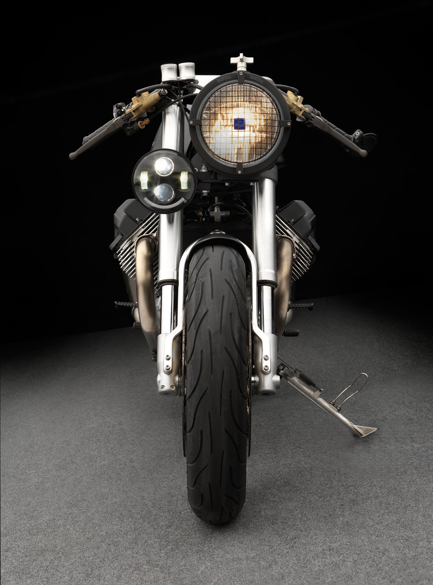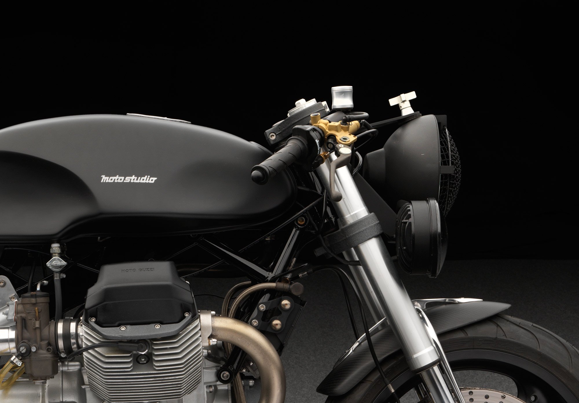 For this 2001 Moto Guzzi V11 Sport, the first step of the transformation process involved the removal of any unnecessary parts. The fuel injection, fuel pump, ECU and stock wiring were the first to go, reducing the overall weight by 25 lbs. The electronics were completely overhauled and now include a digital ignition module from Elektronik Sachse, a Motogadget switch gear, and a custom, in-house built wiring harness for a total reduction of 85% in weight compared to the original parts. Other upgrades include a steel gas tank from a Guzzi 1100 Sport, a Hella 4000 rally car headlight, and a main LED light. Various parts are designed and handmade by the Moto Studio team, from the carbon fiber seat cowl, sub frame, and front fender mount, to the fender and reverse cone mufflers or the headlight and shock canister mounts. The result is a bike that has lost over 40 lbs and gained an even more stylish and fierce appearance, as well as superior performance. Photography by Peter Harholdt. Images courtesy of Moto Studio.