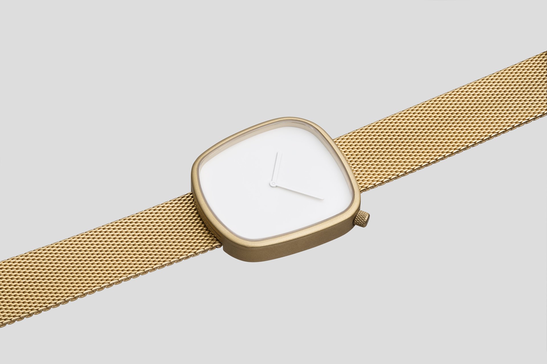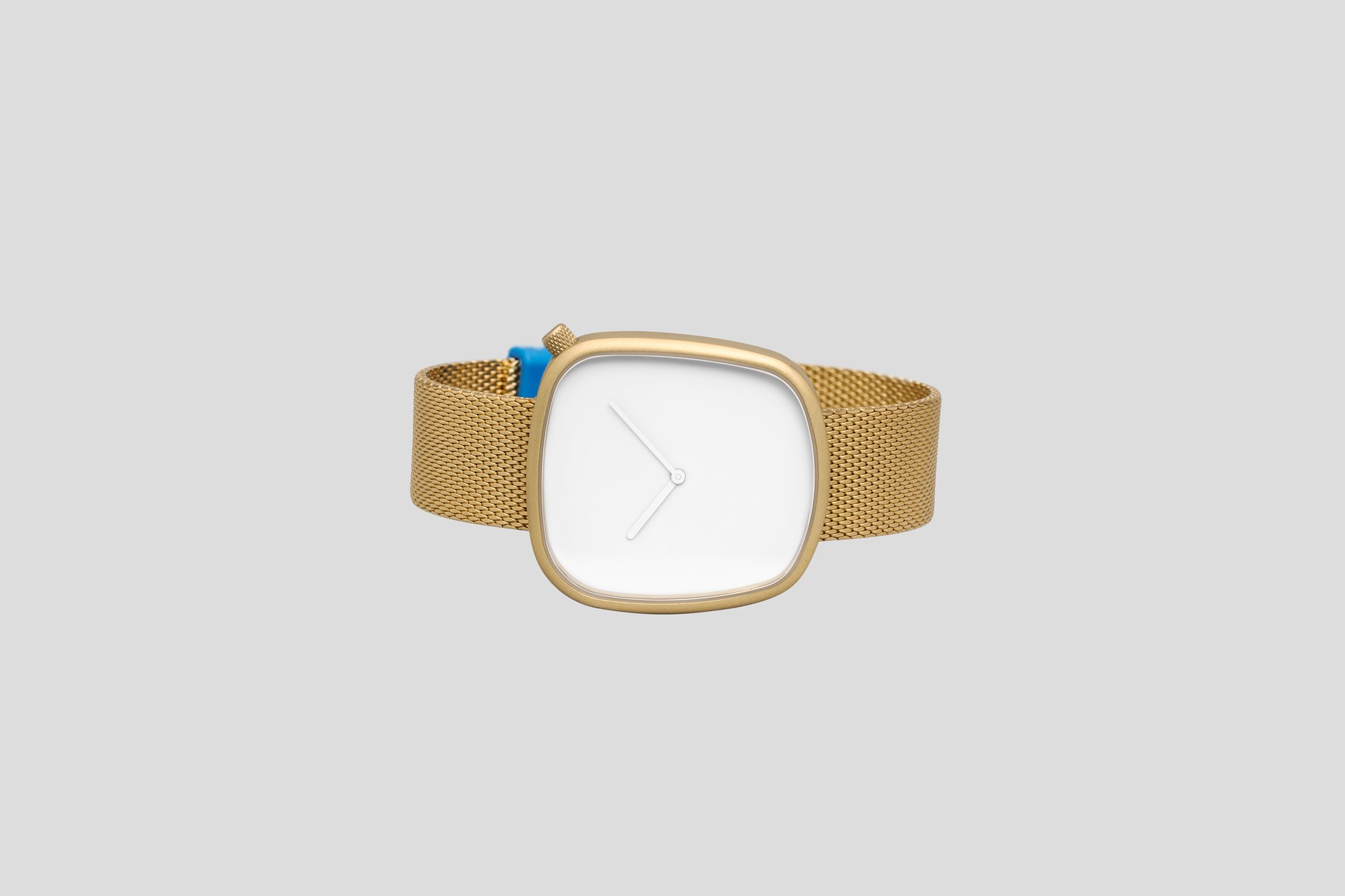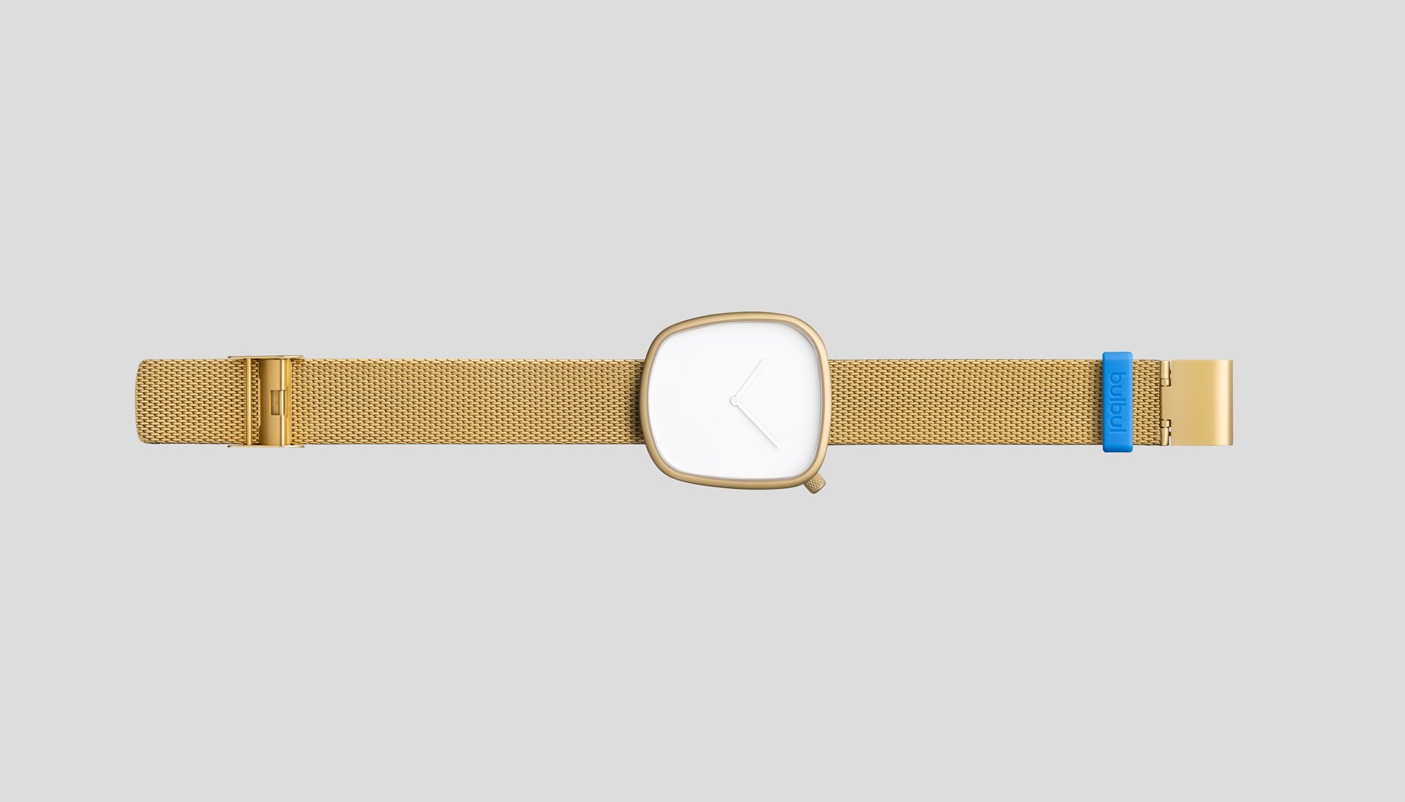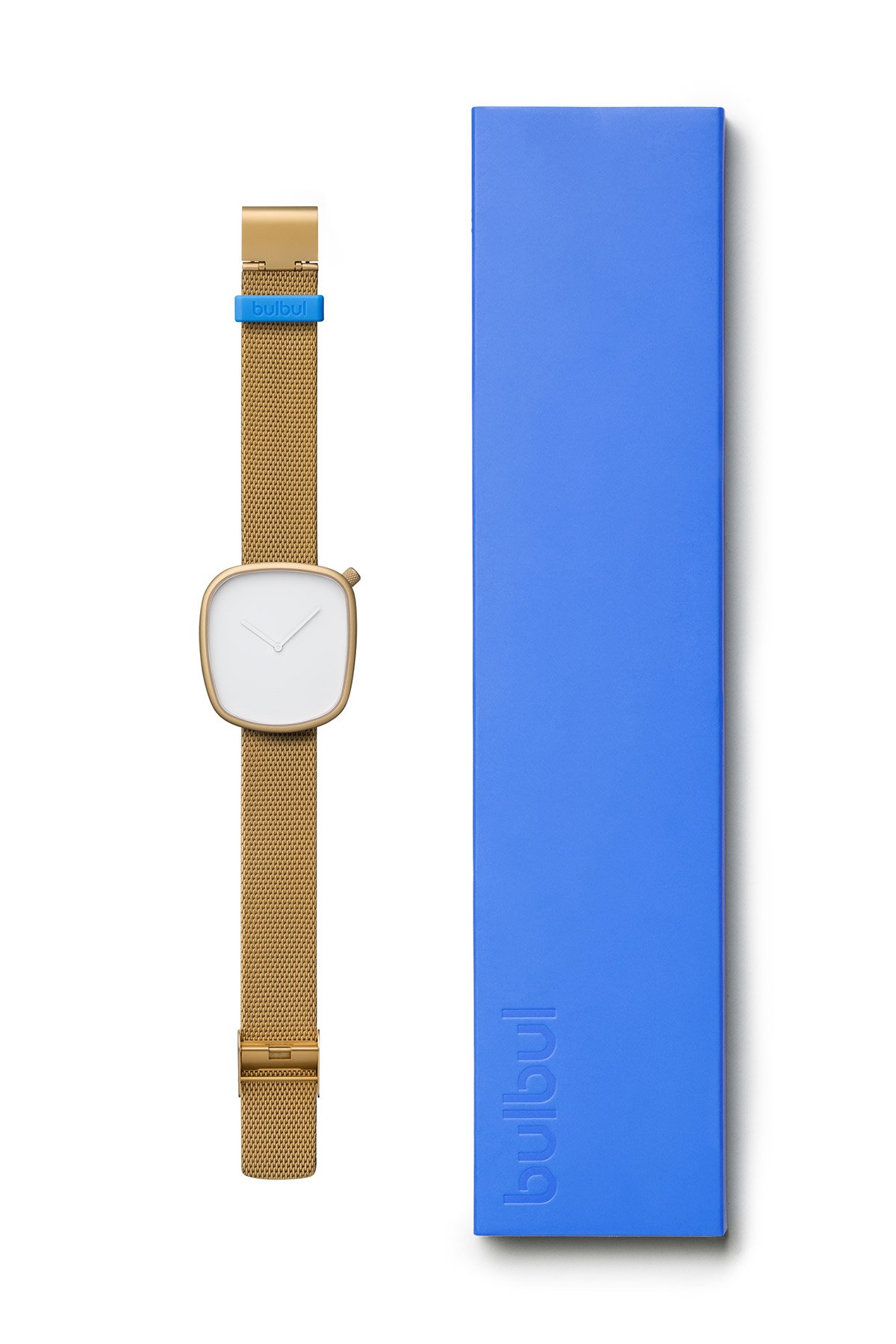 The popular Pebble collection from Bulbul is now richer and more varied thanks to a new model, recently added to the line-up. Launched at Baselworld 2016, the Pebble 08 watch maintains the iconic asymmetrical dial that is inspired by pebbles found on Scandinavian beaches, as well as the eye-catching blue silicon loop which adds a striking accent to the band. Just like the rest of the range, Pebble 08 is the created by Danish trio KiBiSi. This update takes the minimalist look further by enhancing the design with a matte golden finish that lends the watch a refined appearance. The dial and the two hands are both finished in immaculate white, letting the golden tone shine through. The elegantly textured Milanese steel bracelet is made by Vollmer, a leading manufacturer crafting steel watch bands since 1922. Inside the 316L matte golden steel case there’s a sophisticated gold-plated, four jewel Ronda movement made in Switzerland, with up to ten years of battery life. A sapphire crystal glass protects the dial, and like the other carefully chosen materials, ensures the durability of the watch. Swiss and German premium components along with Scandinavian design combine to create a product that is long-lasting in both its construction and its aesthetic appeal. Buy here