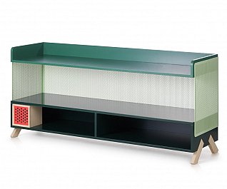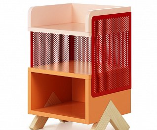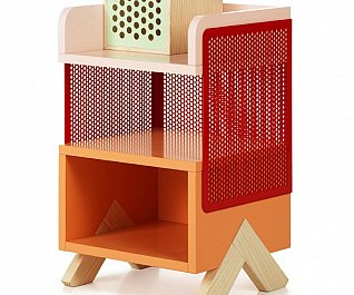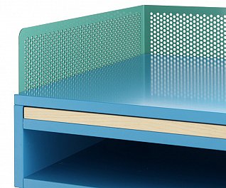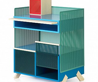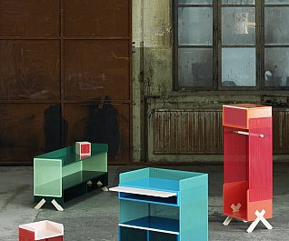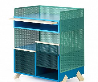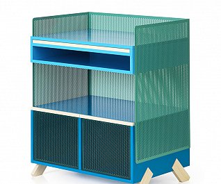 cabinets were stable way beyond our expectation and stood firmly without swaying. Another idea that we wanted to try out was a series of legs whose design would fixate the material that it was intended to support. We tried several different leg positions in the PEEP series that were all customized to the respective PEEP cabinet that they would support. All the legs are mounted flush into the sides and can be dismounted. In addition to PEEP we designed KEEP. As little as possible we wanted to work with fixed shelving’s and came up with the idea to work with loose boxes that can be pushed around, piled up and spun around inside the PEEP cabinets. In the KEEP series some boxes have an open front and back cover with perforated metal. Forward facing, these boxes can be a display area for things you want to expose, while rear facing, they could be hiding your mobile charger or cords. There is also a series of boxes with sliding perforated shutters.