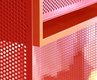 The product would also be a spacious and visually exciting furniture that was not specifically linked to the office environment. We had earlier discussed an idea about how to create a product like that, but in live projects there is little room for failures. In this case we doubted whether it would be stable enough or whether the weight would be a factor. Now that we together with Lerch Träinredningar had a possibility within the Marginal Notes concept to test the idea, we went as far as we could experimenting with different sizes of collars, different perforation density of the metal and different materials. We developed the perforated collars with RMIG. When the collars arrived it was far from obvious that the project would succeed. The aluminum collars were very light but also very wobbly. Until the boxes were fixed the project was very uncertain. However, when assembled the