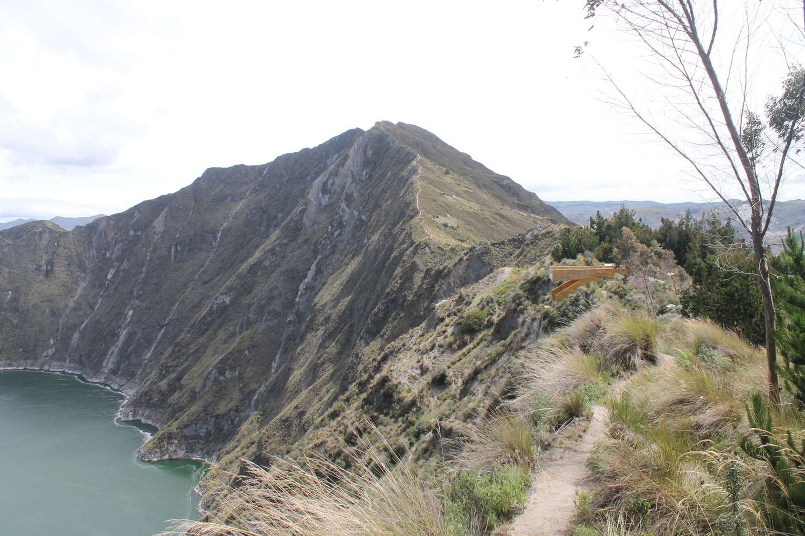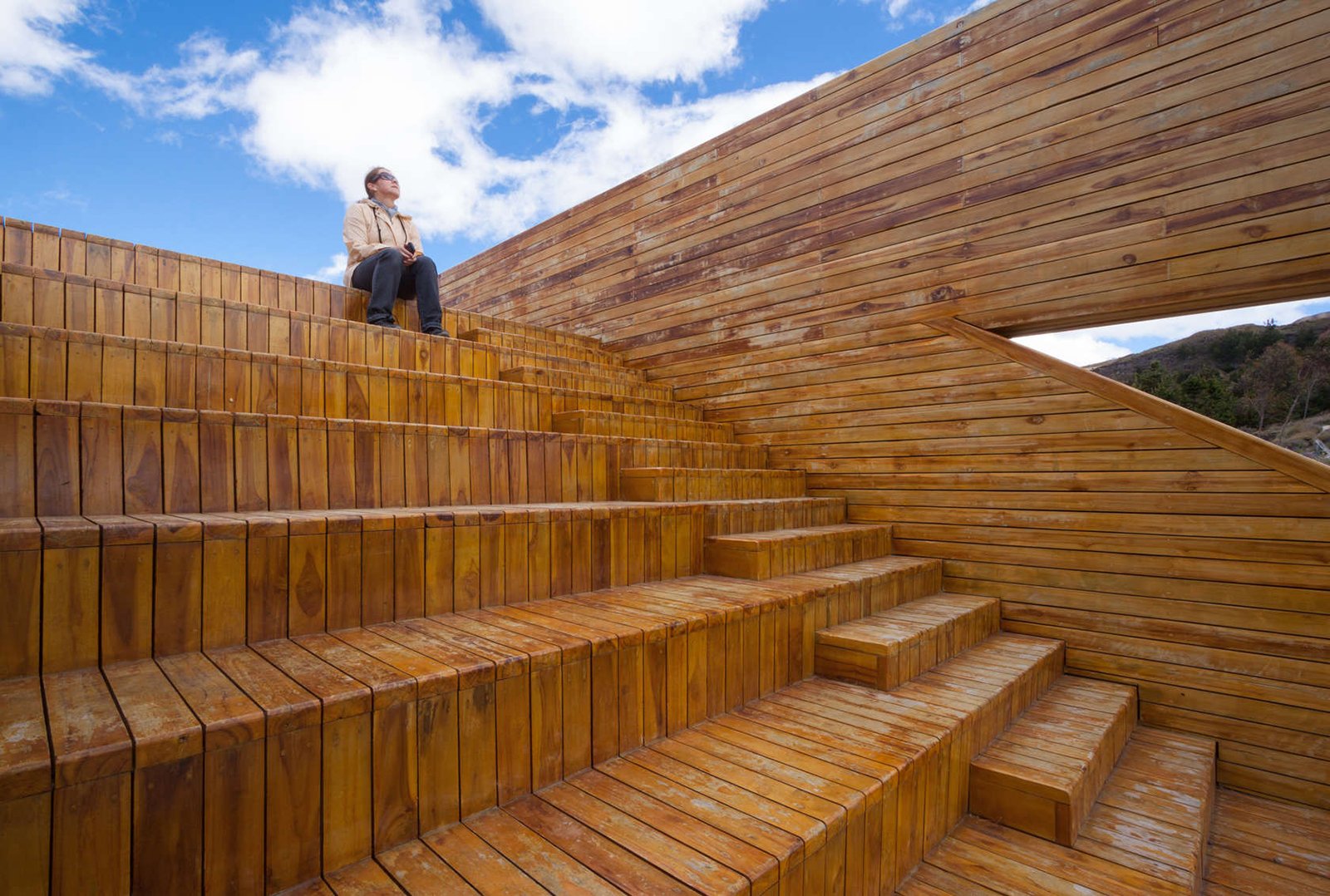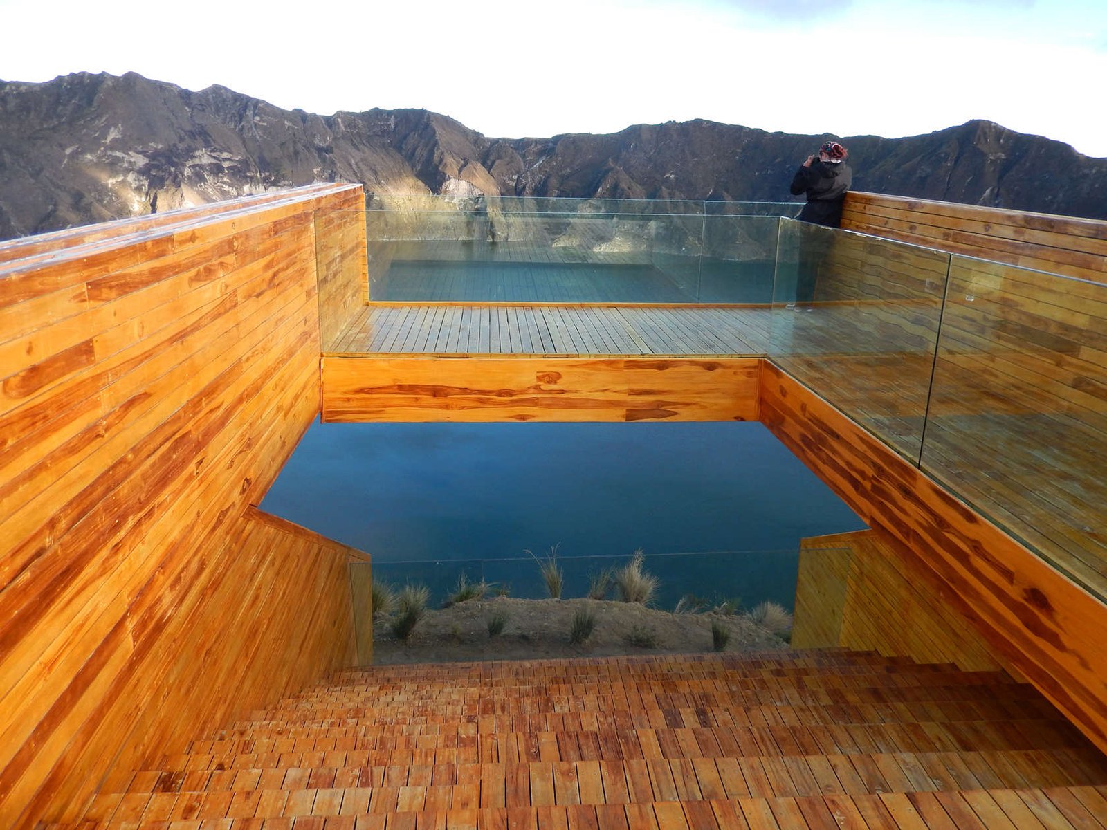Called the Quilotoa Shalalá Overlook, this unique architecture gives tourists an elevated view of Quilotoa, a caldera in the Cotopaxi Province of Ecuador. The viewing structure was designed by Jorge Andrade Benítez, Javier Mera Luna of ERDC Arquitectos, and Daniel Moreno Flores. Together, the architects worked to create a congruous but not redundant experience of the natural wonder. With help from the Ecuadorian Tourism Ministry, the team sought to make this already-popular tourist site more accessible without degrading the Andean páramo habitat. The resulting design is built into the slope of the crater and tiered with a balcony so that many people can enjoy the view at once without trampling the surrounding vegetation, which includes the short grasses, shrubs, and trees native to the region. Based on a steel truss system, the strong design is clad in warm, naturally finished wood. The timber serves as a gentle outer shell and contrasts with the blue skies and turquoise lake. Offering greater shelter from the elements, the half-height glass barriers for safety, the design provides a level surface that is likely more accessible than the raw terrain, especially for younger and older travelers, and, to the same end, includes half-height glass barriers for safety.