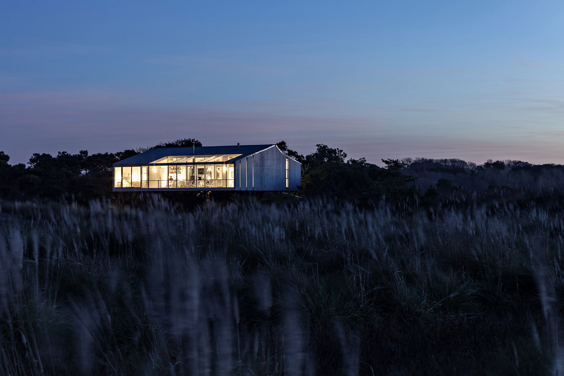 Within, bedrooms are tucked into a mezzanine below the A-line roof, to maximize volume and versatility of the interior. Glazed facades maximize light and invite the contrasting landscapes to participate with the inhabitants, emphasizing the escape from urban environments. Alric Galindez has reinvented beachfront weekend cabin design with minimal impact and maximum enjoyment of the surrounding Pampas.