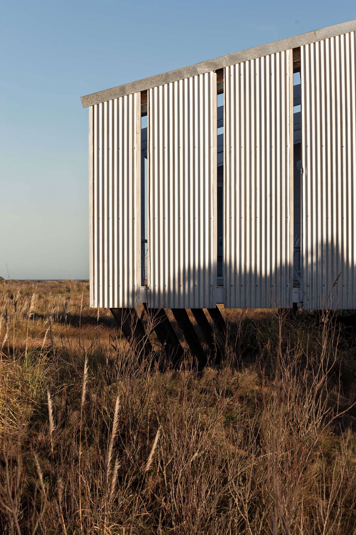 A system of poles were sunk into the fragile sand dunes, stabilizing and supporting a single concrete foundation. The home was built with corrugated metal and reclaimed wood, and an ingenious ventilation system takes advantage of the windy plains to control the interior temperature. The sea side terrace is designed to capture sun and salted air, while the plains side has a deeply sheltered porch to protect from dominant winds.