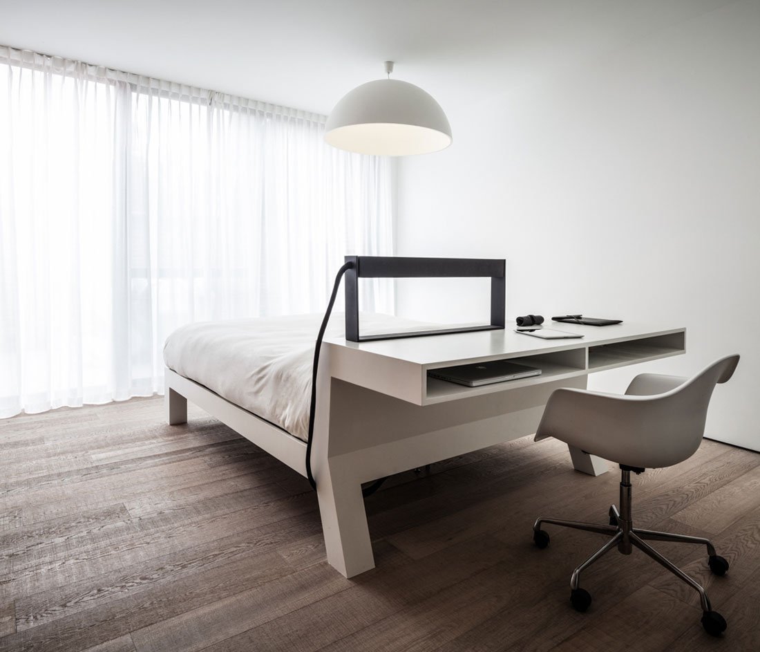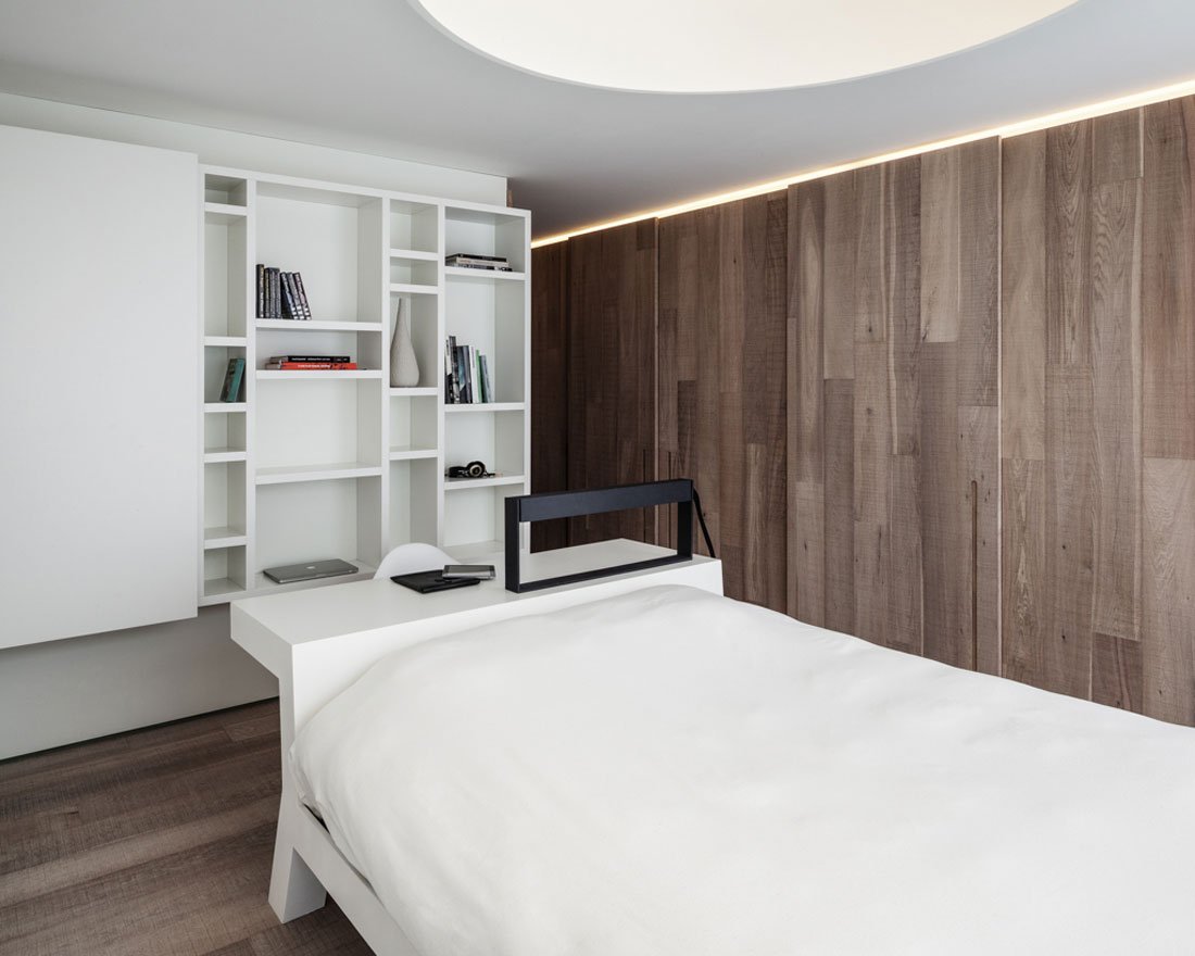 Loft MM is a beautifully designed home by C.T. Architects. The client lives in a wheelchair whereas the finished product accommodated his needs although never compromised on fine details. All wooden features really set the heart of the home as warm, full of character and natural. Many hidden pockets of storage within the main hall make it easy to hide the clutter leaving behind a minimal decor that’s responsibly tidy, refreshing and practical.  They illuminate from the top to create a lovely ambience, although also work nicely for keeping the tunnel well lit. Either end of the apartment exist the bedroom and living spaces. This concentrated the utility areas to the hall as well. Their positions are strategic for the client’s greatest accessibility, including fixture’s heights and proximity.