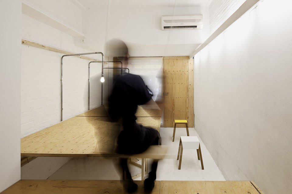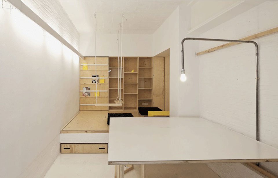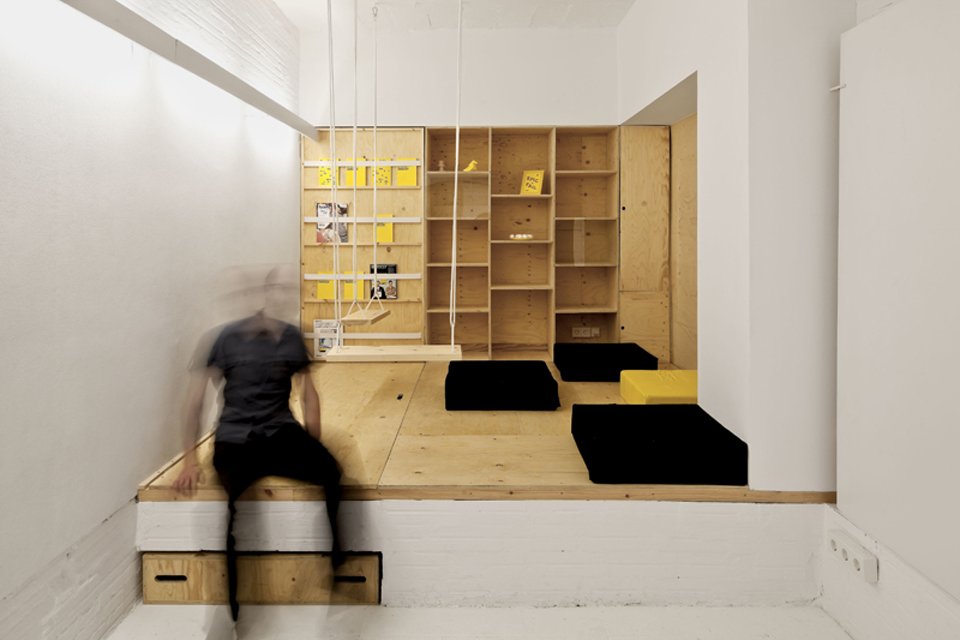 The Toormix Workshop in Barcelona, España offers generous work stations in ample lighting, with permission to play. Let me take a swing break real quick, my brain is jamming up. The design is creative taking simple materials like plywood and a fresh coat of paint elevating the space at a very low cost. Thoughtful pockets include a spot for relaxing on soft seating, stepping up to a platform giving the illusion of a new territory within the space, also adjustable tables to change the room depending on the need. This project by Vora Arquitectura.