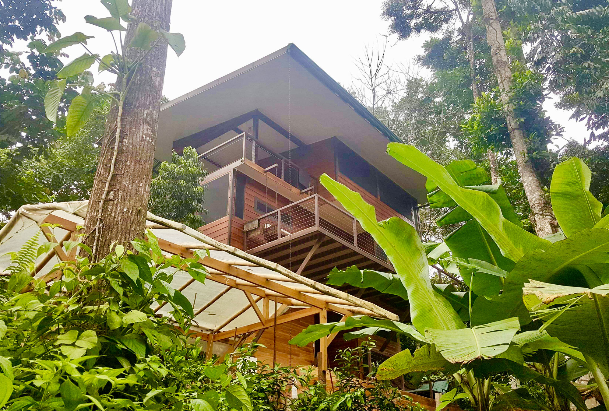 The tree house itself channels minimalist mountain chalet designs, with elegant furniture, wooden surfaces, and windows that bring nature inside. Guests have access to a large private terrace and to the common lower deck area with a pool. The Finca Bellavista community base camp also provides access to various activities and tours.