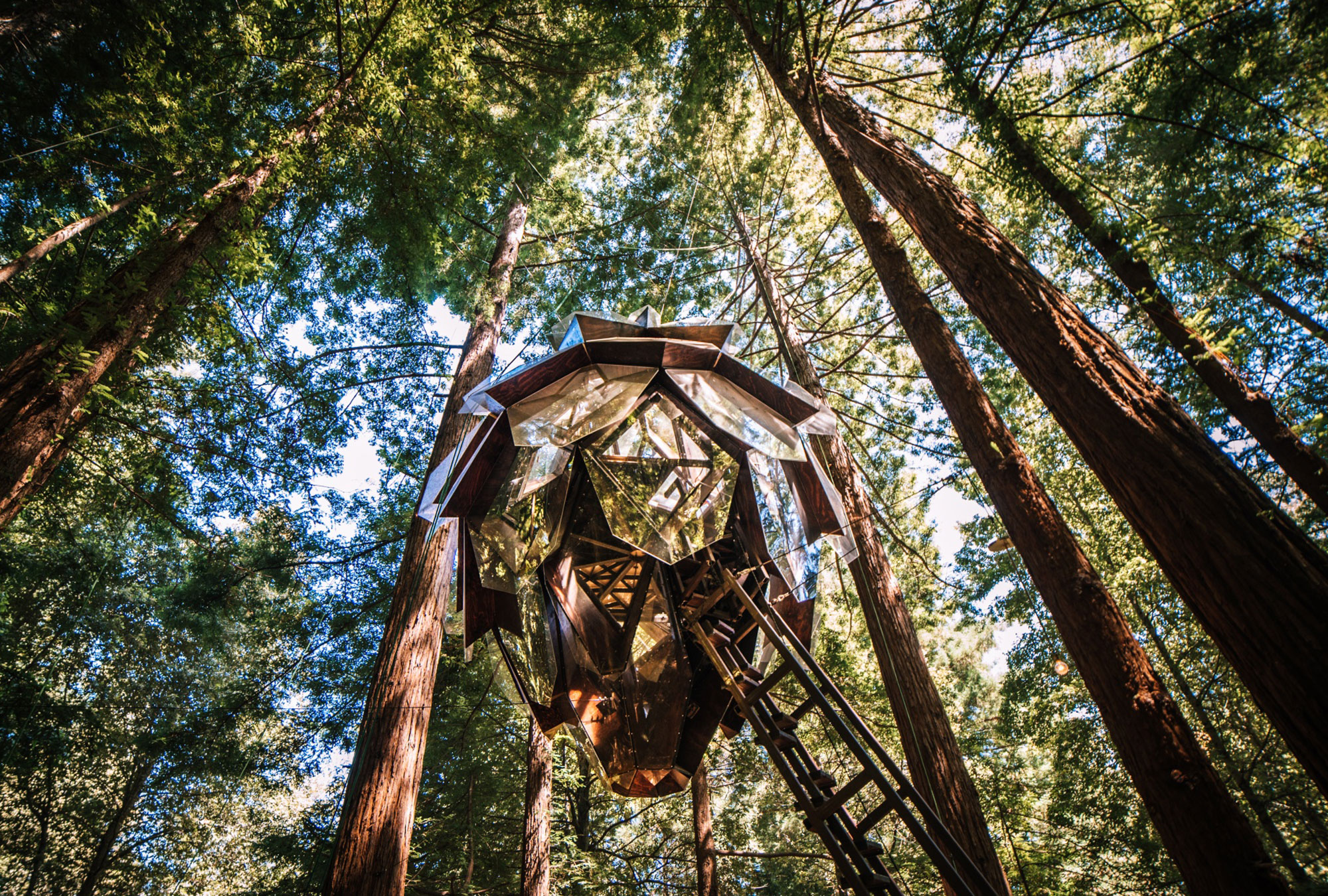 Aptly named, this tree house in California looks to the trees it calls home for inspiration. Designed by owner Dustin Feider, The Pinecone Treehouse looks like a giant pine cone suspended above the forest floor. Glass panels not only allow guests to admire the woodland freely, but also give the structure a lighter look. As the cabin sits from 35’ to 60’ above the ground, travelers need to climb a steep ladder and gain access to the interior through a trap door. Once inside, they’ll feel a part of the California Redwood forest thanks to the 360 degree views. The one-room tree house features a queen size bed, while the bathroom with a shower is placed on the ground level.