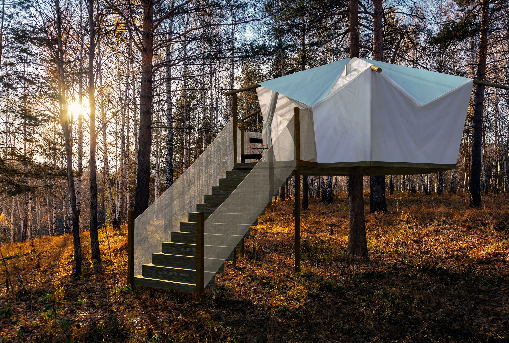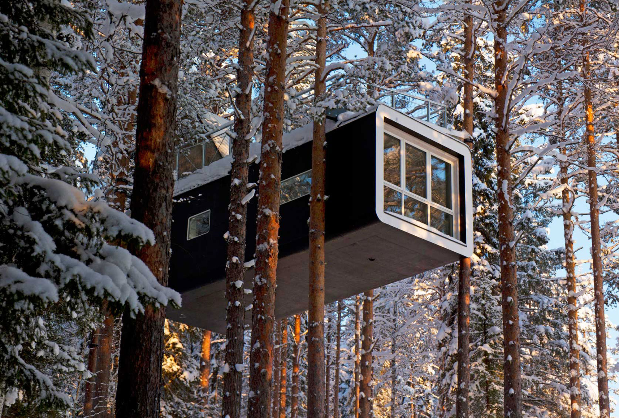 Other cabins from the Treehotel retreat include a nest-like structure, a cabin covered in mirrors, and a volume that resembles a UFO as well as a romantic retreat for two.