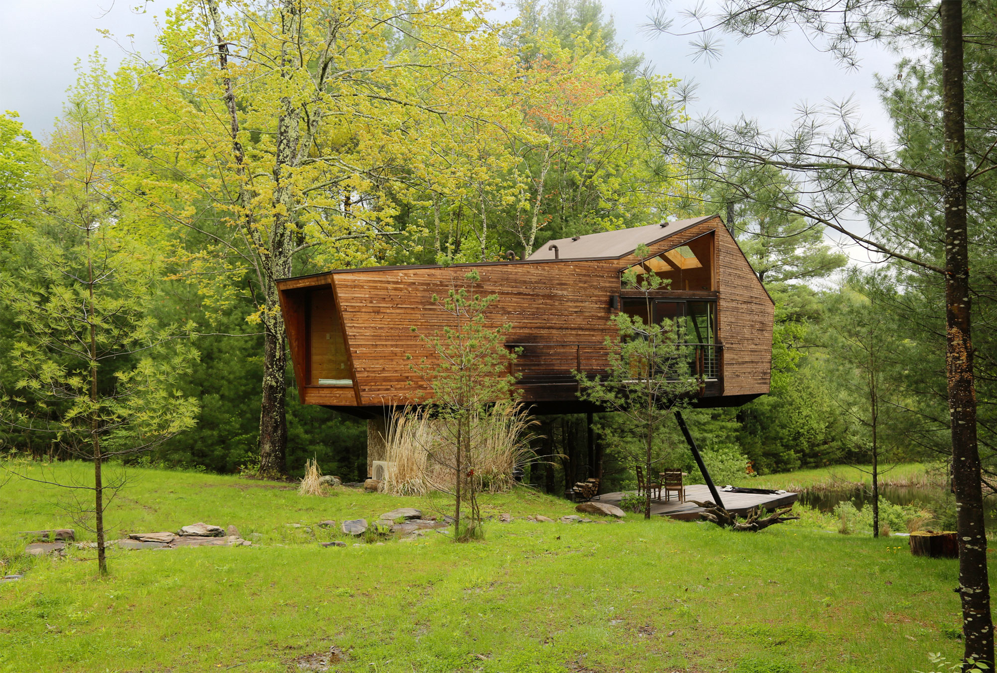 Located in Woodstock, Ulster County, only a two-hour drive from NYC, Willow Treehouse is great for couples or people looking to unwind in a secluded setting. Designed by Antony Gibbon, the tree house has a distinctly contemporary appearance but looks at home in the woodland. The main cabin cantilevers over the banks of the swimming pond below, offering amazing views of the forest and the Catskills in the distance. Guests who prefer ultra-cozy tree houses for rent will love this place.