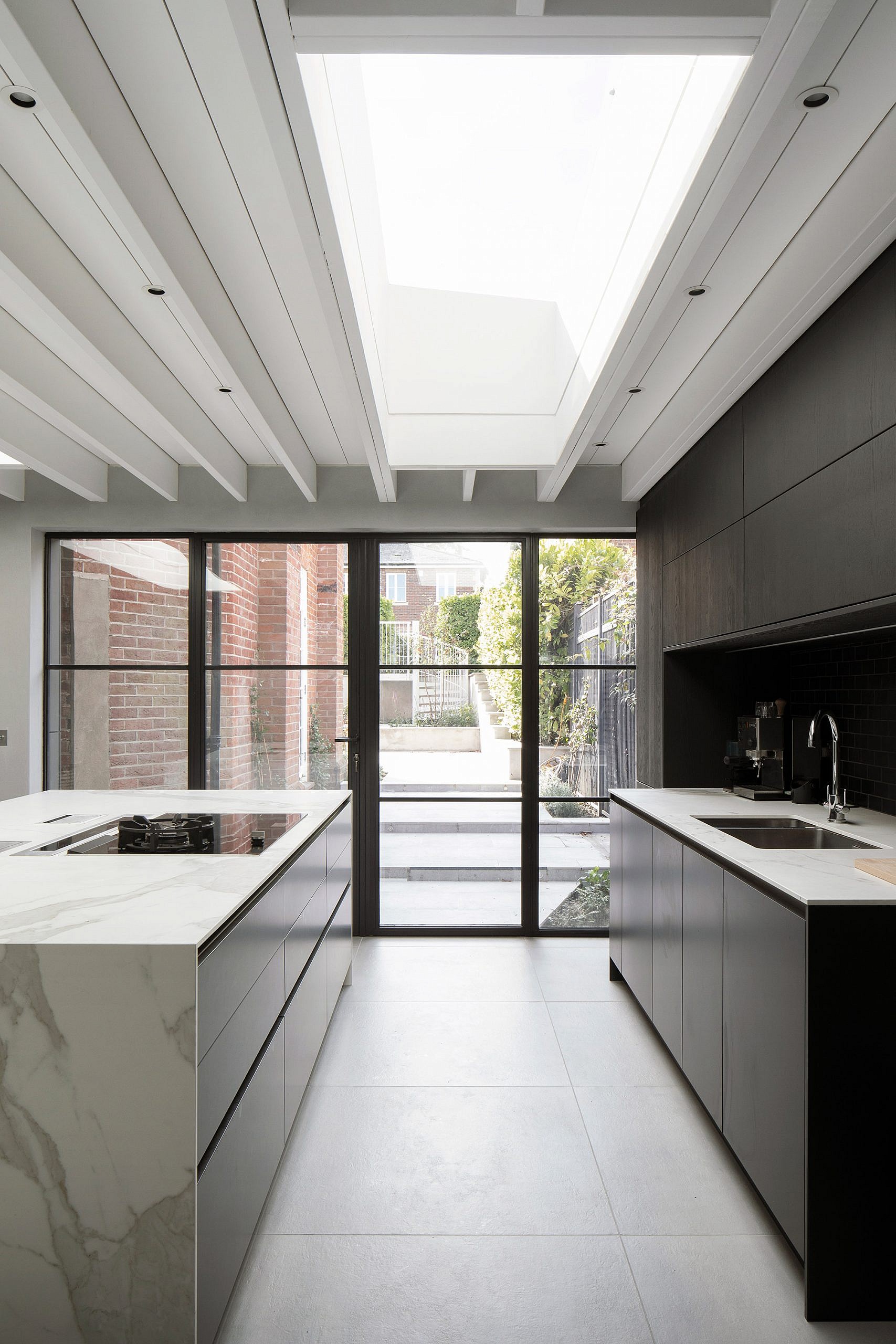 The three main areas of intervention in the master bedroom, extension, and garden building inspired the project’s name. While separate, they naturally flow into one another and create a unitary composition. Thanks to the discovery of an attic window, the master bedroom now features a vaulted ceiling with exposed timber trusses. This new feature also links the space with the more traditional garden building. The new extension that houses a kitchen and dining space has an elegant contemporary look with darker furnishings, lower ceilings, and textured walls. In this space, the inhabitants have a direct view of the garden.