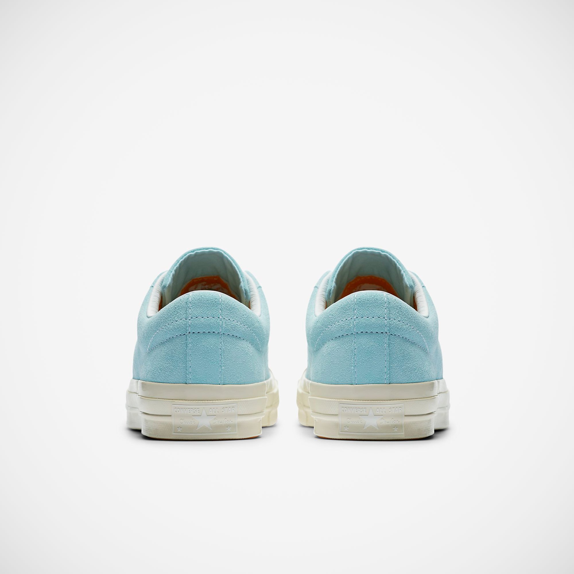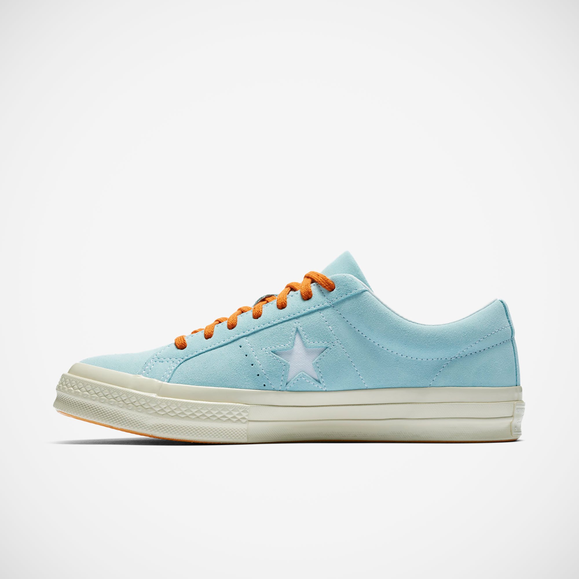 In news that sound almost too cool to be true, Tyler, the Creator and Converse have finally confirmed their collaboration. And the design looks as good as we expected from these two creative giants. Named One Star, the sneaker features a light blue “Clearwater” color, white midsole and a bright orange outsole. Laces come in either orange or white. At the heel, the signature star makes a subtle appearance, while on the side it stands out in elegant white. The interior boasts the exclusive Scum Fuck Flower Boy Graphics, adding a summer vibe to the design.