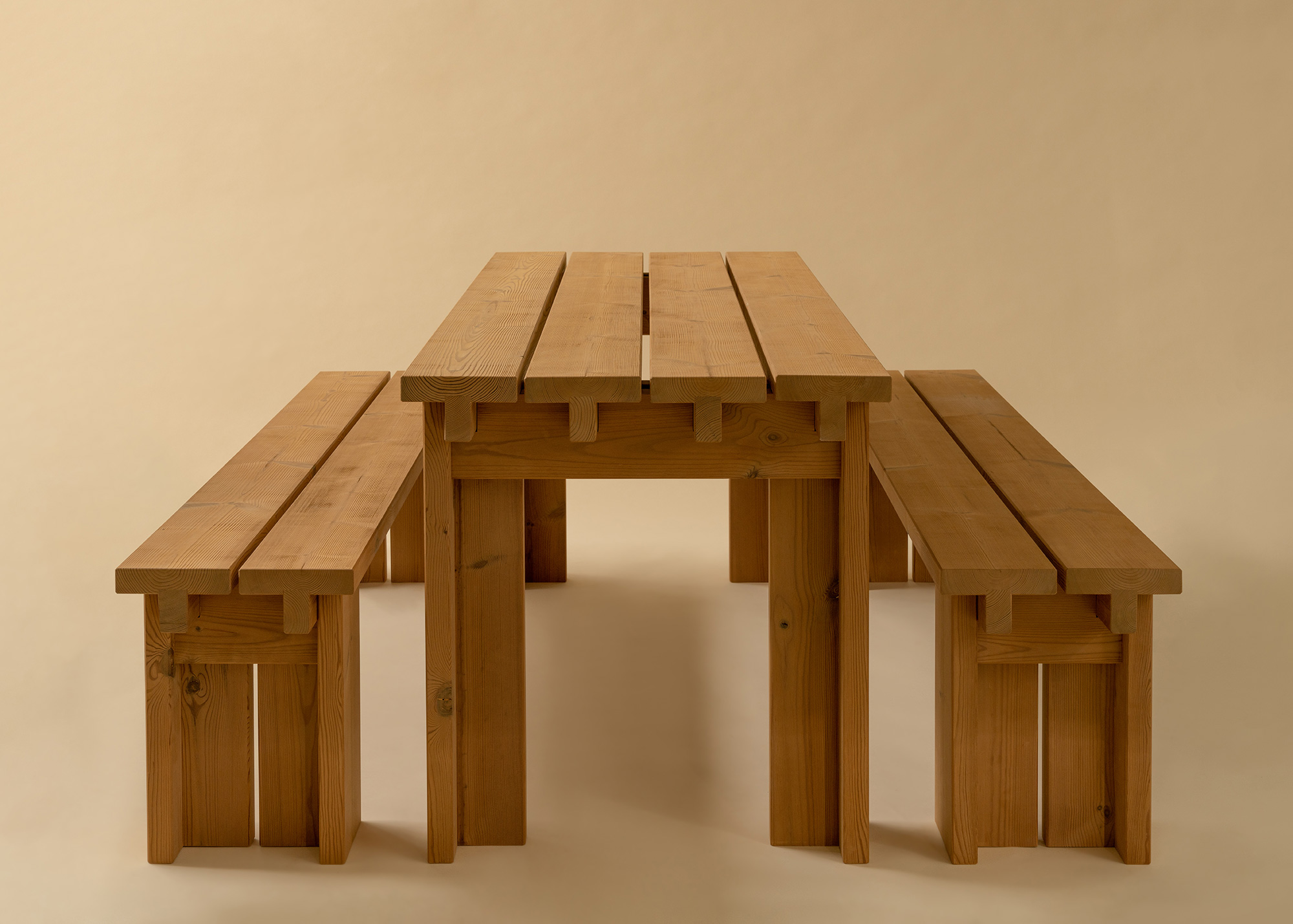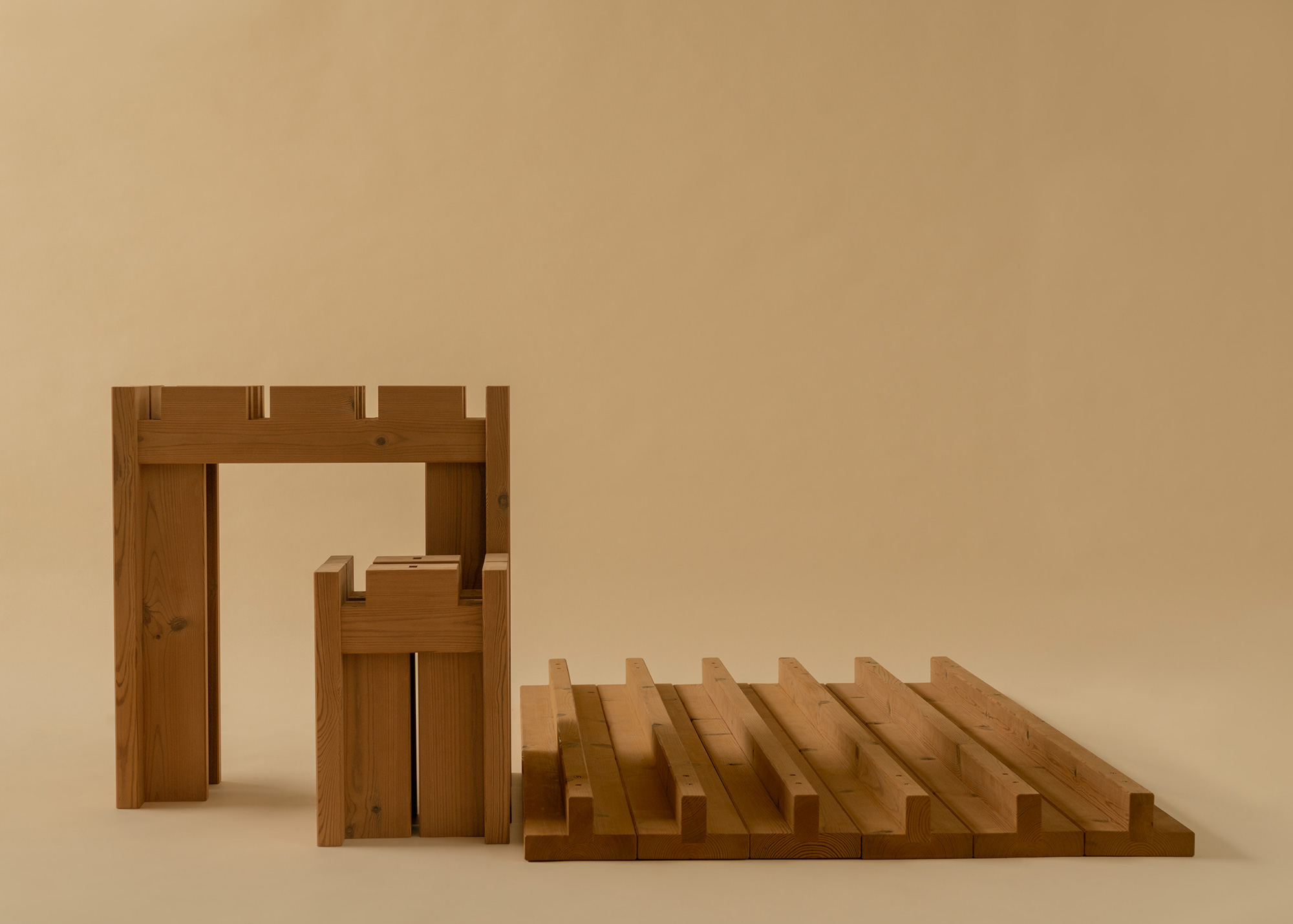 Brutalist-style furniture, lighting and home accessories made from sustainably sourced pine wood.