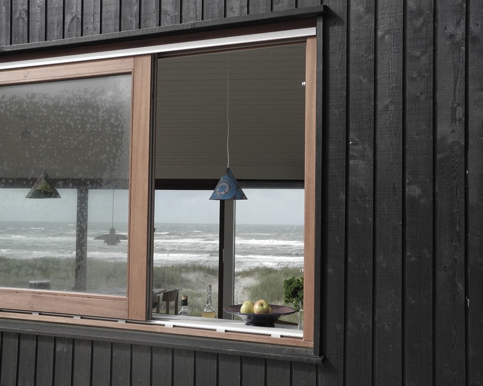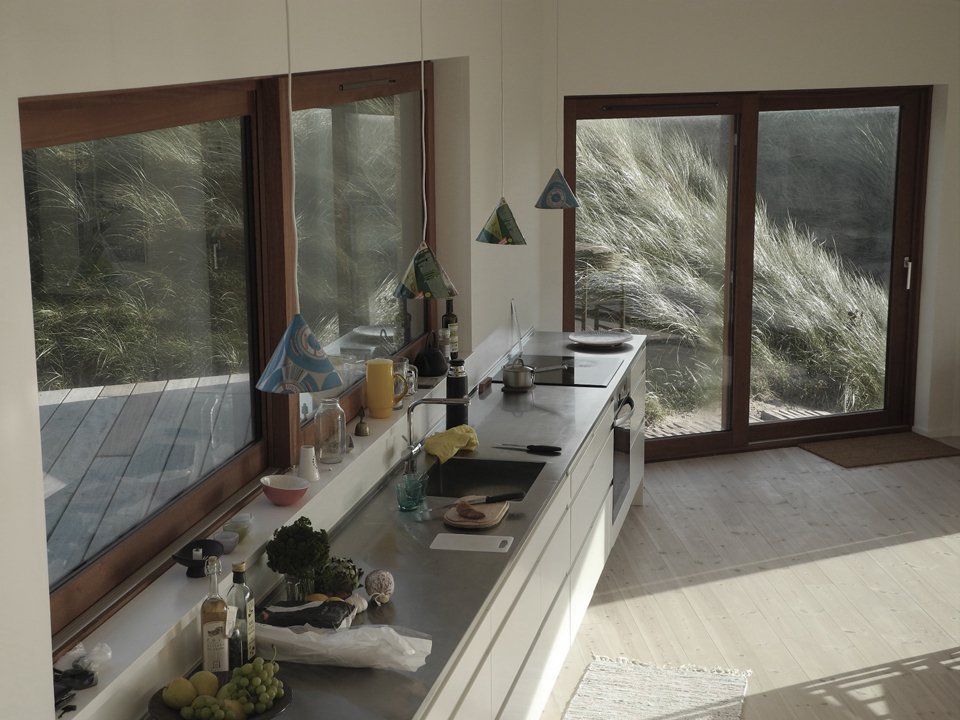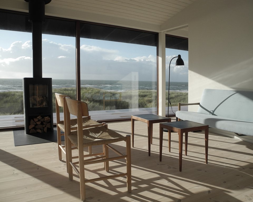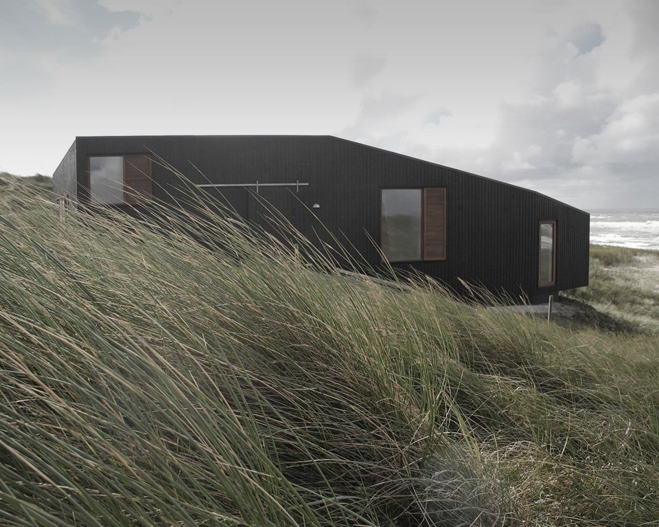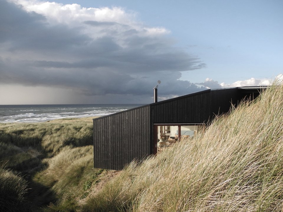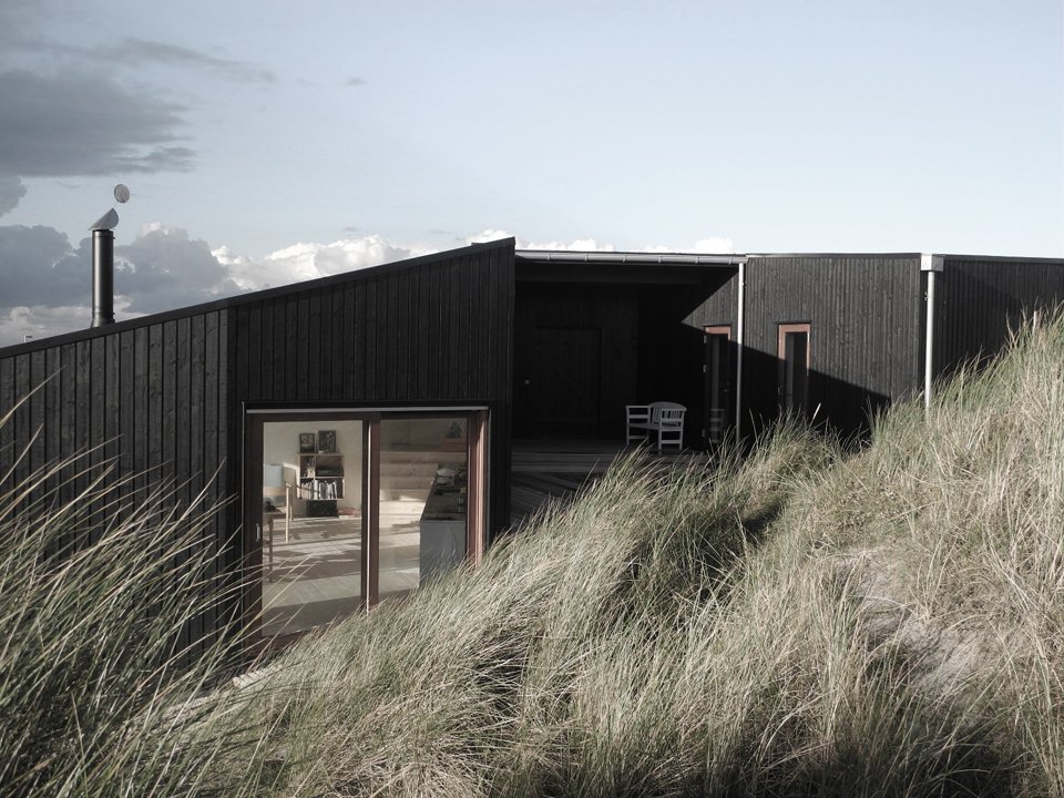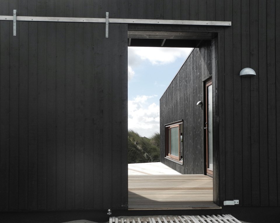 Mette Lange Architects plays with our architectural vocabulary in its design of Vacation House in Henne. The residence, located upon the banks of the Danish seashore, forces us to question the formal definition of the deck, the porch, and the veranda. The primary two living spaces of the house are divided into the portion for the family’s use and the guestroom, both sharing the roofed, yet accessible to all parties, wooden… something. This unique space that crosses both private and public circulation paths encourages a geometric conversation that begets interpersonal ones among residents, visitors, and passersby alike. Appropriately so, the contrast of the blackened pine of the façade and the white walls of the interior further highlight the middle ground as an unconventional and multipurpose “gray area.”
