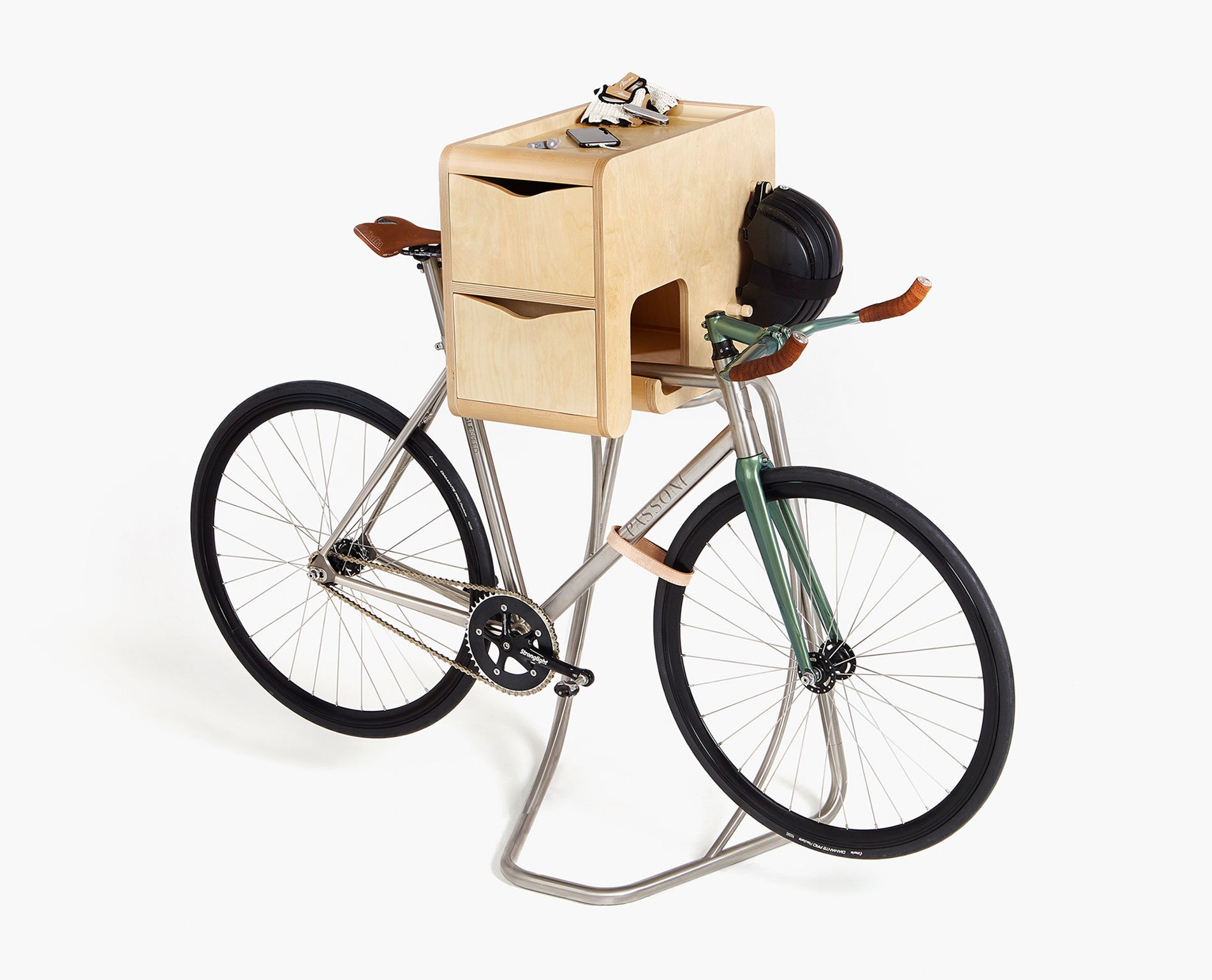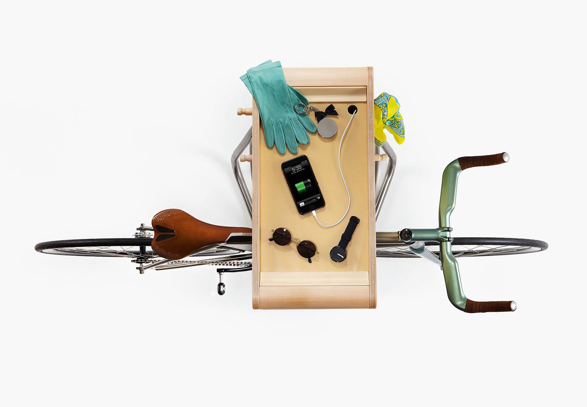 One of the most probing questions for a bike owner in an urban environment is how to store the bike when it’s not in use. Apartments can be cramped for space, so the usual solutions such as leaning it near the entryway of the house often lead to the bike getting knocked over by the swinging front door or blocking access to a front closet. Some more enterprising individuals may spring for a bike rack on a free wall, but these can be unsightly as well as expensive. Then there is the question of where to store all the accessories, including helmets, locks etc. that one needs to bike safely in a city. To combat this design problem, Vadolibero has developed a bike shelving system that incorporates the bike into the space of the apartment and organizes around the rider’s needs. The shelves are free standing, with drawers to ensure all a cyclist’s accouterments are in a secure location and hooks to hang locks or helmets. The design allows bikes of all sizes to be securely clamped to the shelves, so that it will never fall over when not in use. And with an array of different veneers available, the shelves can match a home’s furniture with or without a bike in tow. Along with the smaller design for tighter spaces, Vadolibero has also developed a larger clothes rack that doubles as a bike rack, with a built in lamp to cast light on the frame. These projects combine a love for cycling and carpentry, and elegantly solve a space issue the urban cyclist often faces.