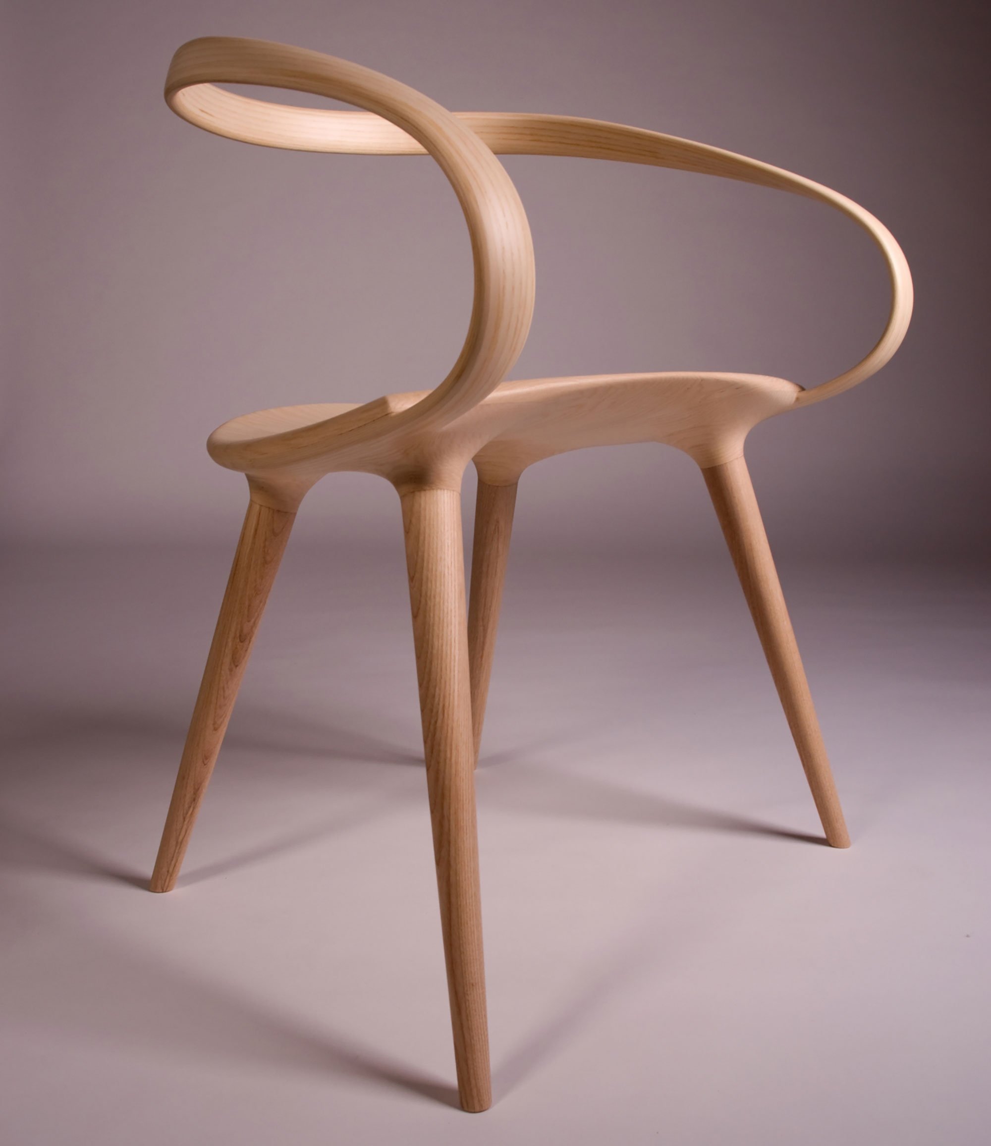 The Velo Chair designed by Jan Waterston is a great example of how good design and a creative concept can reinvent an everyday item to lend it an intriguing beauty. A fundamentally static object, the chair, has been redefined here as a dynamic piece of furniture that is a functional item as much as it is an illustration of exquisite craftsmanship and creativity. The overall shape of the chair, flowing and transforming as it envelops the body of the person using it, is inspired by modern bicycles. “This relationship between body and object is echoed in bicycle design with tubes flowing seamlessly into one another, constantly changing shape, to improve function and aesthetic”, says the designer. The hand sculpted chair is made of ash wood and features a seamless construction. Various elements blend into one another, making the bent backrest and the slim legs seem crafted from a single piece of wood, in a beautiful design that gives a ubiquitous object a sculptural appearance. Photography by Lourival Junior.