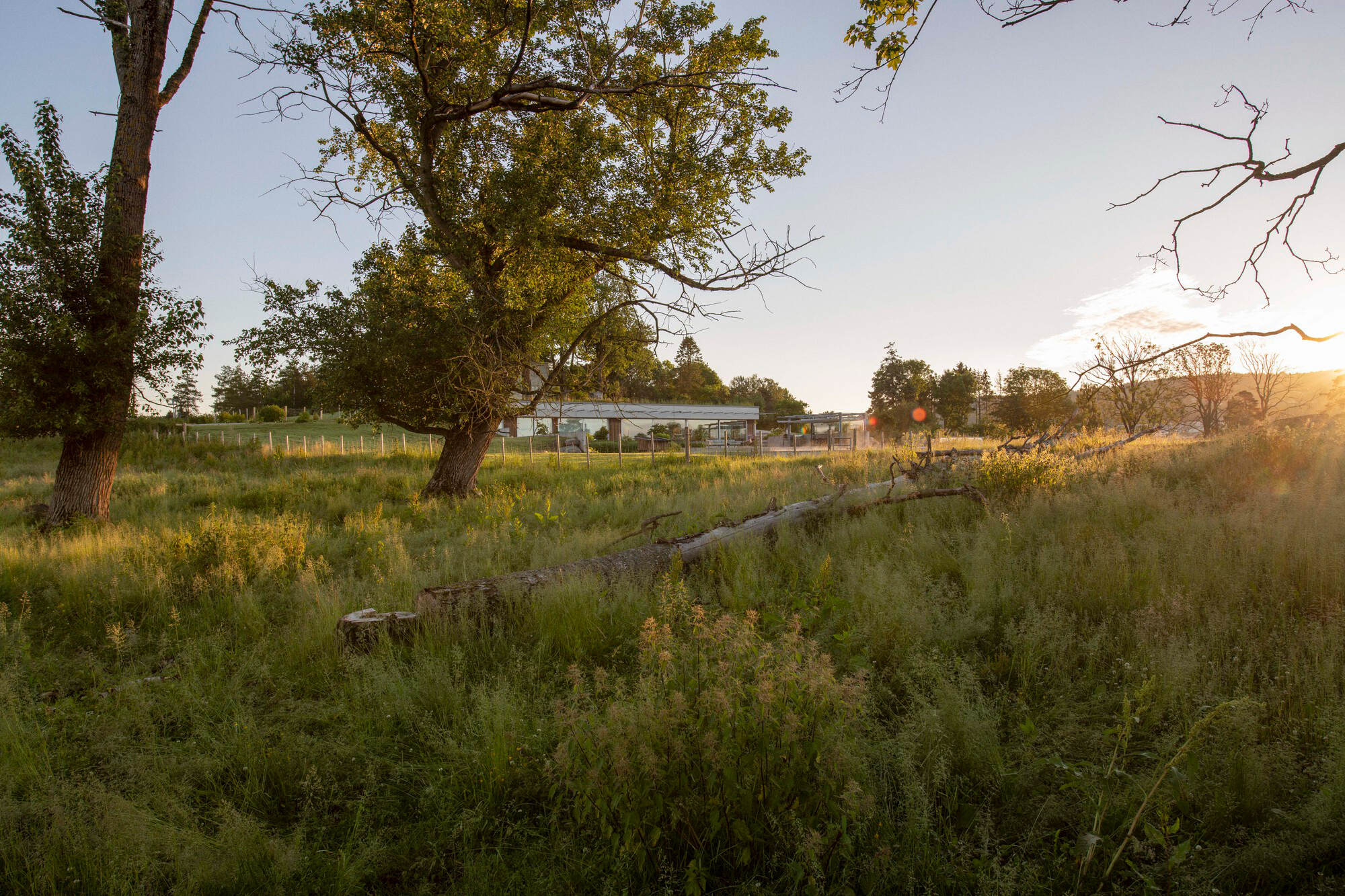 A concrete house nestled in the countryside alongside an old farmhouse.