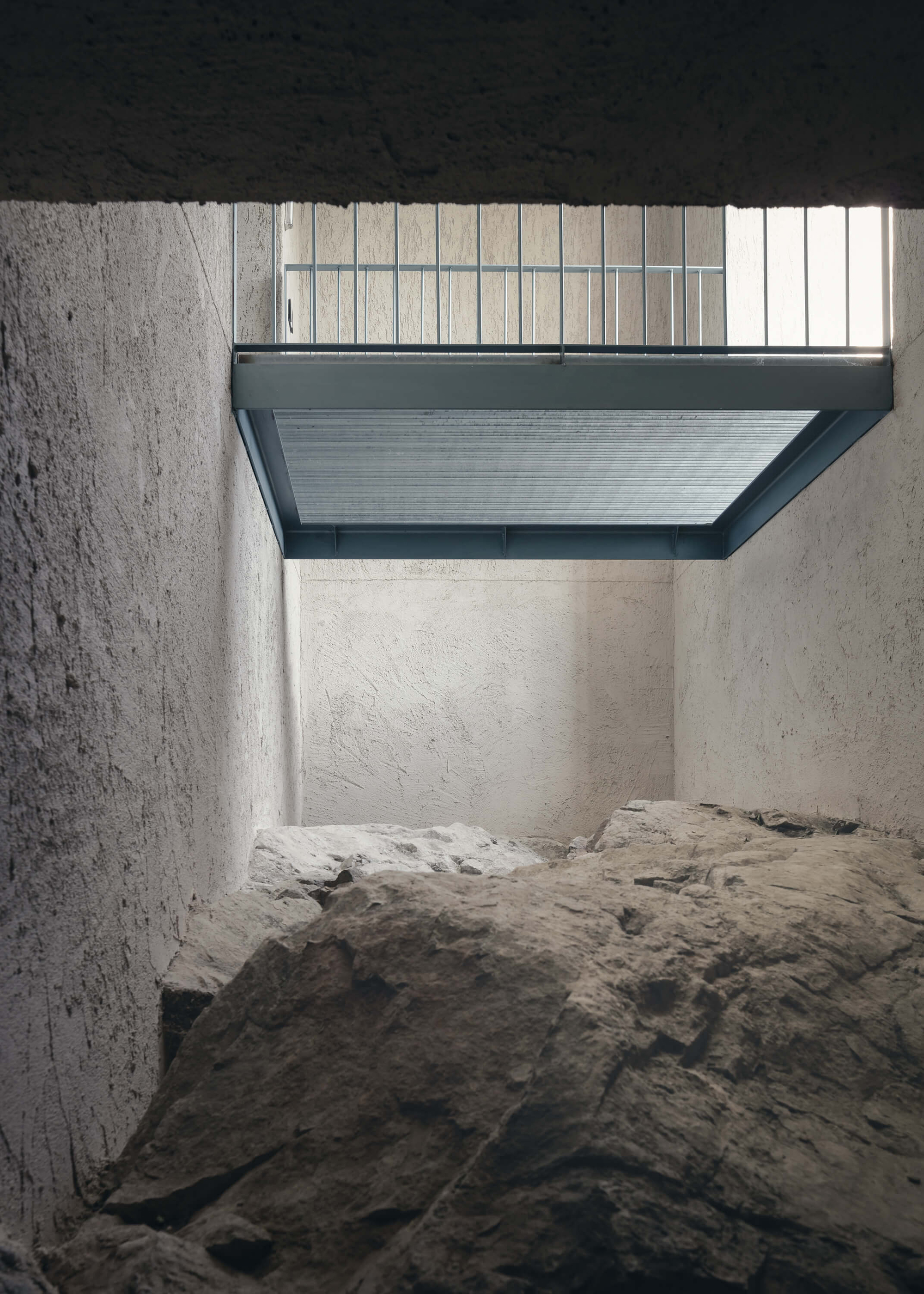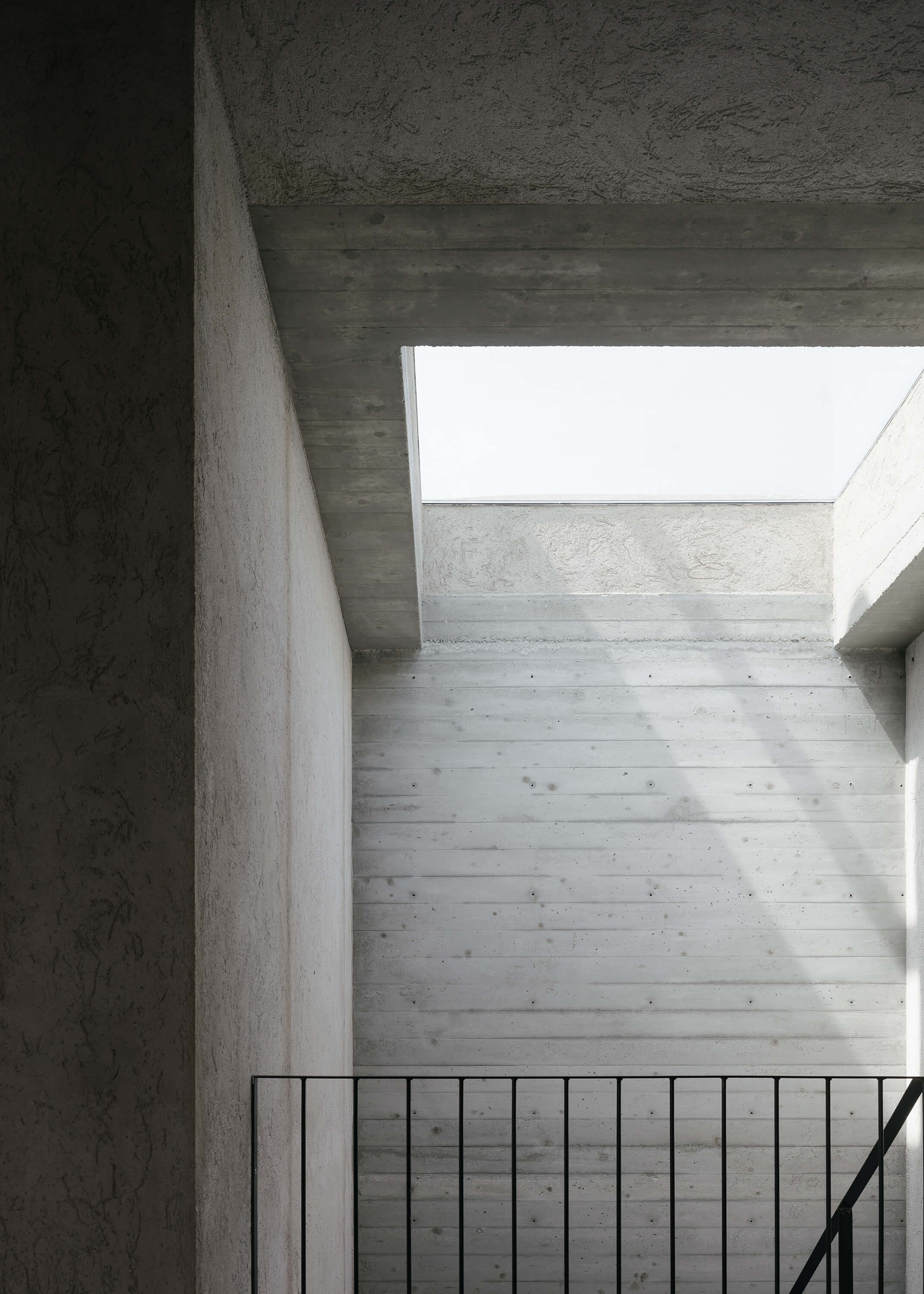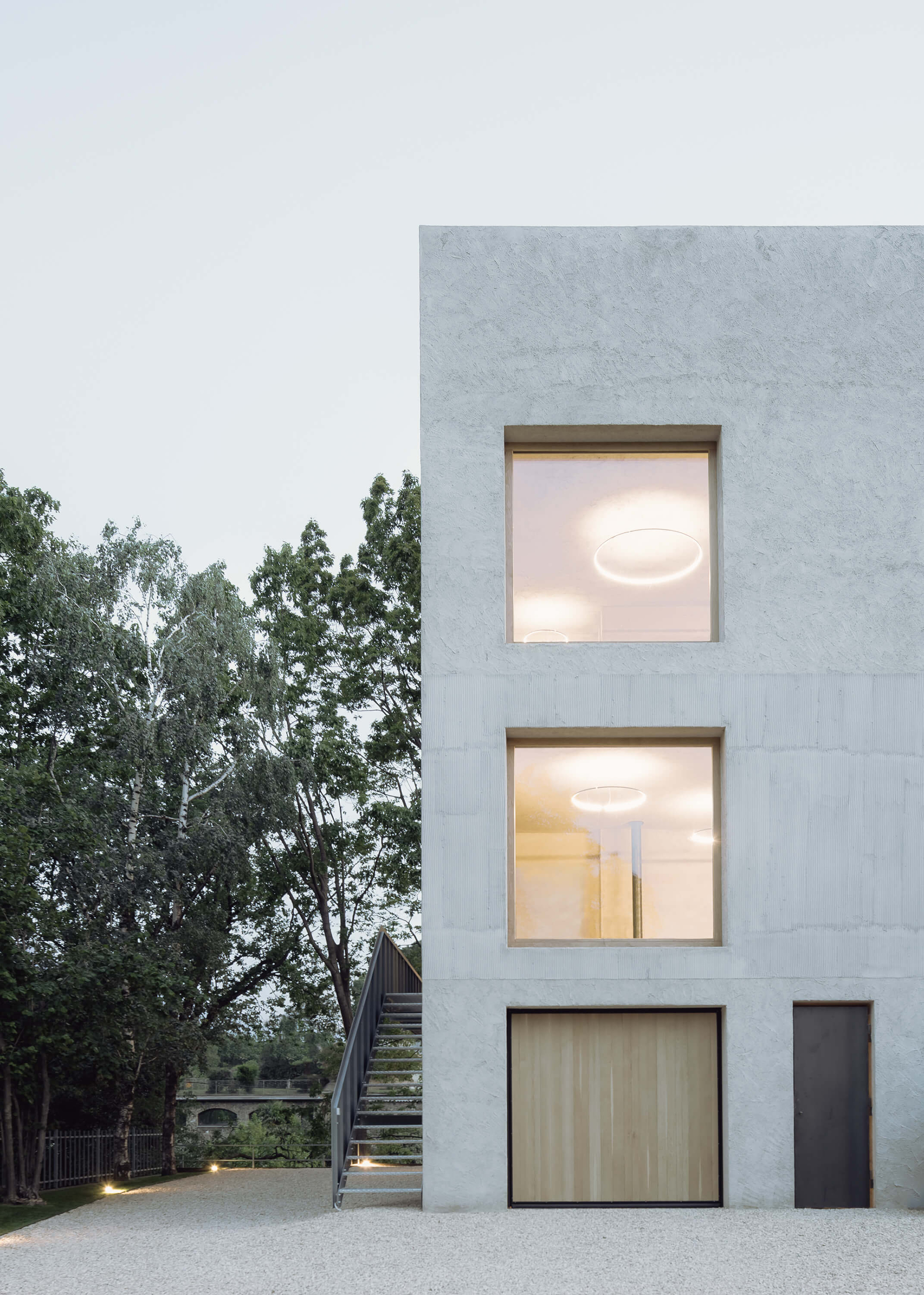A colored metal staircase runs around the entire house; it gives independent access to the apartments and to the rooftop terrace. This element also adds a sculptural accent to the brutalist exterior. On the ground floor, there’s a garage and a cellar that incorporates parts of the rock formation. An elevator and an interior stairwell offer access to the dwellings. The first floor contains two smaller apartments that share a flexible living space, while the second floor houses the third, larger apartment. From the rooftop, one can admire forest and mountain views while relaxing in the swimming pool. Photographs© Aldo Amoretti.