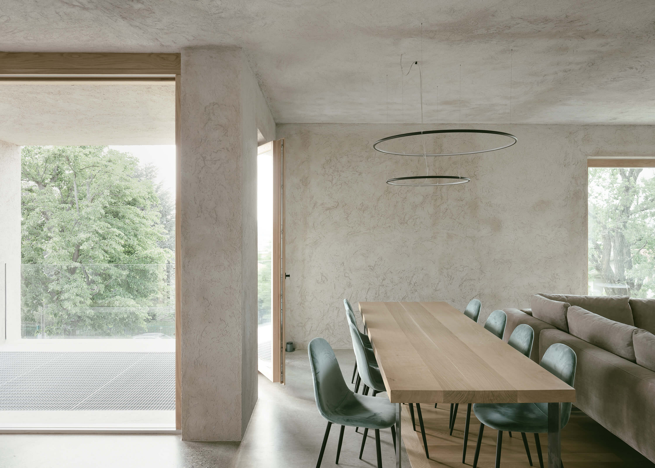 Located in a quiet residential area, the house offers views of the Alps and the Serra Moraine of Ivrea. The architects preserved the rock formation at the base of the building and made it a feature of the design. Thanks to carefully positioned openings and double-height spaces, the rock remains visible from all floors. The team also transformed the original layout of the living spaces, creating three separate apartments, each with its own entrance. Different facade finishes differentiate between the homes.