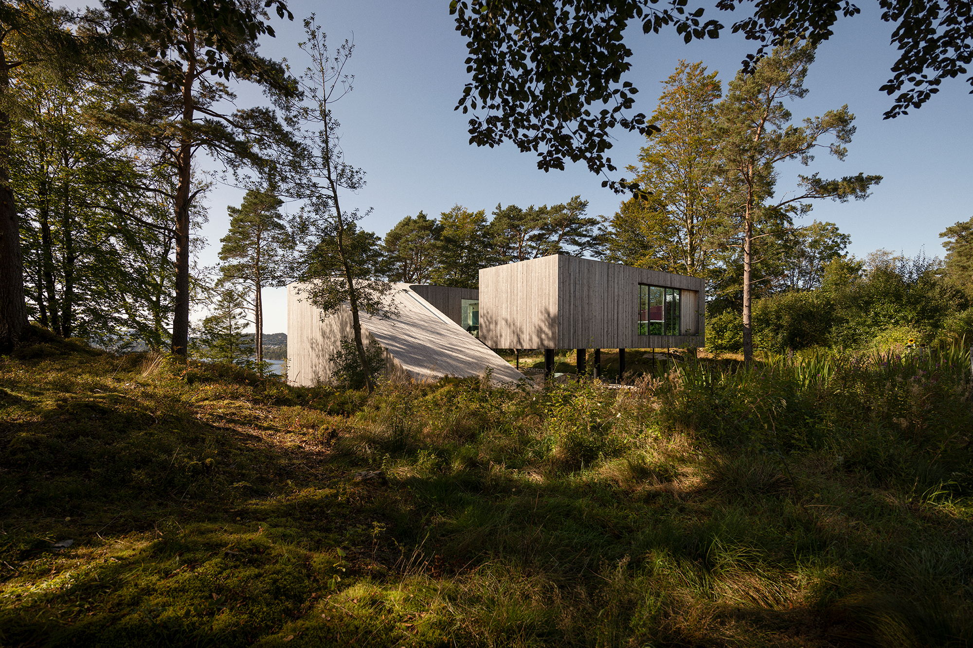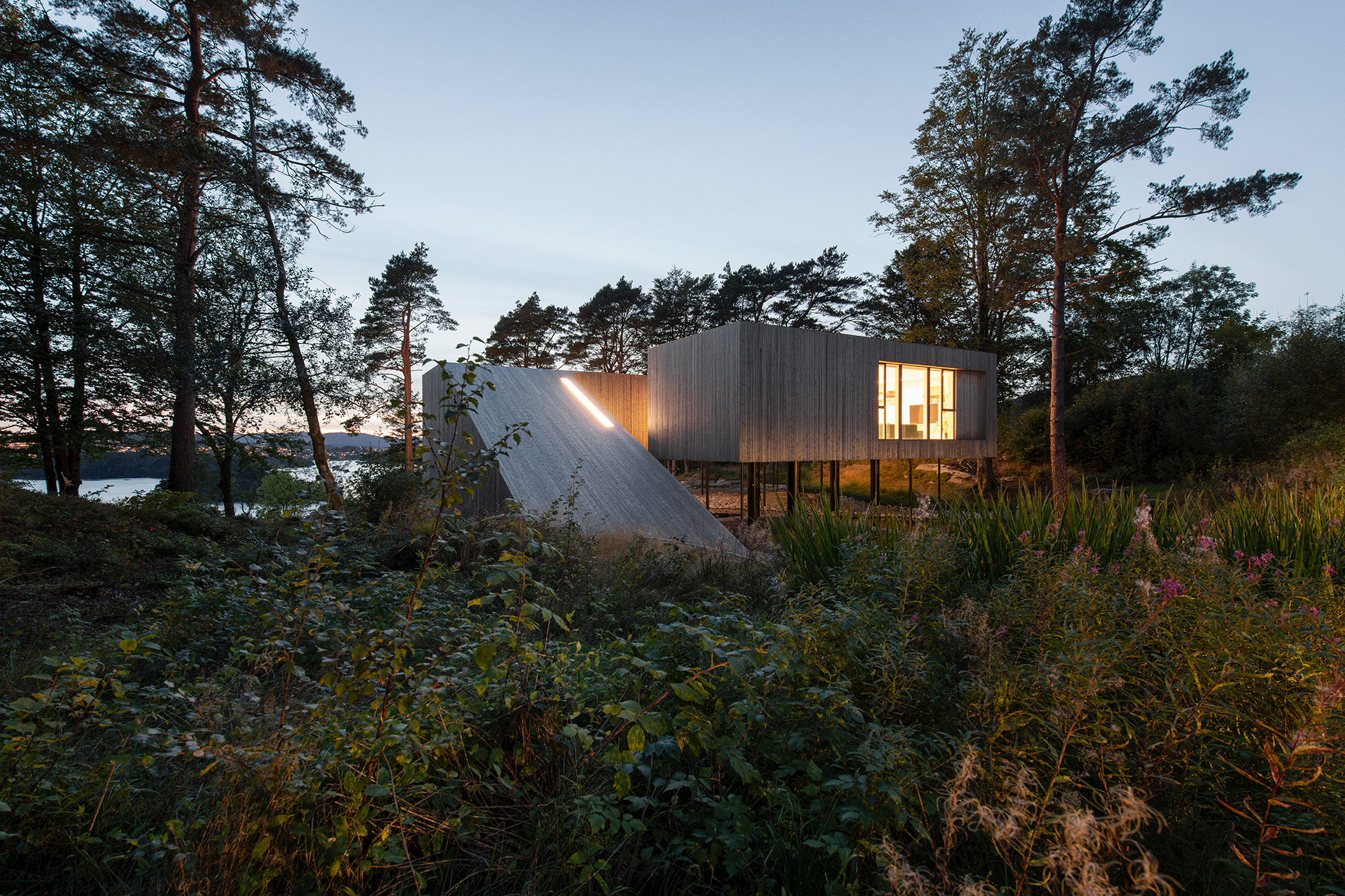 Built on a hill on the outskirts of the city of Bergen, Norway, Villa Grieg is specially designed as a viewfinder that brings the inhabitants closer to spectacular views of Lake Nordås and its small islands. Saunders Architecture worked closely with the client, musician Alexander Grieg, to design the “forever” family home and adjacent music studio. The family has deep roots in the area, as Alexander Grieg’s great, great, great grandfather’s cousin was none other than renowned composer Edvard Grieg. In the 1880s, he commissioned architect Schak Bull to design a summer house in the same location. Named “Troldhaugen”, or “Troll Hill”, that house still stands just down the hill from the new Grieg family home. Consequently, Villa Grieg has a poetic connection to the area.