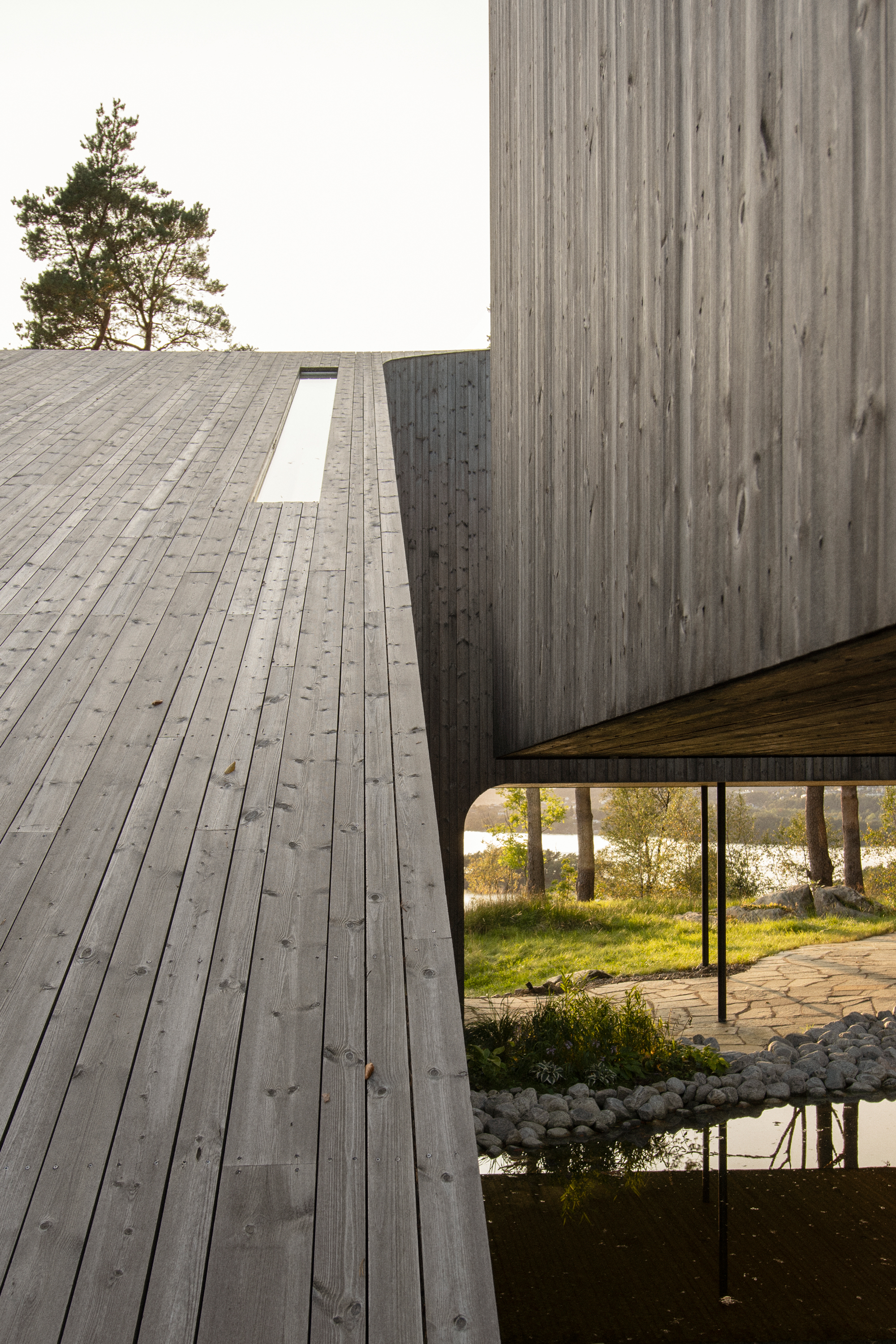 The triangular volume houses the music studio and a storage space as well as the entrance and a staircase. Elevated just above the tree line, the main living spaces open to gorgeous views of the lake. This open-plan area contains the kitchen, dining room, and living room. Glass sliding doors that reach the ceiling open to link this space with nature. This wing also contains two bedrooms and a semi-sheltered terrace on the north-eastern corner of the house. A television room adds a buffer layer between the family rooms and the master bedroom. The studio purposefully kept the footprint of the house as compact as possible and built it within the natural landscape. On this project, Saunders Architecture collaborated with Michelsens Interiør on interior design and with Ragni Helweg on landscape design. Photographs© Ivar Kvaal.
