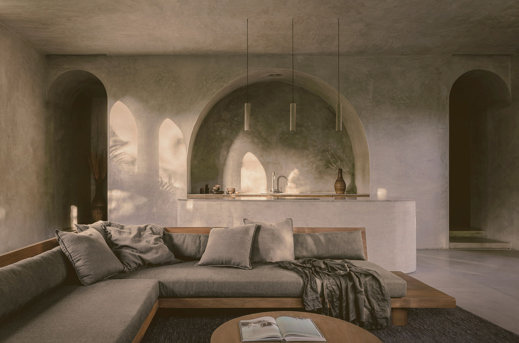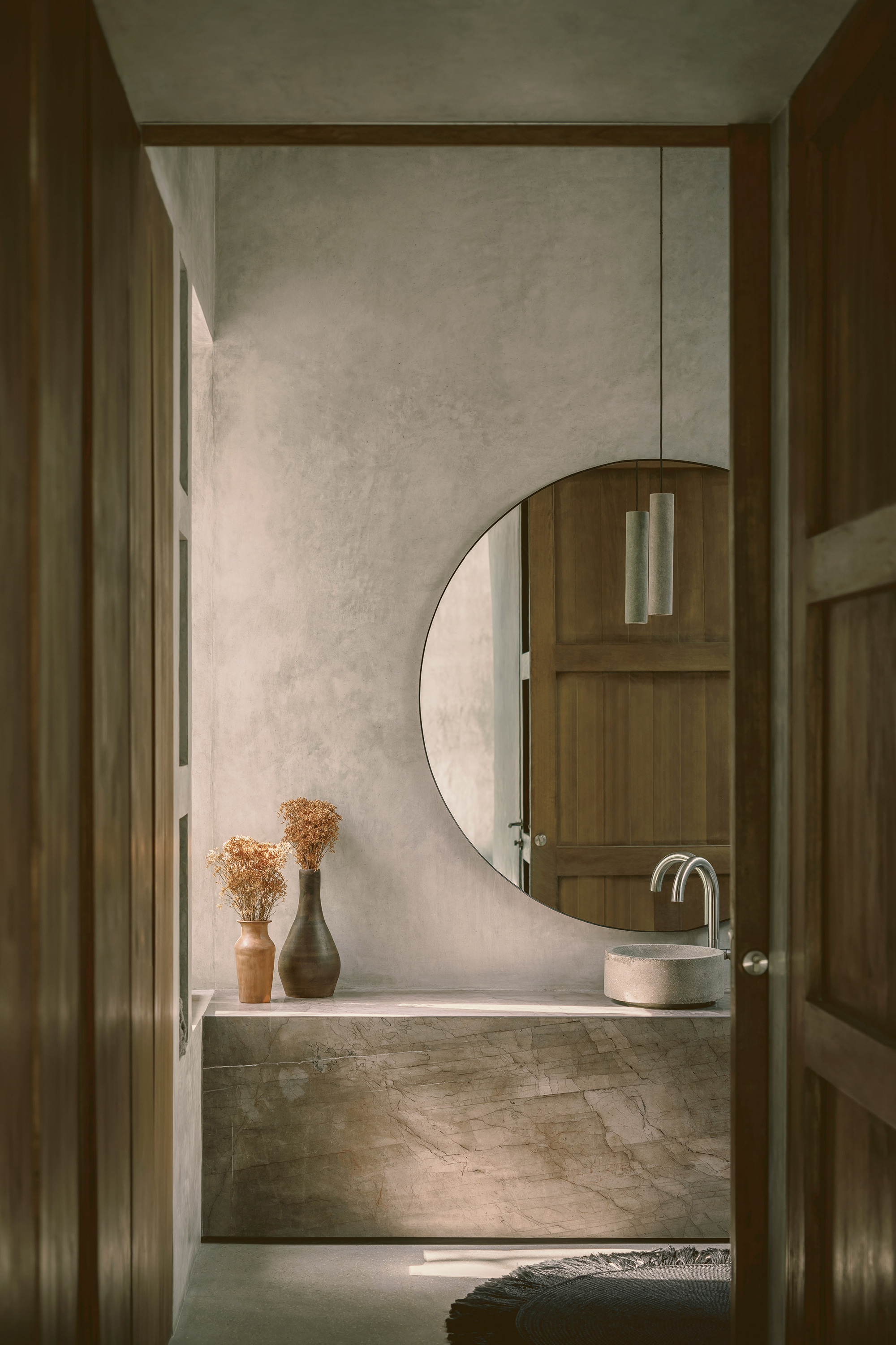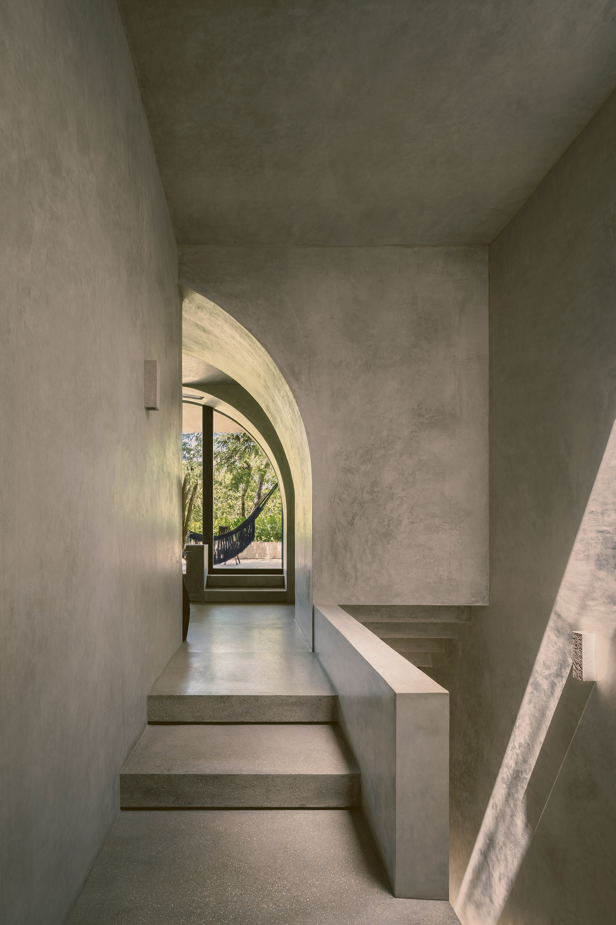 Built in Tulum, Mexico, Villa Petricor takes inspiration from nature and the concept of stillness for its sculptural design. Local architecture firm CO-LAB Design Studio designed the three-bedroom house with a sense of fluid movement that creates a strong dialogue between indoor and outdoor spaces. The name of the project refers to “petrichor”, the earthy scent caused by rain drops infiltrating dry soil. The word also evokes the concept of renewal and the birth of new life. Oriented to make the most of the path of winds, the house also protects existing tree clusters. At the entrance, the studio designed a concrete screen that filters the light. The motif of the arch repeats throughout the house, from the curved openings that overlook the lush gardens to arched nooks.