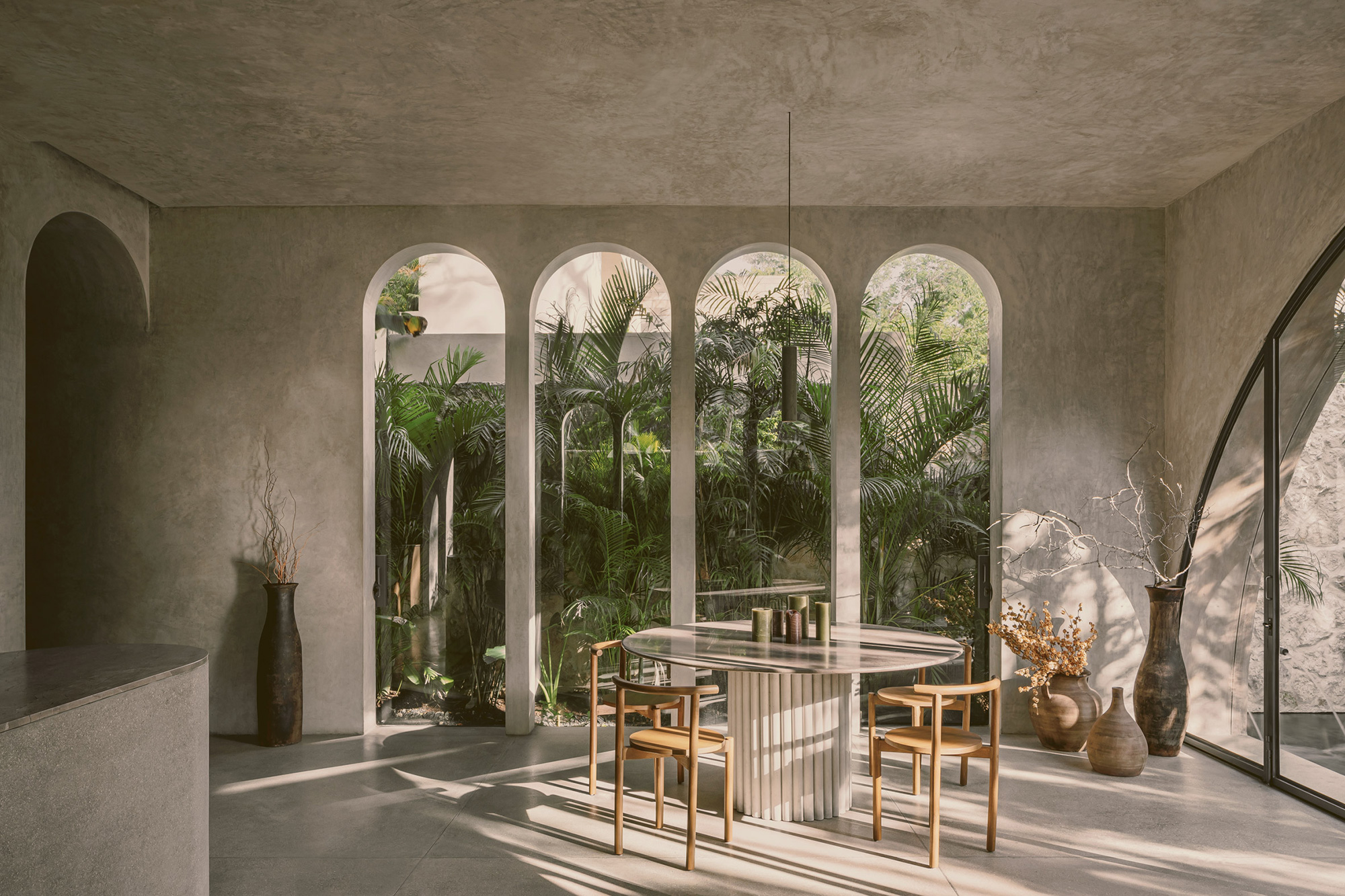 A resort-like house designed with arched openings that welcome a tropical garden into the living spaces.