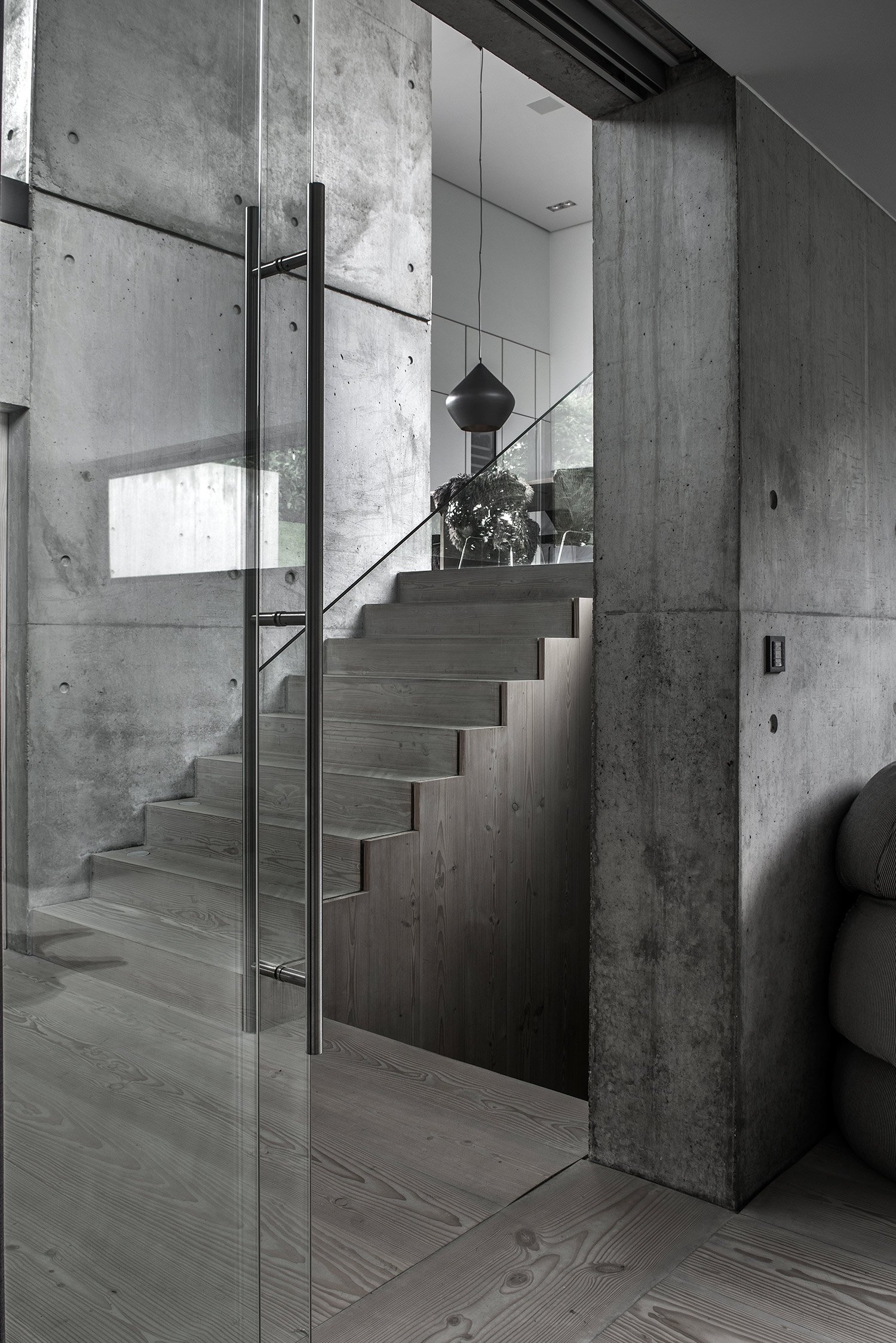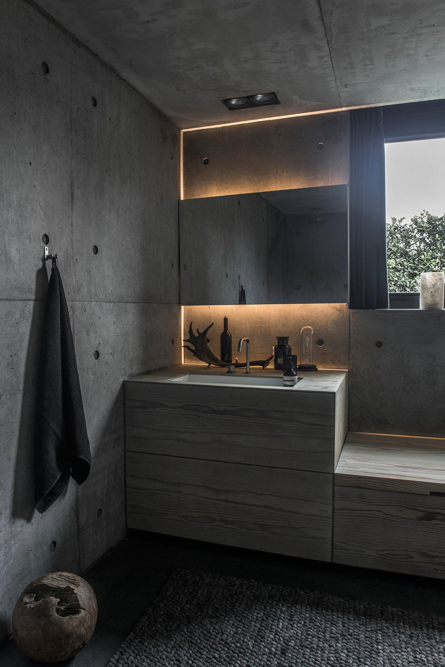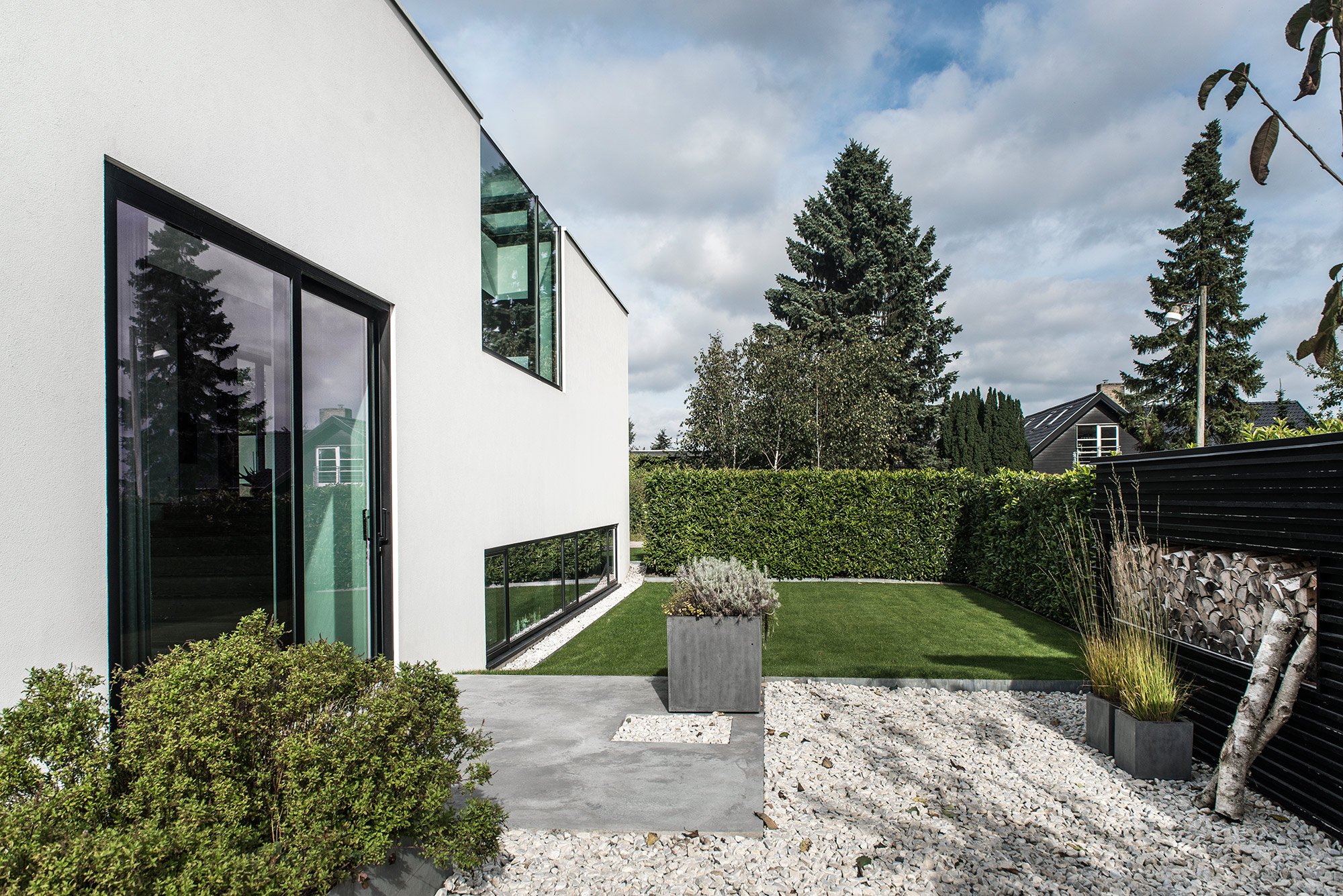 Simple geometry and structural dynamism create a unique residential space in Risskov, Denmark. Villa V3 is designed by ARDESS as a single family home with four levels and an integrated garage, and it’s a striking example of modern Scandinavian architecture and design. The facade offers privacy thanks to the asymmetrical windows placed at a higher level, continuing over the roof to both maximize the amount of light reaching the interior and to create a calm, almost ethereal ambience by providing views of the trees and the sky. The other side of the building, facing the garden, contrasts the closed appearance of the front of the house. Here, everything is open and connected to nature. Various levels are nuanced by concrete walls cast in-situ, continuing inside the home to become the defining feature of the interior and providing a link between enclosed living spaces and the terraces. The careful planning of the home’s four levels and rooms is also present in the garden layout. Trees have been positioned to strike the right balance between offering privacy and creating the perfect view. A lounge and dining area were added to two different platforms of the outdoor space, but large glass windows and doors always provide a glimpse at the green landscape. The interior features concrete walls and ceilings, with light and slightly muted brown Douglas timber and linoleum materials, but also numerous pieces of custom made furniture that include tables and cabinets in the kitchen and bathroom. The colors are dark and refined, with gray tones dominating the palette, joined by black and white, and the occasional chocolate brown and bronze accents. This choice of colors makes the blue sky and the green plants and grass stand out even more, complementing the contemporary and modern design. In Villa V3, sophisticated and organic features are brought together in harmony to create a stylish home where the use of clever angles, glass and concrete maximize the potential of both indoor and outdoor spaces. Images courtesy of ARDESS.