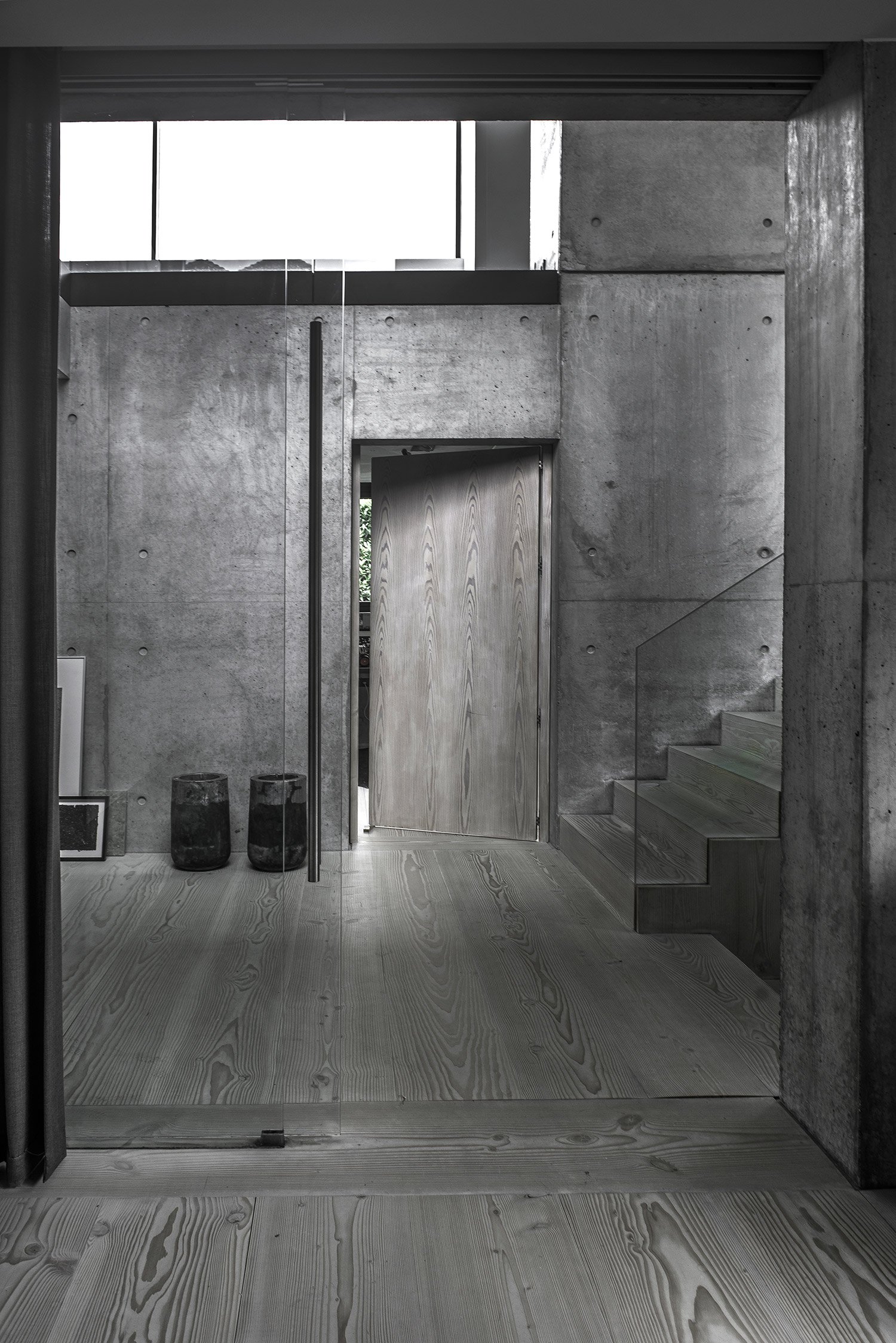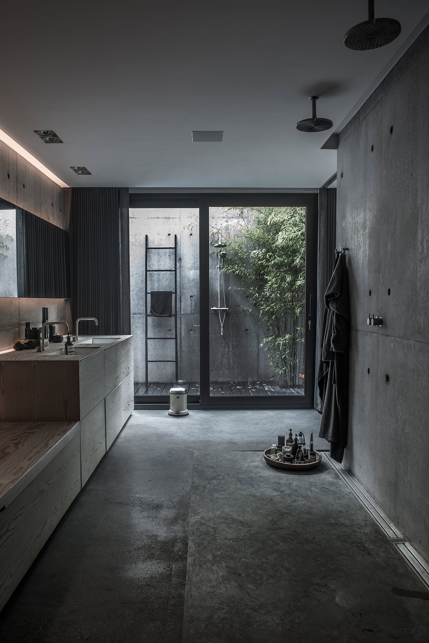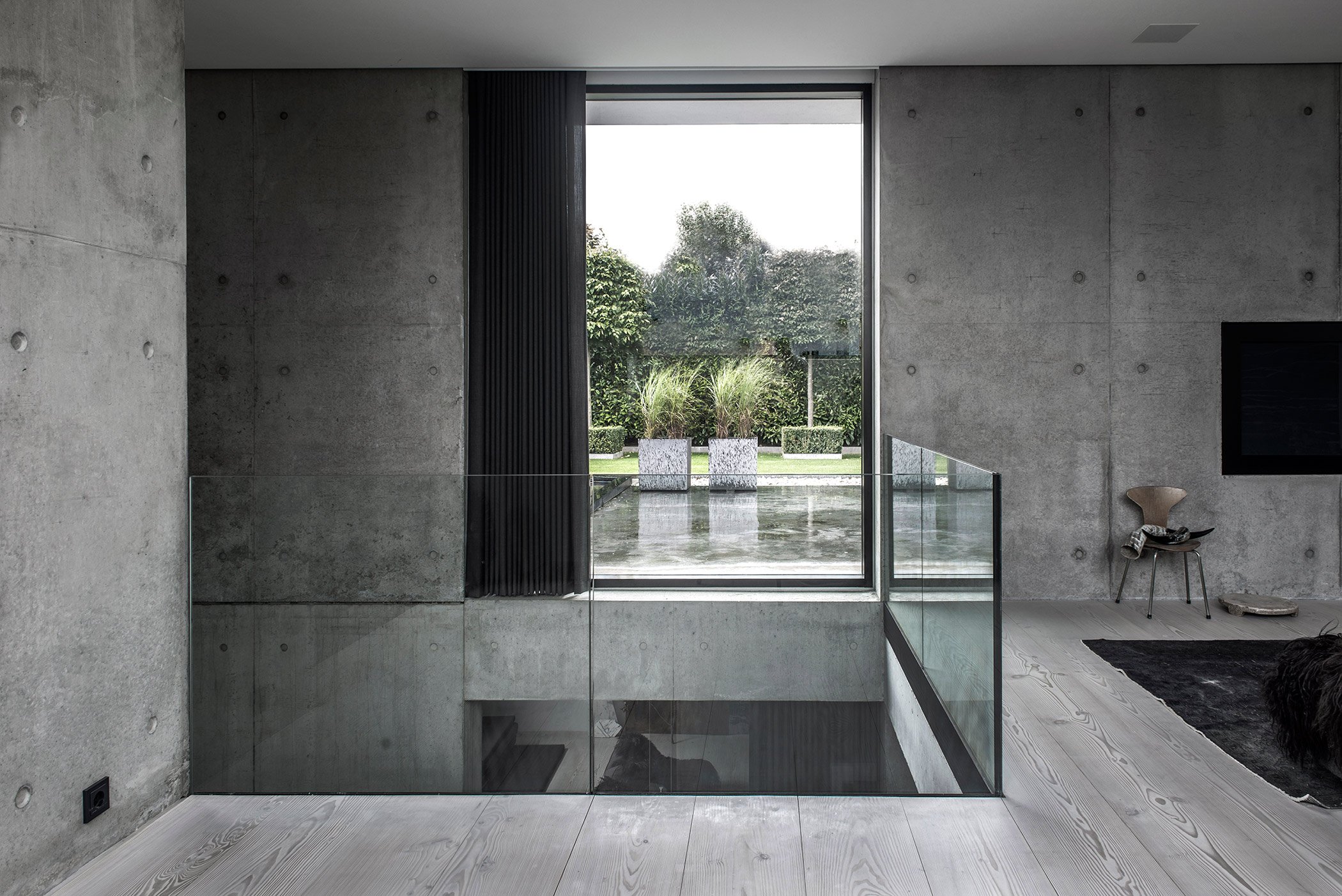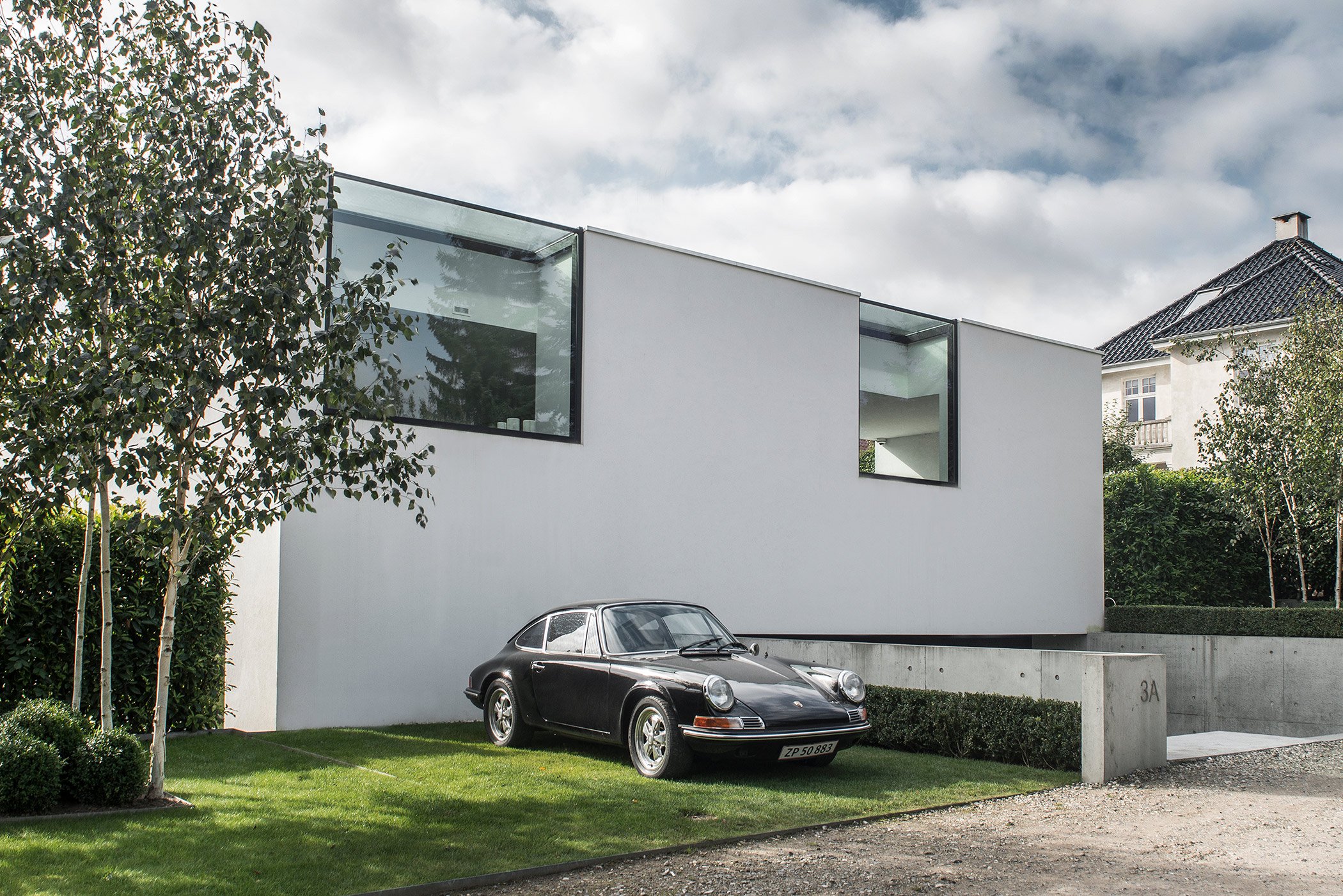 Simple geometry and structural dynamism create a unique residential space in Risskov, Denmark. Villa V3 is designed by ARDESS as a single family home with four levels and an integrated garage, and it’s a striking example of modern Scandinavian architecture and design. The facade offers privacy thanks to the asymmetrical windows placed at a higher level, continuing over the roof to both maximize the amount of light reaching the interior and to create a calm, almost ethereal ambience by providing views of the trees and the sky. The other side of the building, facing the garden, contrasts the closed appearance of the front of the house. Here, everything is open and connected to nature. Various levels are nuanced by concrete walls cast in-situ, continuing inside the home to become the defining feature of the interior and providing a link between enclosed living spaces and the terraces. The careful planning of the home’s four levels and rooms is also present in the garden layout. Trees have been positioned to strike the right balance between offering privacy and creating the perfect view. A lounge and dining area were added to two different platforms of the outdoor space, but large glass windows and doors always provide a glimpse at the green landscape. The interior features concrete walls and ceilings, with light and slightly muted brown Douglas timber and linoleum materials, but also numerous pieces of custom made furniture that include tables and cabinets in the kitchen and bathroom. The colors are dark and refined, with gray tones dominating the palette, joined by black and white, and the occasional chocolate brown and bronze accents. This choice of colors makes the blue sky and the green plants and grass stand out even more, complementing the contemporary and modern design. In Villa V3, sophisticated and organic features are brought together in harmony to create a stylish home where the use of clever angles, glass and concrete maximize the potential of both indoor and outdoor spaces. Images courtesy of ARDESS.