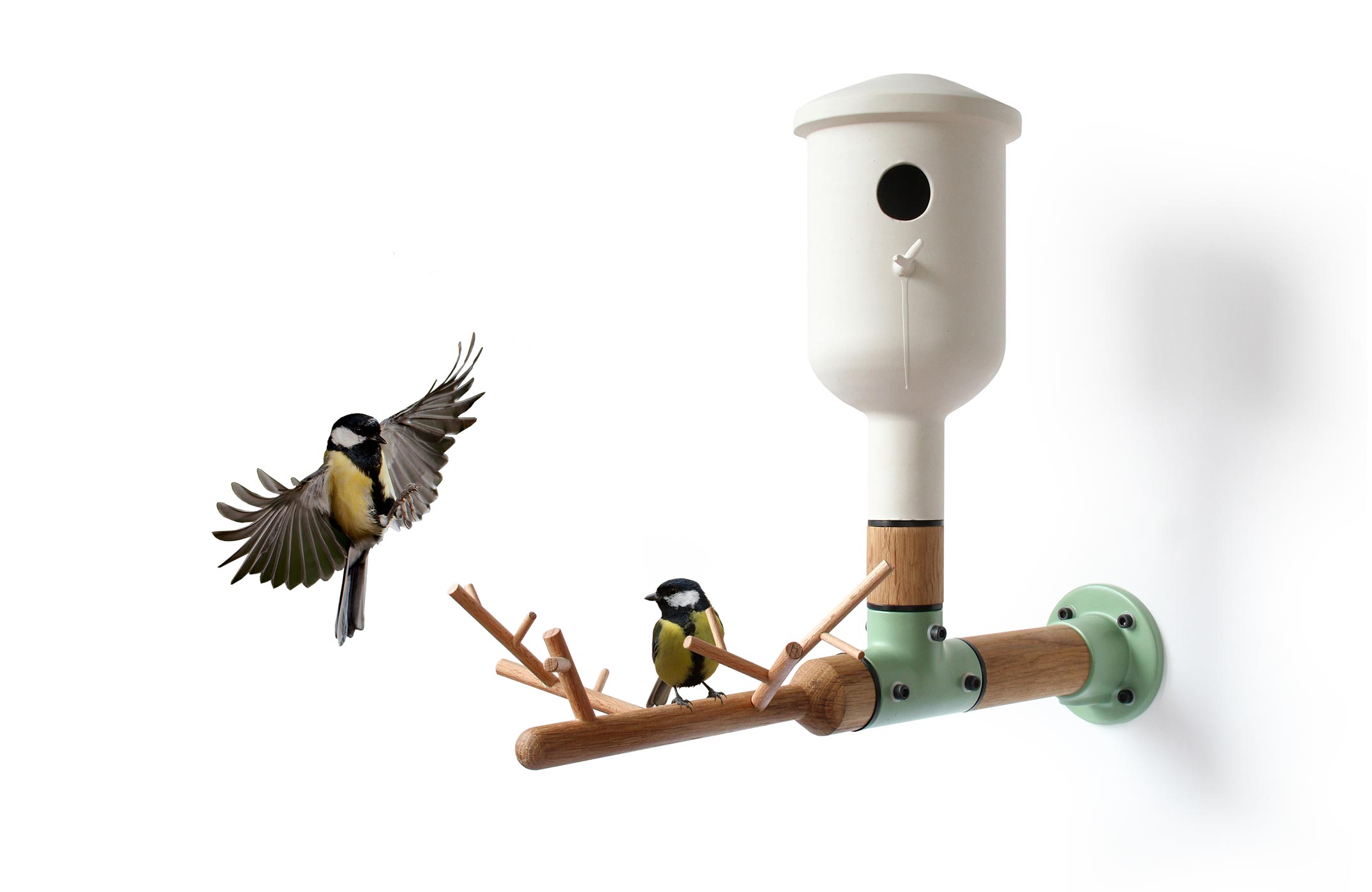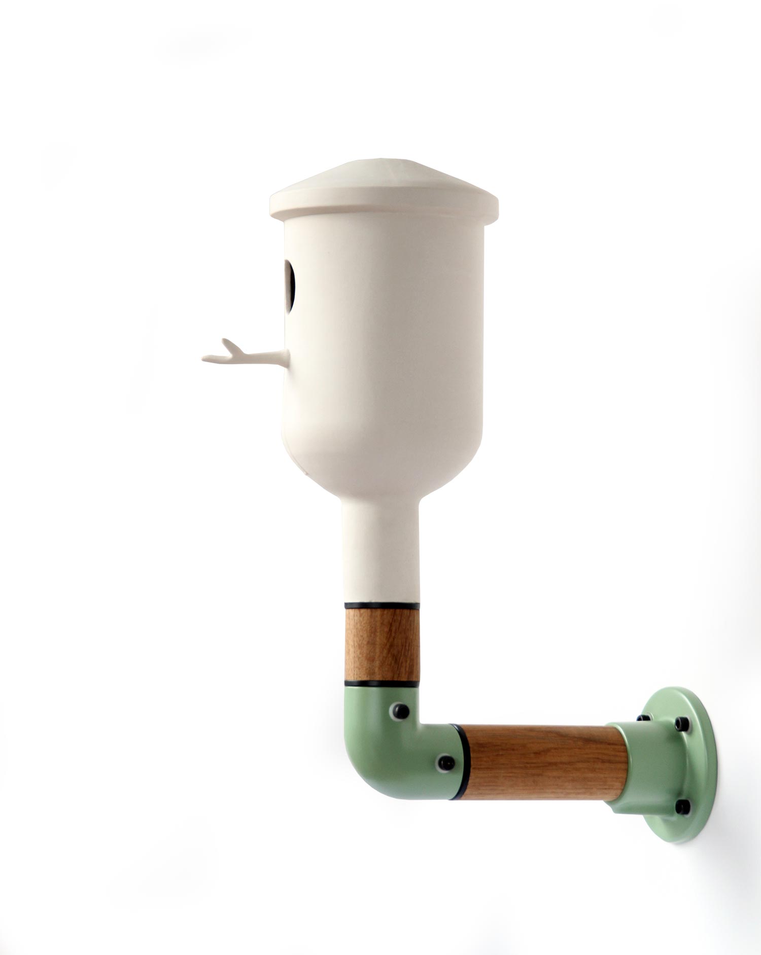 Netherlandian designer Vincent Bos envisions products that can affect the relationship between the urban man and the environment. Made from natural materials like oak and porcelain, a technique the artist picked up in Jingdezhen, his “Wall Elements” collection is a continuation of his environmentally-conscious, user-focused practice. Despite its clean, modern lines, the series of handmade birdhouses was created for outdoor use, with durability and versatility in mind; the modular system can be uniquely assembled to make a garden element for any space, and the sturdy wall mount is suitable for either a wall or fence. The Porcelain Oak Birdhouse and Wood Birdhouse are combined in the final piece, Wall Elements Ceramic Birdhouse, through minimal tree-like forms in a whimsical play on natural imagery. “Designed to bring nature and the elements back to the urban man” so that “birds can have a display spot in the city and in the Vinex districts,” Bos’ playful yet functional outdoor products consider every dimension of user interaction. Get a Wall Elements Birdhouse for yourself – and your birds – here.
