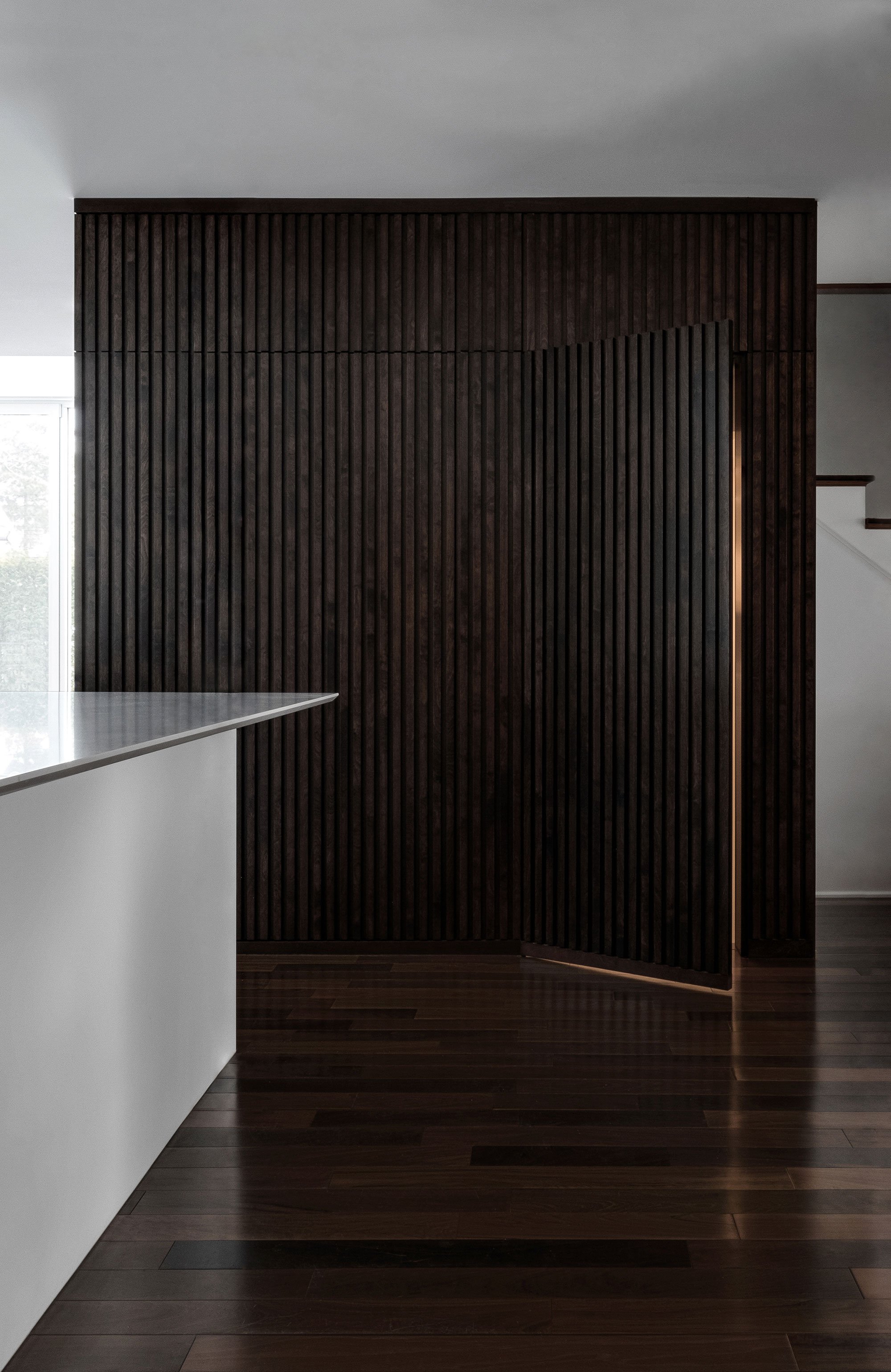 A central wooden volume becomes the central focus of the ground floor and leads to the annex. Completed in walnut wood, the module has a rich brown color. It adds contrast to the light furniture and also mirrors the dark hue of the floor. Beyond the wooded slats, a storage space allows the owners to keep kitchen tools and accessories away from view. Finally, the extension opens up the entire ground level and allows separate spaces to flow one into another, reaching all the way to the backyard. Photographs© Félix Michaud.