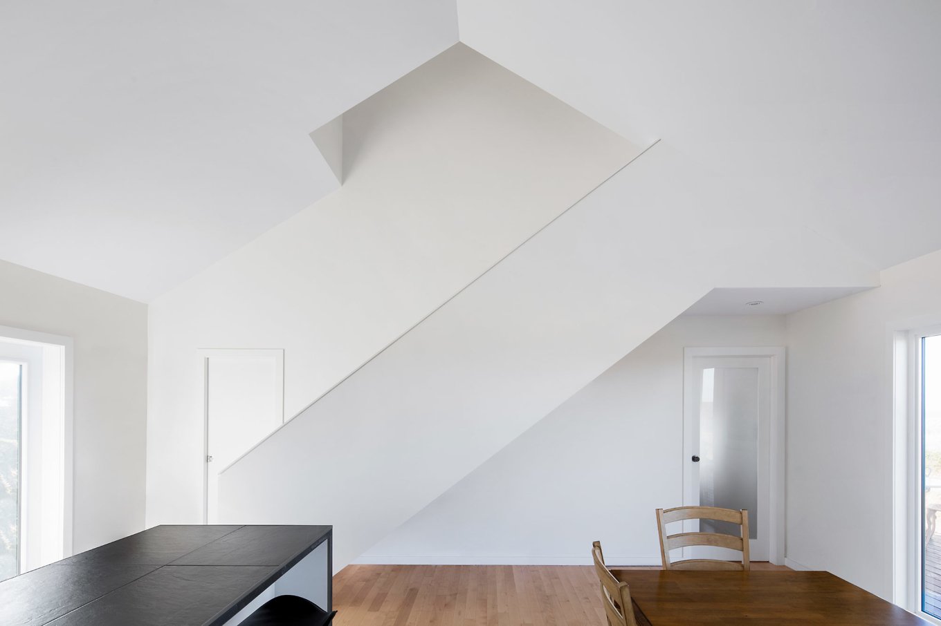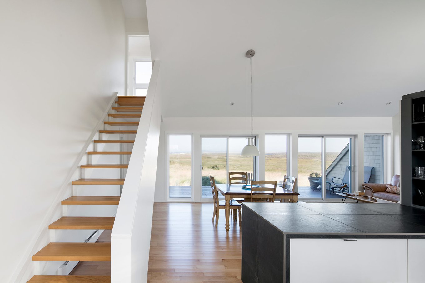 The distinctive shape takes inspiration from wind-swept dunes and local traditional architecture at the same time. The sharply sloping roof and straight sides create the appearance of a stone or sand monolith. Side walls extend towards a deck area to provide a protected outdoor space. Inside, the open-plan ground floor features a cathedral ceiling as well as large windows and a traditional skylight which bathe the interior with natural light. Upstairs, the cantilevered section houses the bedroom where the owners can enjoy the best views of their second home.