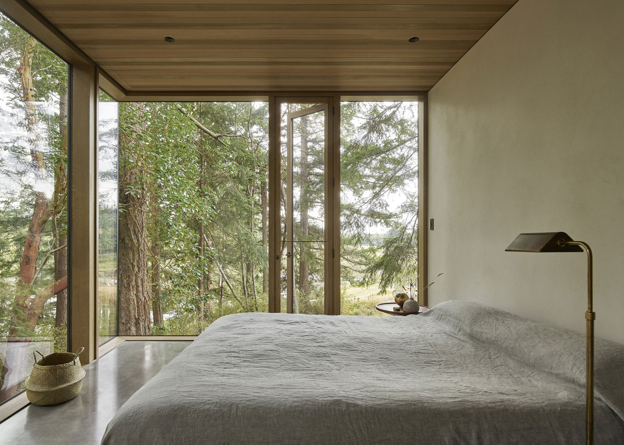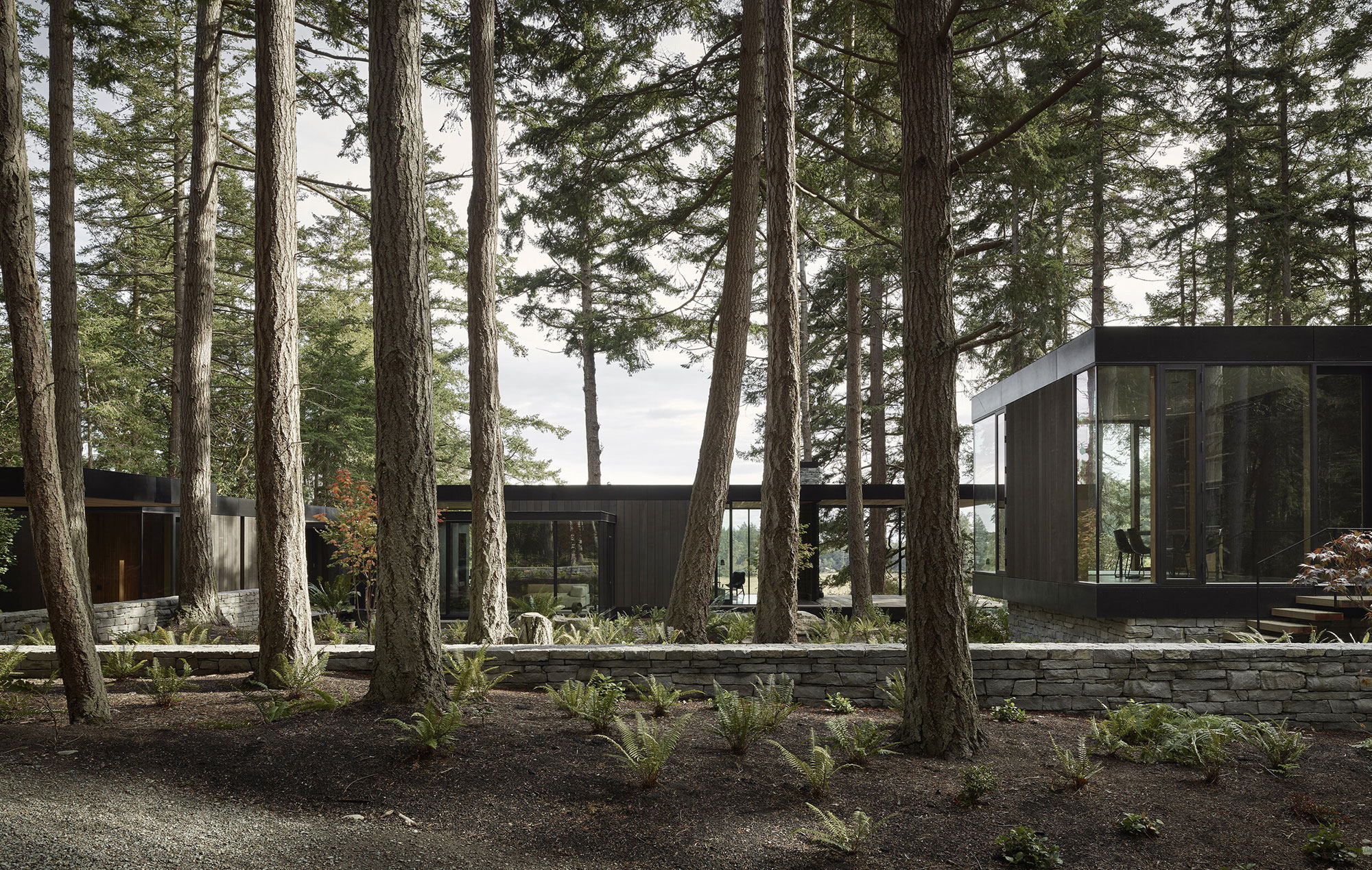 A stone wall links the outdoor area to the interior and adds more texture to the natural material palette. Thanks to the glazed walls, the interior is bright as well as open to the surroundings. Welcoming and warm, Whidbey Farm brings together subtle rustic accents and contemporary touches in a thoughtful design. This project has received the 2019 Honor Award at AIA Northwest and Pacific Region. Photographs© Kevin Scott.