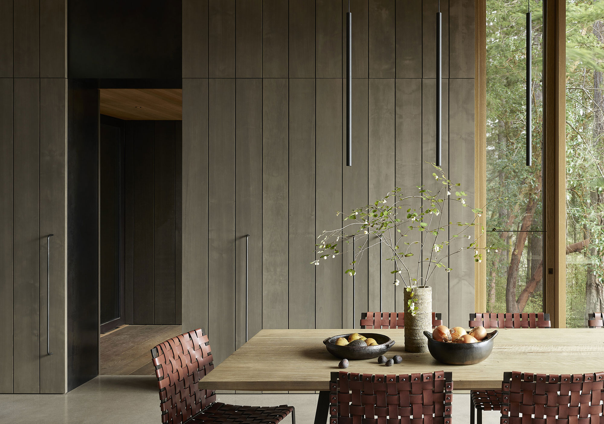 Built on a low hill, the new house offers access to a bucolic panorama with agricultural buildings, cattle fields, a fishing pond, and woodland. Mature fir and cedar trees surround the retreat and blend it into nature further, along with a lush carpet of ferns and grass. The studio designed the house with two volumes and a connecting courtyard. A low wall of locally sourced stone encloses the courtyard. The exterior features a blend of dark wood, black steel accents, and glass, while the interior boasts lighter wood surfaces and concrete.