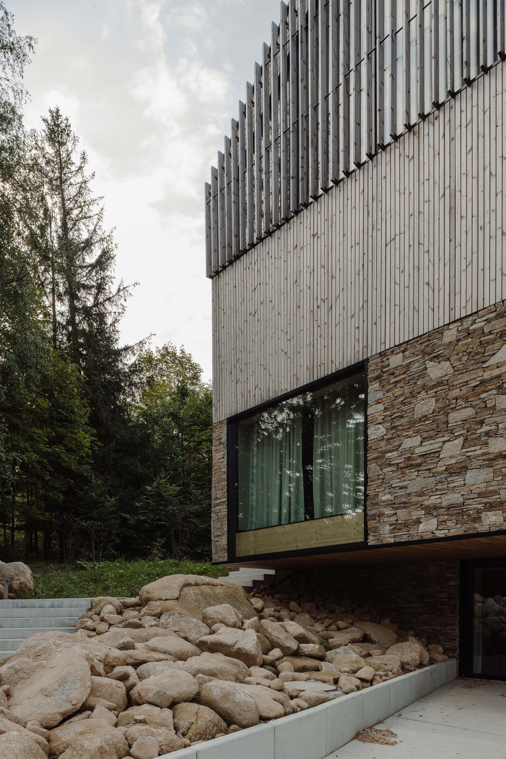 Architecture firm De.Materia has designed two cabins that welcome guests in a gorgeous landscape in Wilcza Poręba, Karpacz, close to the Karkonosze National Park in Poland. Named wilcza for/rest/, the retreat comprises twin buildings that together house fifteen rooms. The studio referenced historic wooden shelters from the Karkonosze Mountains in the design of the identical cabins. As a result, the volumes boast gabled roofs, massive stone plinths and timber cladding. Above the bases, thin vertical planks create an eye-catching pattern while above, wooden slats allow light to filter through in the interiors. The cabins also feature wood boards on the roofs. Full height glazing immerses guests in the surrounding woodland and offers access to views of the mountains.