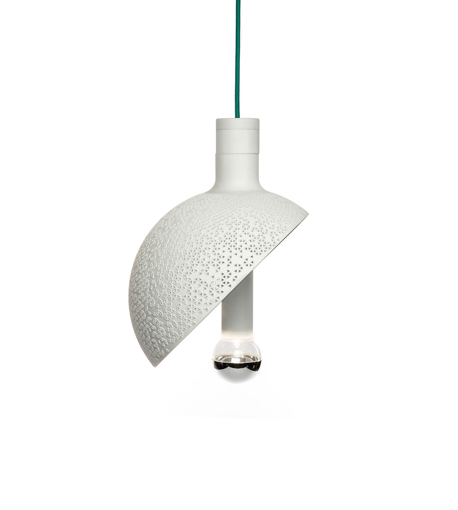 Section Hanging is a contemporary wunderkammer created by the Brooklynite designer Marco Lafiandra for the Trento-based studio .ex  novo. Loosely inspired by Renaissance-era “cabinets of curiosities,” the 3D-printed lighting design is opened up to “the world all around” via a myriad of little “windows” in the lampshade. The semicircular, deconstructed pendant lamp lets curiosity out of the cabinet, bringing mystery to any room. Soft and atmospheric, the lighting design is made of a sintered polyamide diffuser and cap, plus a bronzed stainless steel reflective surface. The lampshade comes in white and hangs from a black or green cord. The design is intended for use with LEDs, and the price is available from .exnovo upon request.